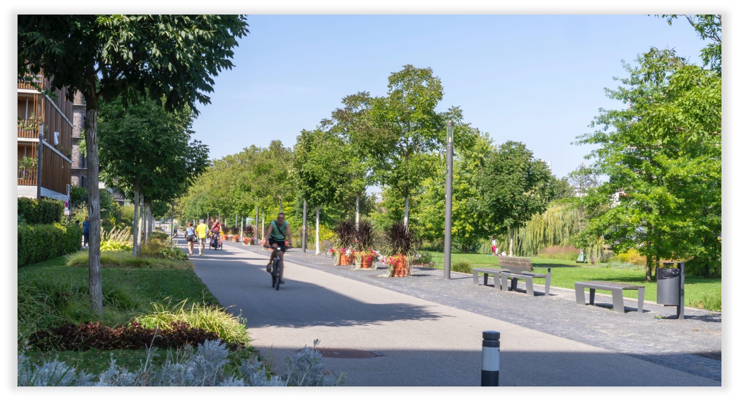 Sustainable Mobility: Neckarbogen’s mobility strategy reduces car dependency through bike paths, pedestrian zones, and shared transport services, promoting healthier lifestyles and lower emissions.