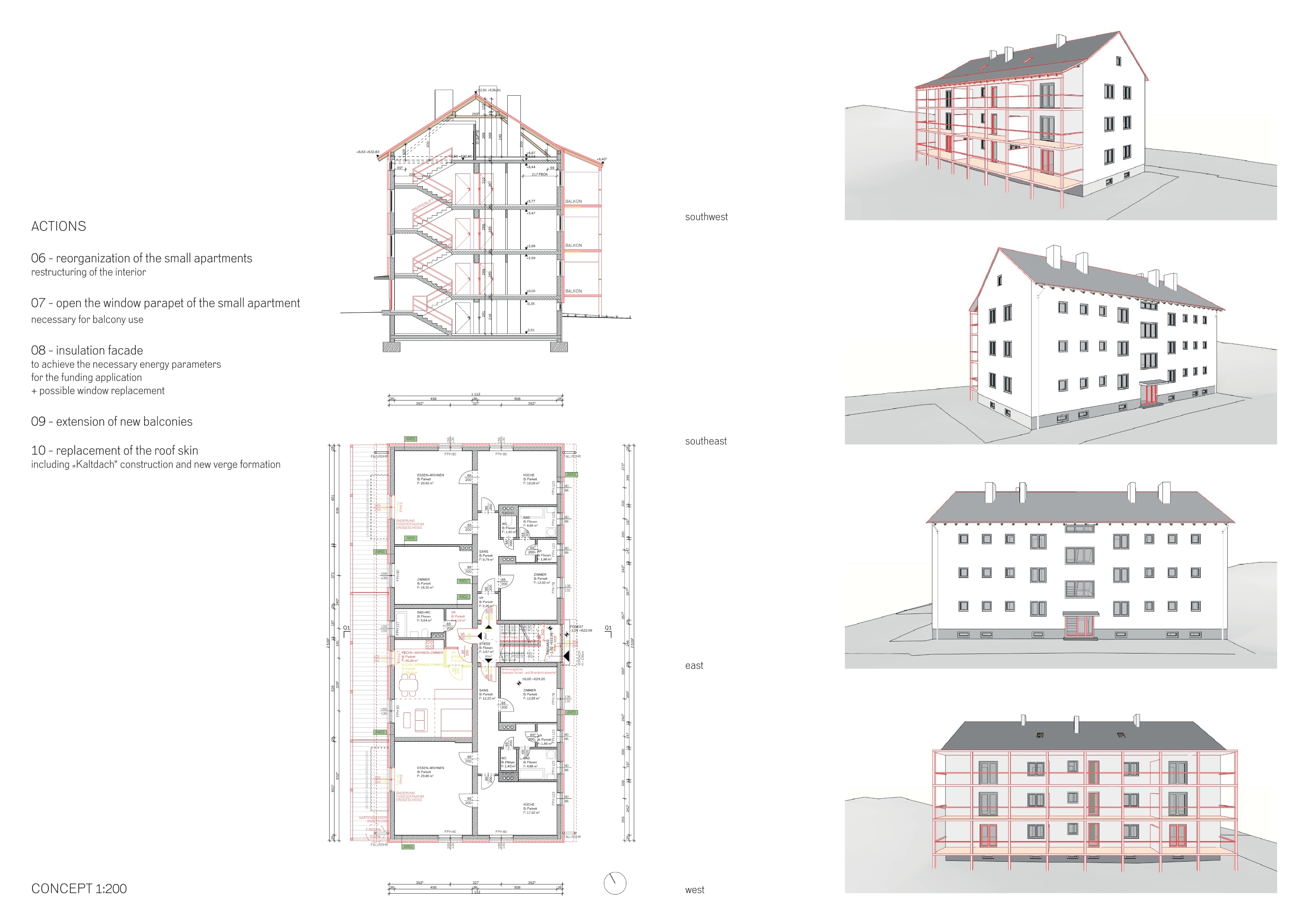 Roofs: Existing roofs will be re-covered, and eaves will be extended as weather protection for balconies. Expanding the existing dormers will allow for the extension of interior spaces and the creation of new balconies. These measures also contribute to an attractive and modern appearance of the buildings.