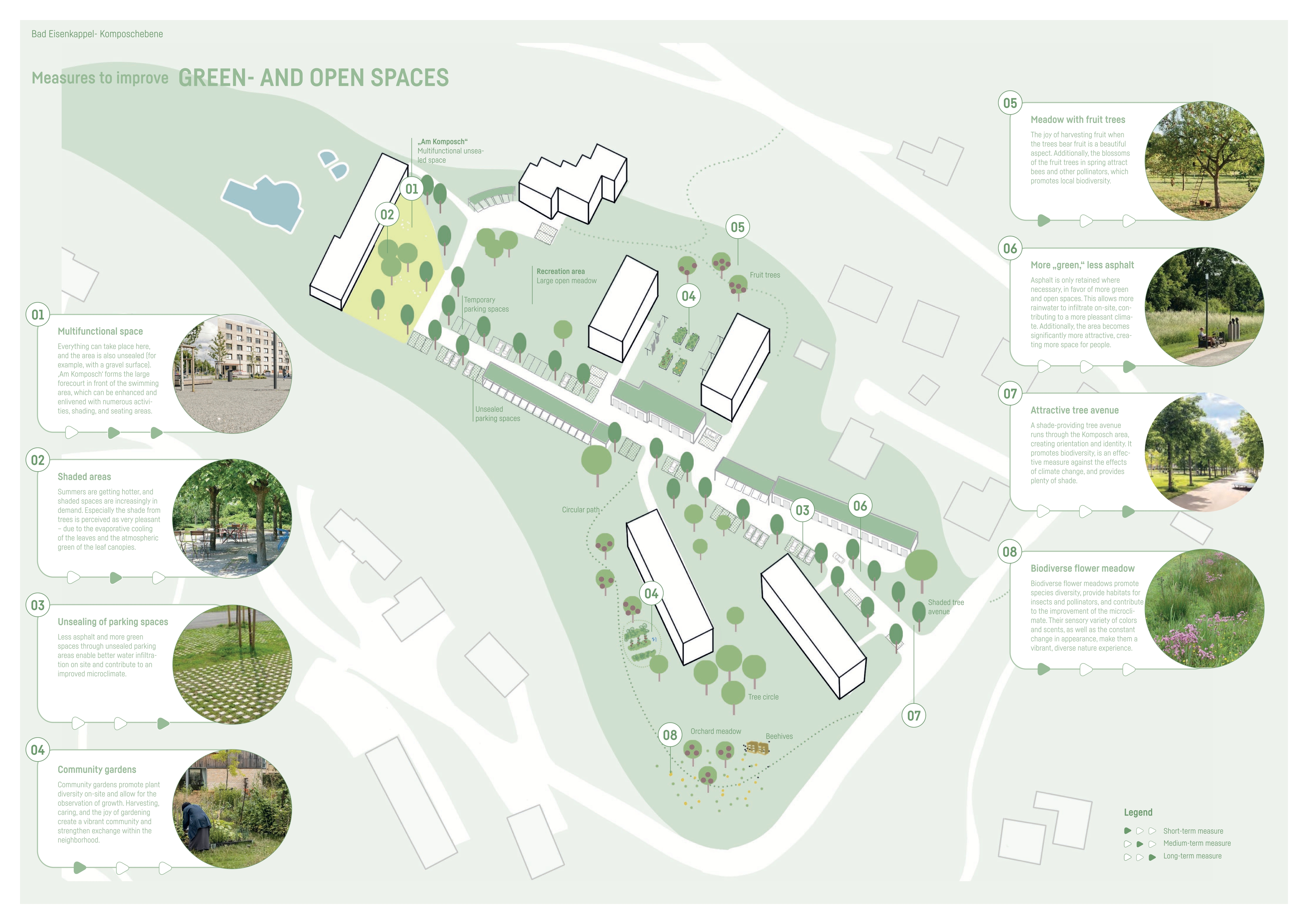 Landscaping: A central aspect of the redesign is a resource-conserving implementation close to the existing buildings, which preserves and further develops existing qualities. Many measures can be implemented quickly and cost-effectively, while medium and long-term projects will enhance the area in the long term.