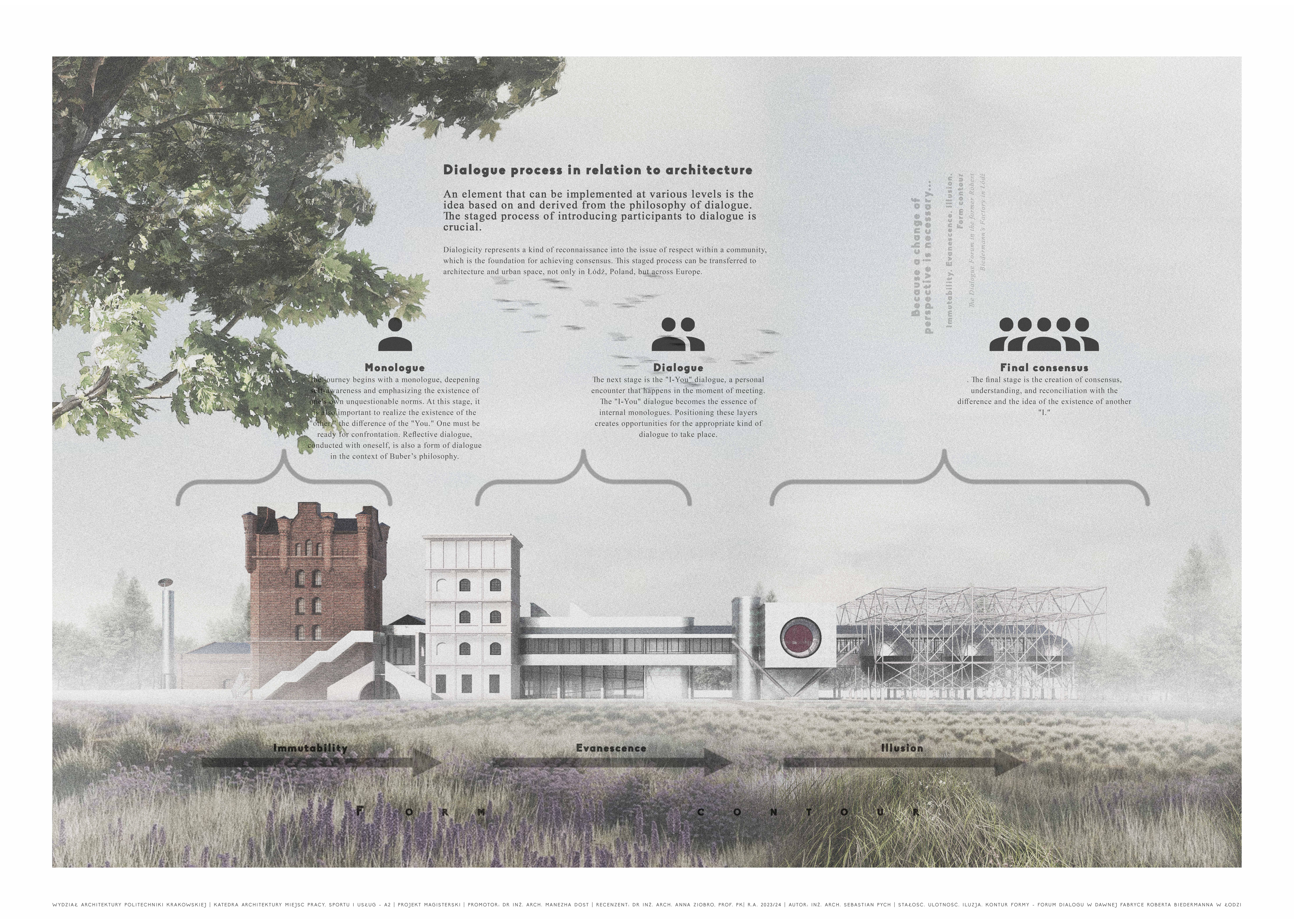 An element that can be implemented at various levels is the idea based on and derived from the philosophy of dialogue. The staged process of introducing participants to dialogue is crucial. The journey begins with a monologue, deepening self-awareness and emphasizing the existence of one's own unquestionable norms. At this stage, it is also important to realize the existence of the "other," the difference of the "You." One must be ready for confrontation. Reflective dialogue, conducted with oneself, is also a form of dialogue in the context of Buber’s philosophy. The next stage is the "I-You" dialogue, a personal encounter that happens in the moment of meeting. The "I-You" dialogue becomes the essence of internal monologues. Positioning these layers creates opportunities for the appropriate kind of dialogue to take place. The final stage is the creation of consensus, understanding, and reconciliation with the difference and the idea of the existence of another "I." Dialogicity represents a kind of reconnaissance into the issue of respect within a community, which is the foundation for achieving consensus. This staged process can be transferred to architecture and urban space, not only in Łódź, Poland, but across Europe.