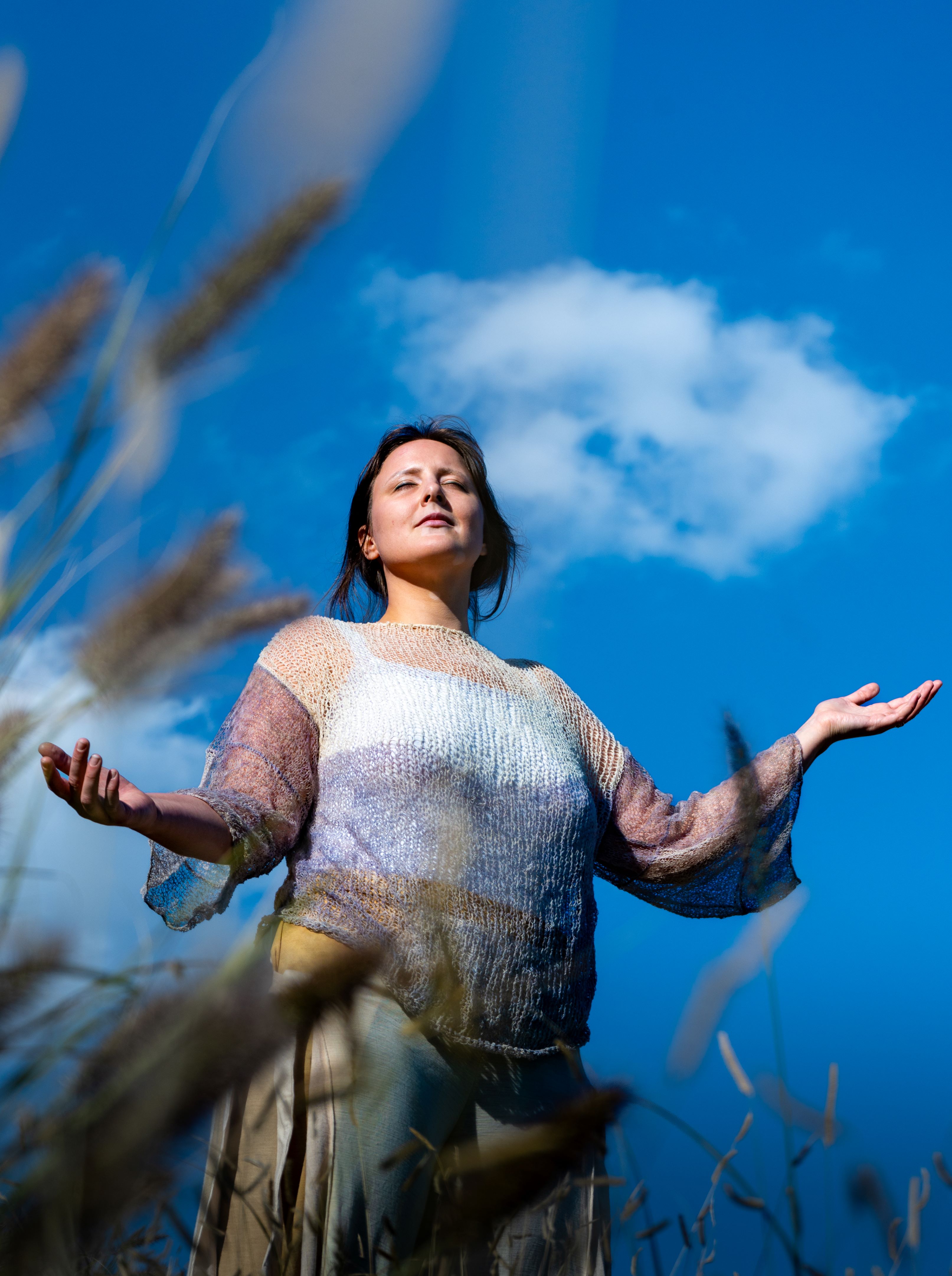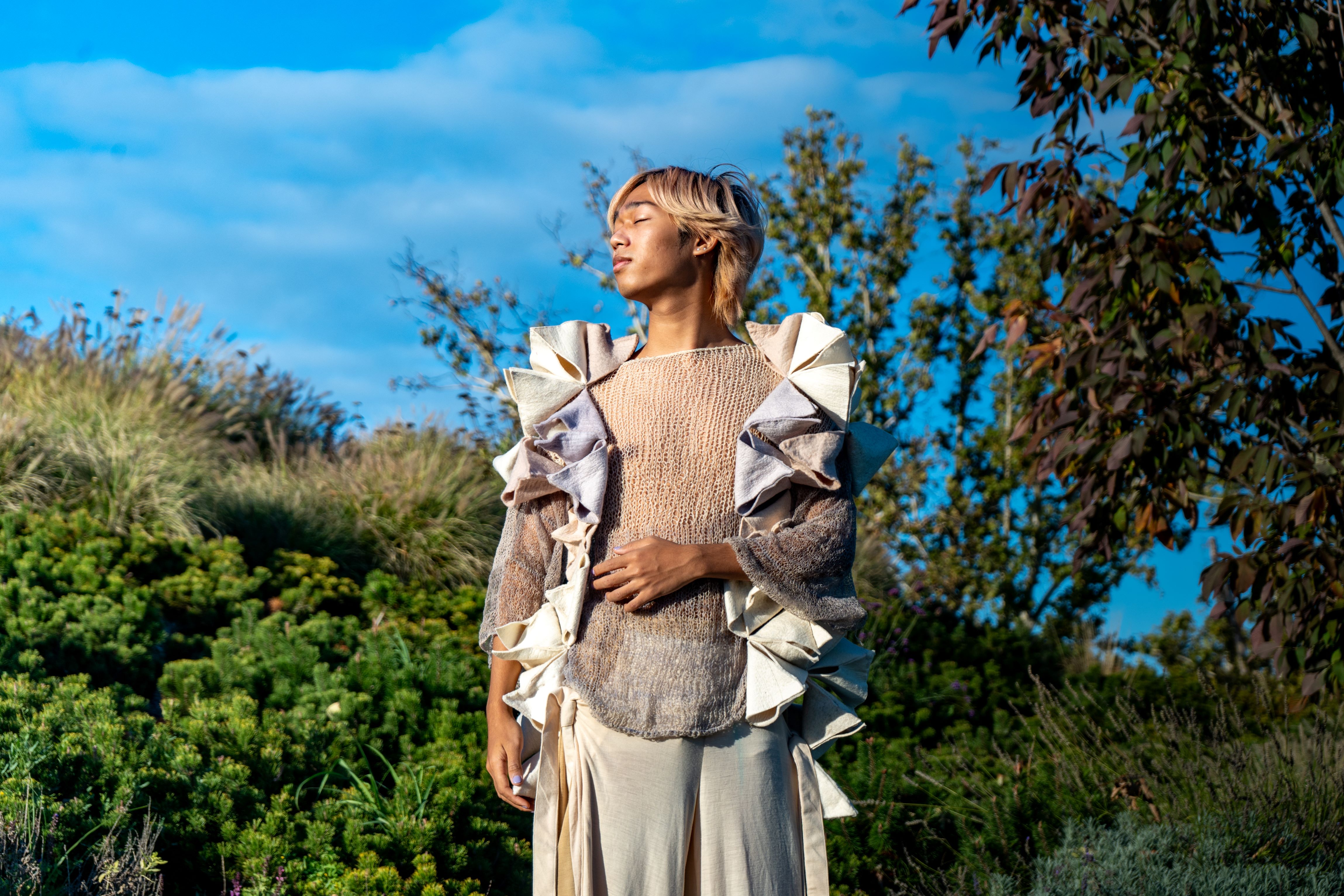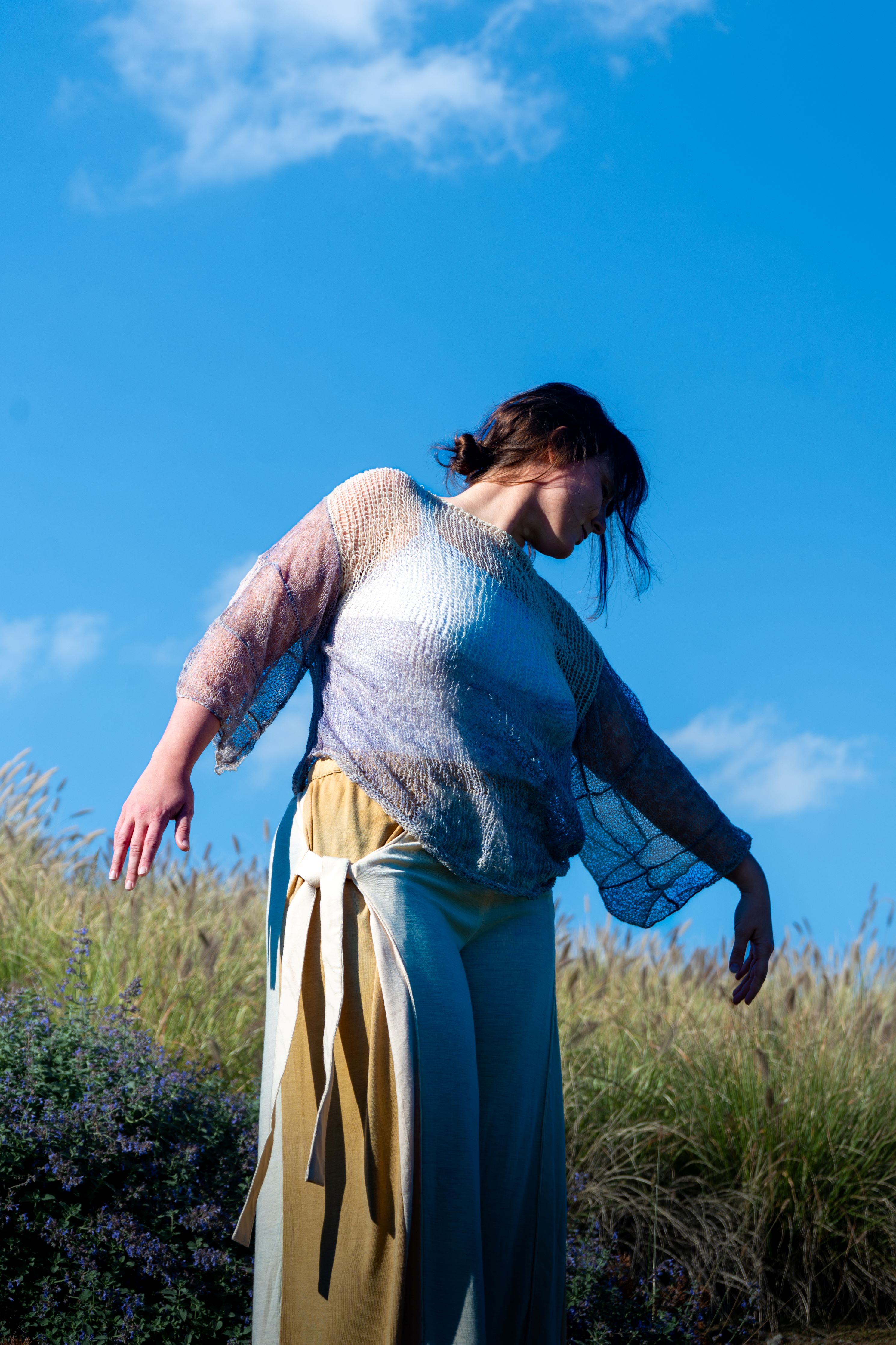 The deliberate choice of knitted materials, fine soft wool, felt, and strong knit aimed to create a unique aesthetic. The felted jacket with pyramids symbolises the future and the power of many, representing the microorganisms used to colour the wool. The meticulously finely hand knitted top is a reference to human vulnerability, and the transparency is a playing with the idea of gender identity. The pants are playful and as all pieces one size fits all.