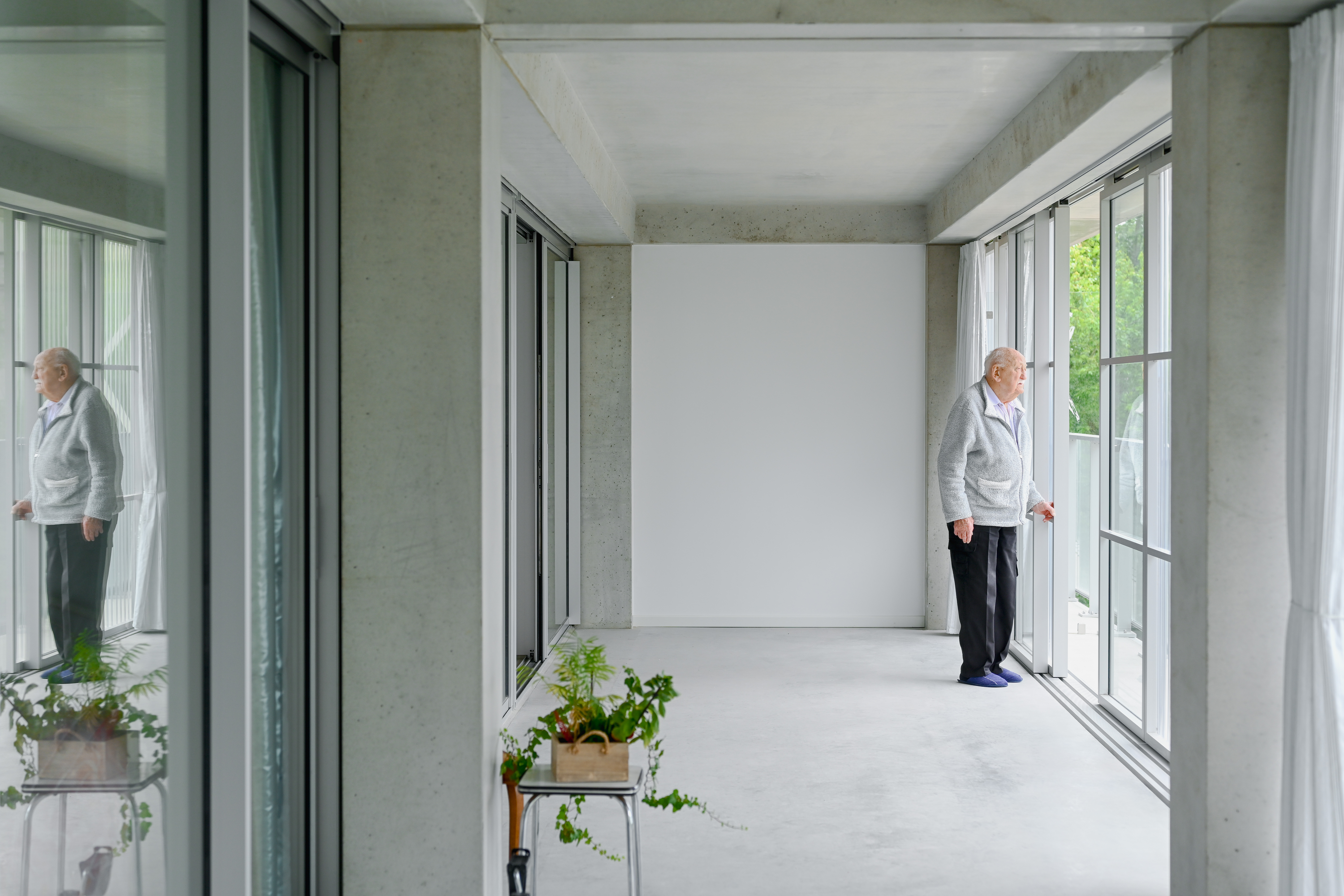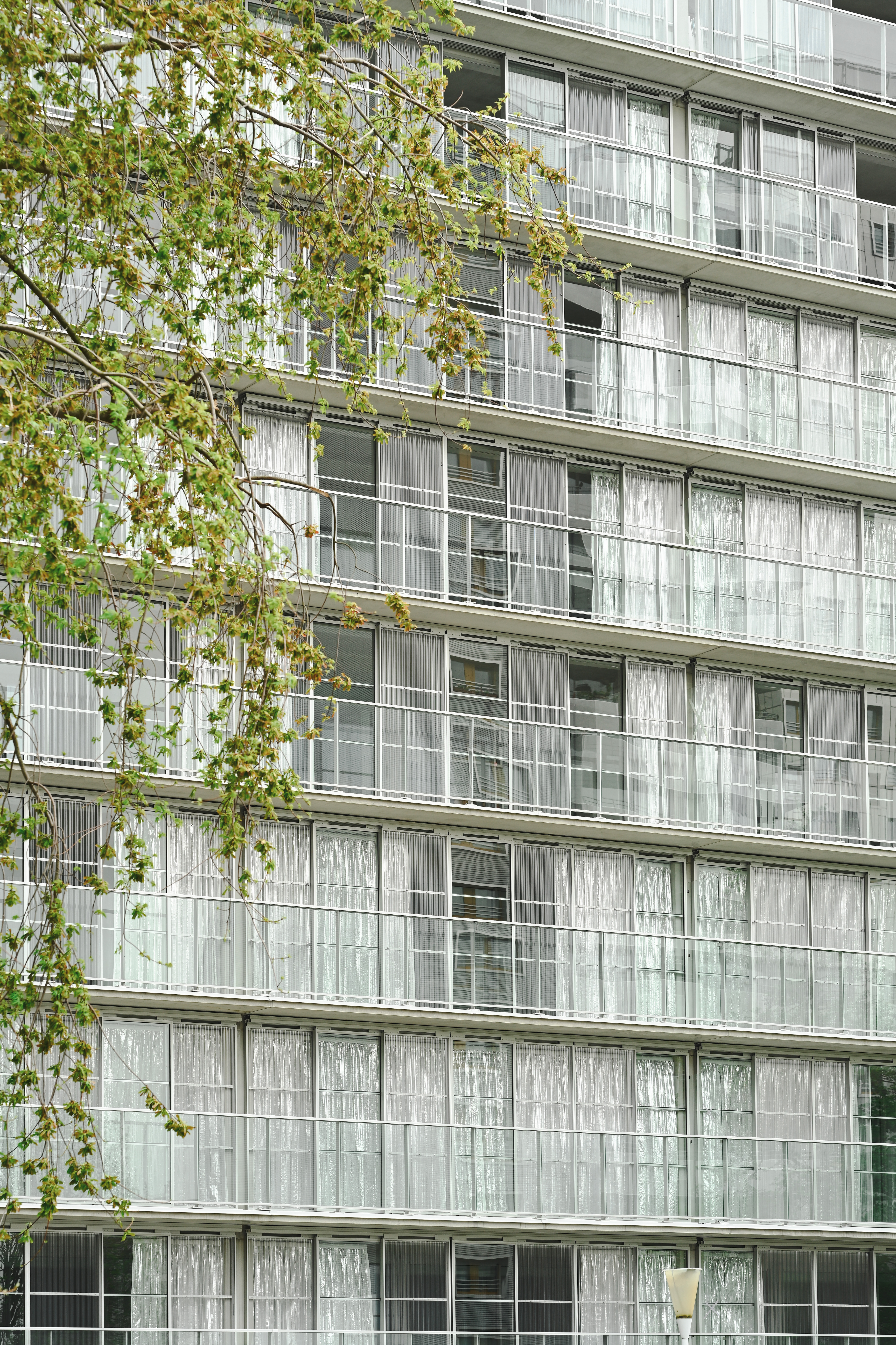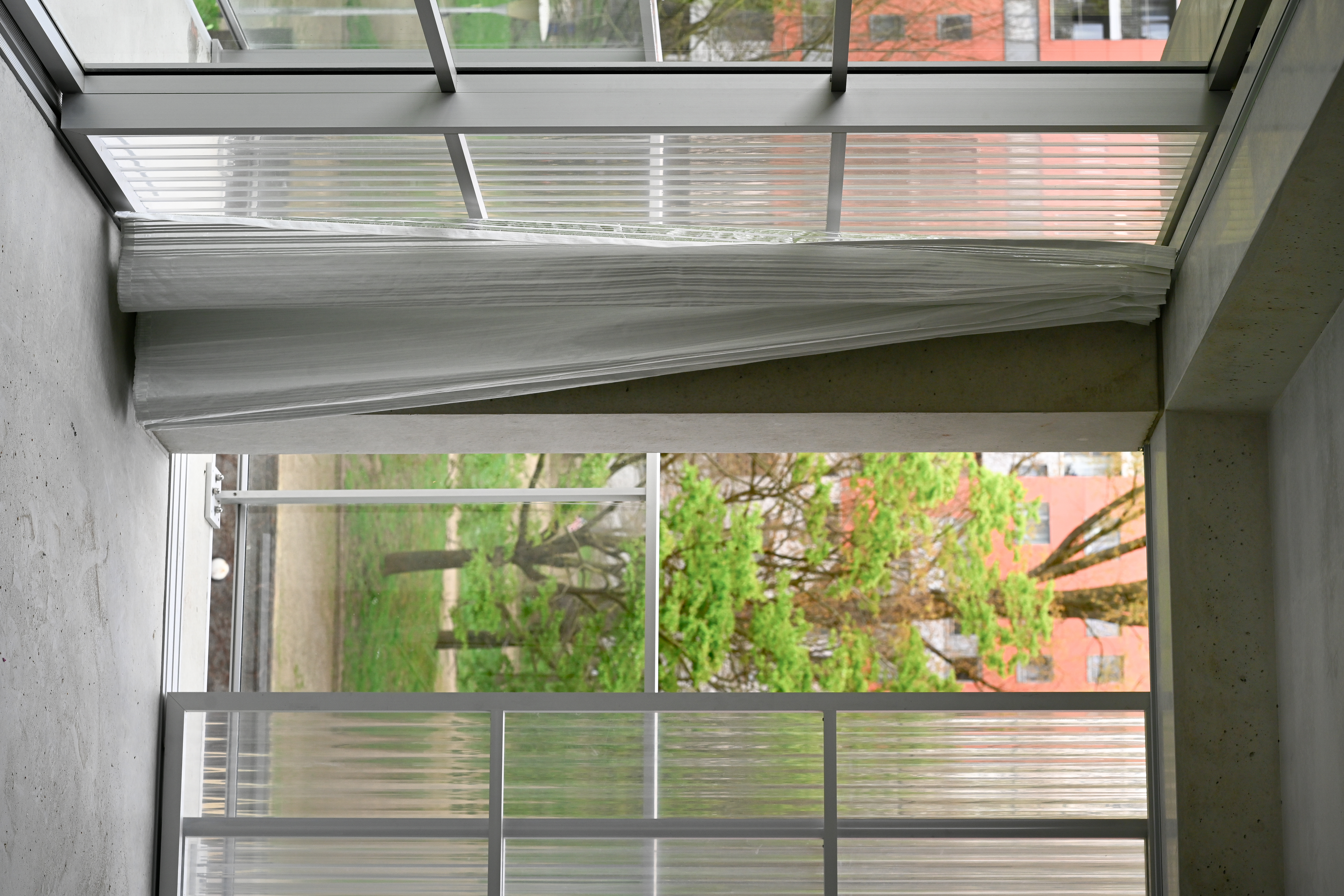On a level of the living unit, we used the structure of the building which had an open façade arrangement but very closed frameworks, to open up maximum towards de wintergarden. By keeping the concrete structure as light as possible, we made sure light reflection and transmission through the structure into the interior of the building was kept optimal. The glazed balustrade and transparent/translucent wintergarden edge works together with the inside to provide as open a vista as possible. In a counter direction, we also took care to provide enough ways to ensure privacy and intimacy: thick, insulated curtains on the inside provide a way to control privacy, introduce a feeling of comfort and intimacy indoors. The balance between transparent and translucent panels together with greenhouse curtains, does the same on the level of the wintergarden.