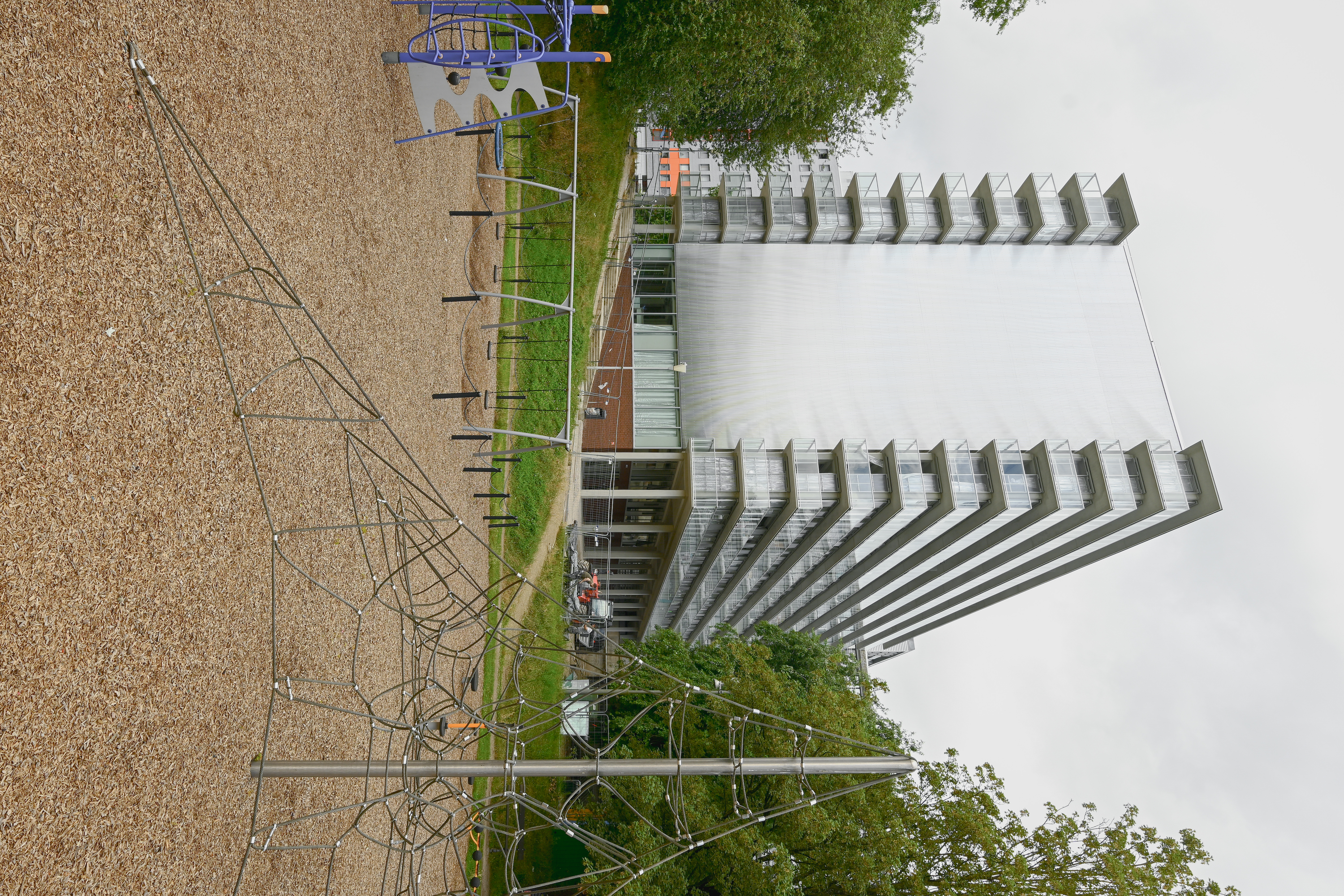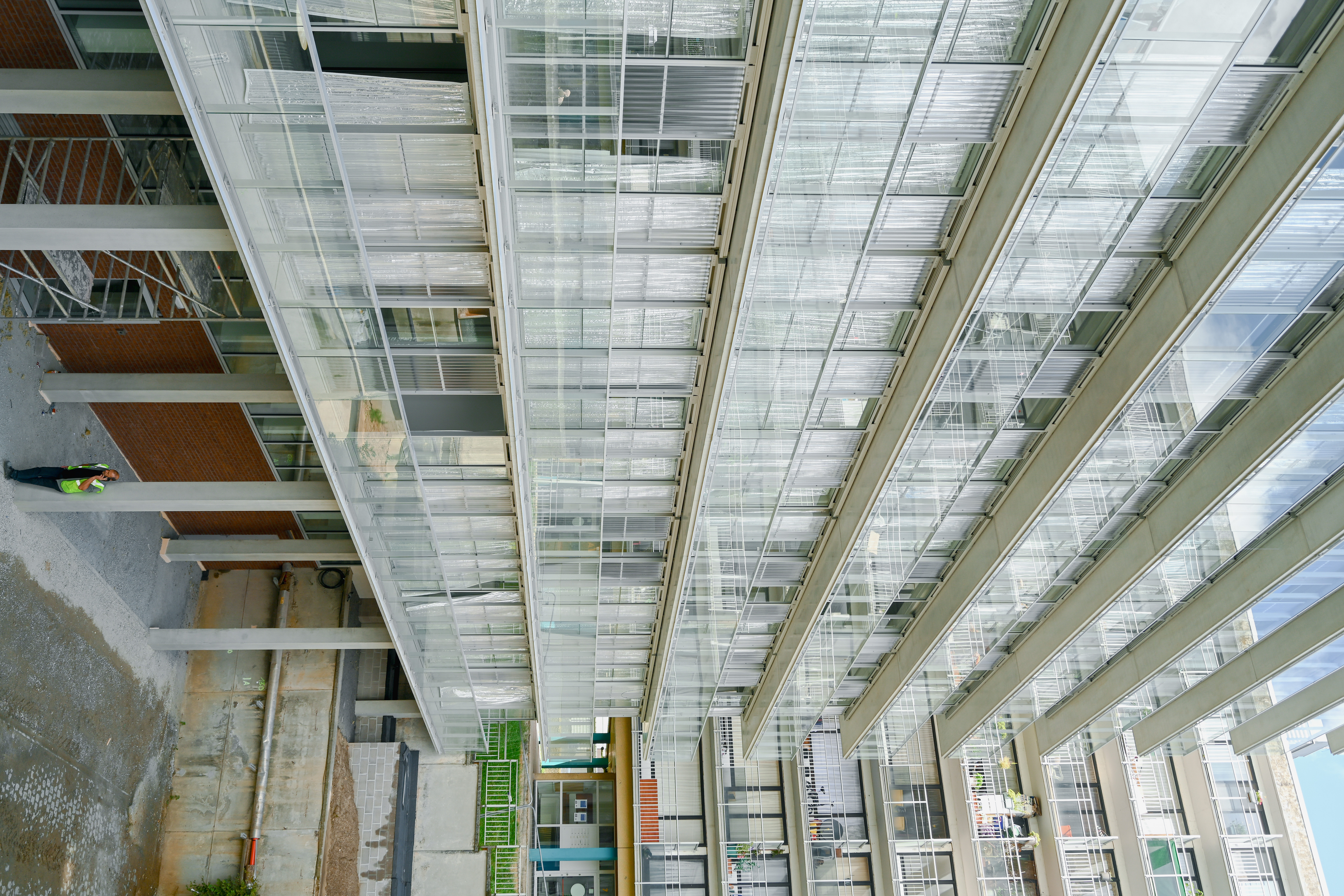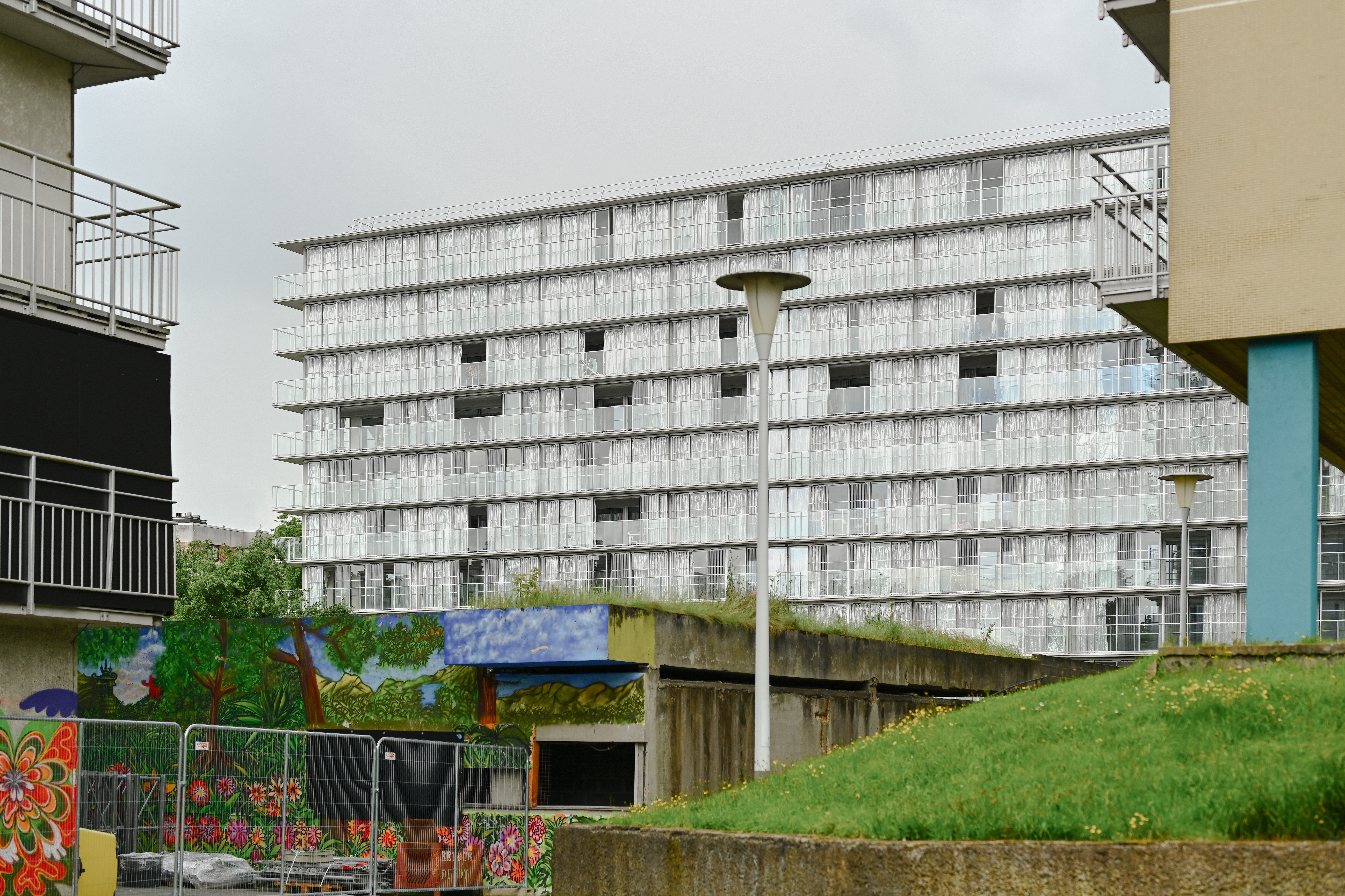 On a level of the building and the neighbourhood, two aspects are important. (1) the radical openness of the ground floor: it provides a visibility from and to the neighbourhood. It houses the offices of janitors of multiple buildings, a social antenna for the neighbourhood, a pharmacy and hopefully soon also again a small general store. (2) the simplicity but also reintroduced clear identity for the building in the neighbourhood. By combining the wintergarden structure with a simple and bright cladding for the short facades, the building resembles its former self but with a new fresh image.