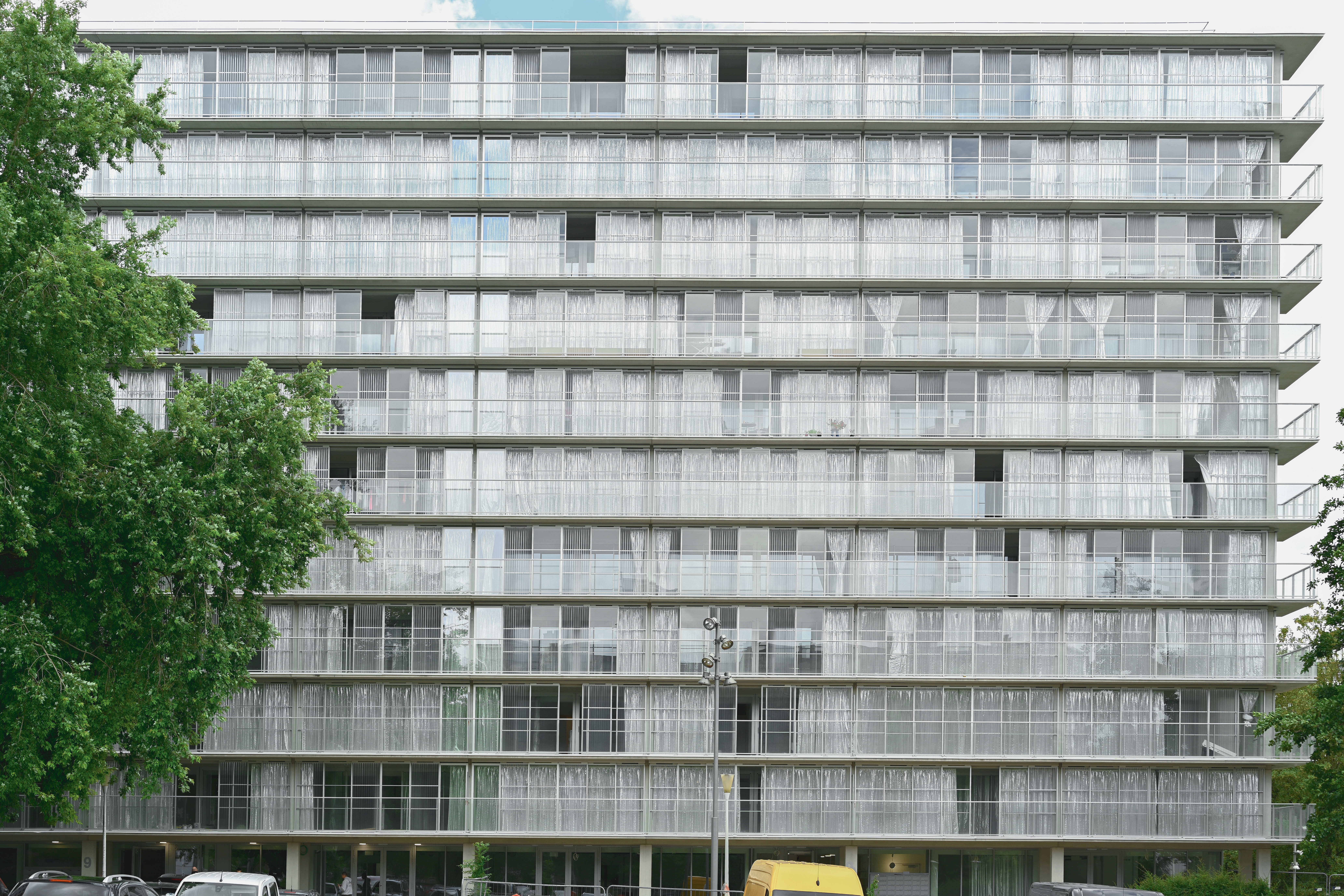 The result is a building that keeps true to the architecture of its former self - but making more clear its build-up of a closed pedestal, transparent social ground floor and generic 10-floor apartment volume. This renovation was also a test-case to see if this type of 70s housing tower with mono-oriented apartments could be systematically renovated with limited social impact on the inhabitants, by operating from the outside and providing upgraded living quality at the end of the process.