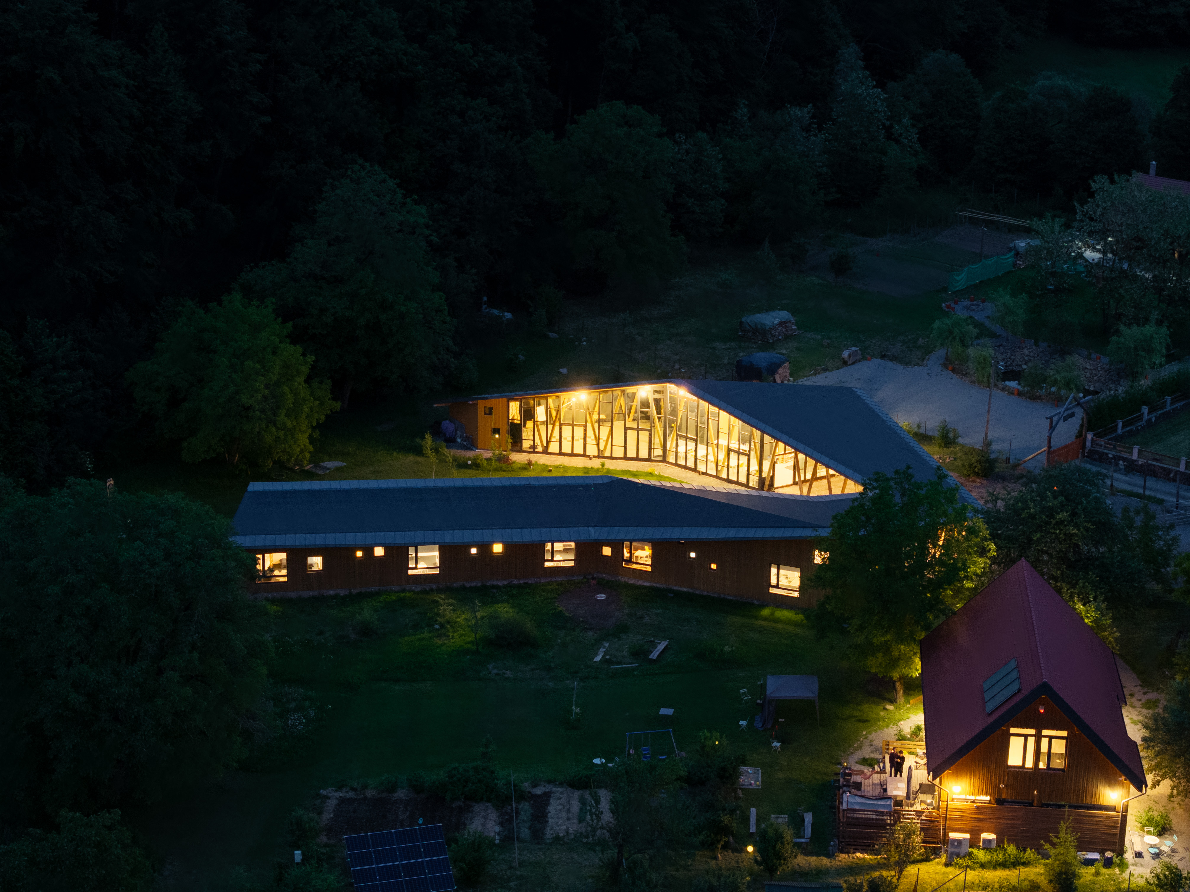 In early 2018, Stuttgart-based Scottish architect Alex Whitton was contracted to design the camp building. He developed a practical, beautiful, and environmentally conscious compact, multi-modular concept that uses architecture as a catalyst for exploring the themes incorporated into the program. He finalized the plans at the end of 2018, and construction began in 2020, after obtaining the necessary permits from local authorities. Since tranzit.ro/Cluj was not abandoned by Erste Stiftung and continued to receive funding, the four initiators registered the Hypha_etc Association in May 2023, ensuring the long-term management and operation of the site’s programs.