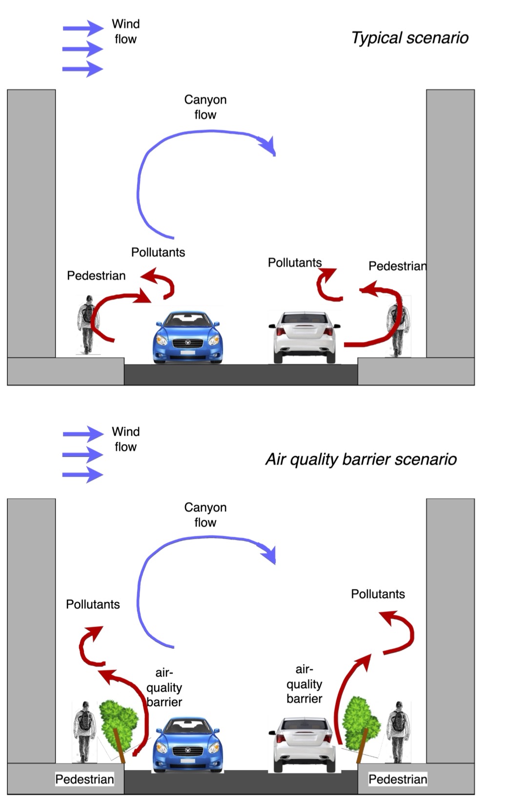 aerodynamically controls the transport of pollutants from the road to the sidewalk without requiring any energy consumption. The optimal solution was found to be a fully vegetative barrier (no planter above road level). The experimental testing of the barrier takes into account wind flows in urban environments that are partly responsible for the transport of pollutants (along with diffusion). In terms of function the barrier only requires appropriate foliage shape to maintain key aerodynamic dimensions. In addition, the species used for vegetation can be chosen depending on location. For a mediterranean climate, the species Genista Hispanica was found to be suitable. This ensures minimal watering requirements given the limited annual
