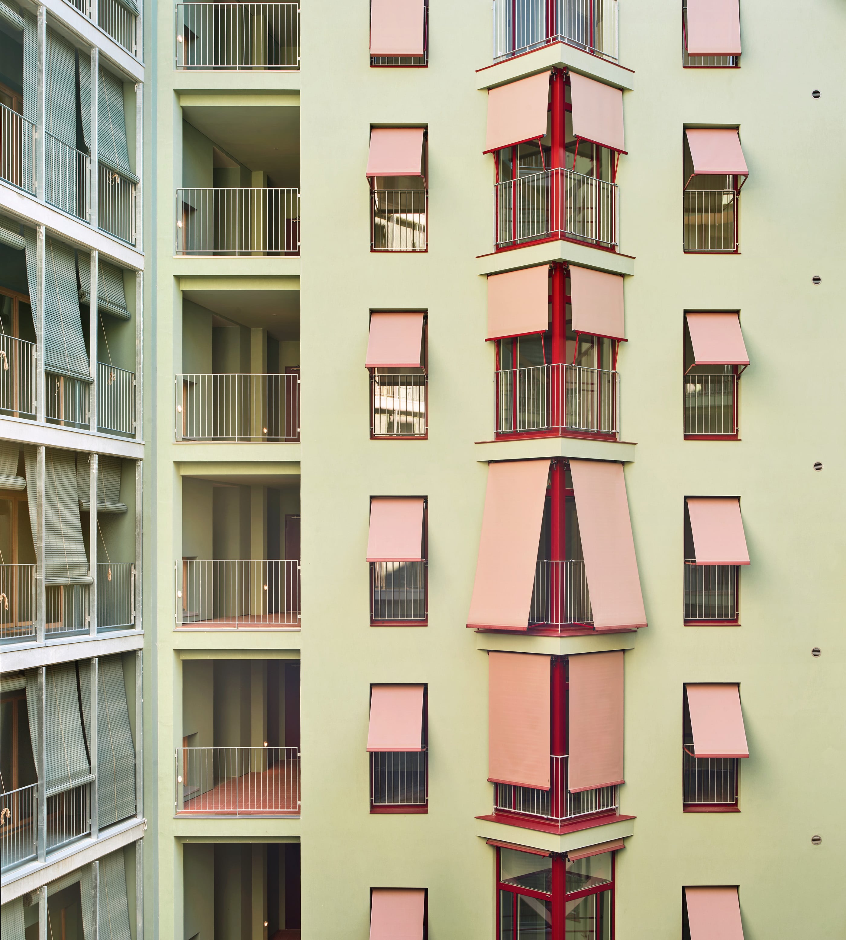 Inside, the apartments feature interconnected rooms and hinged spaces, with a central room as the home’s heart, connecting every area. Strategically placed hinged spaces at intersections enhance physical and visual connections, creating independent rooms that flexibly extend the home. Placing the kitchen and laundry in these hinged spaces highlights domestic tasks and promotes a gender-sensitive approach to the home.
