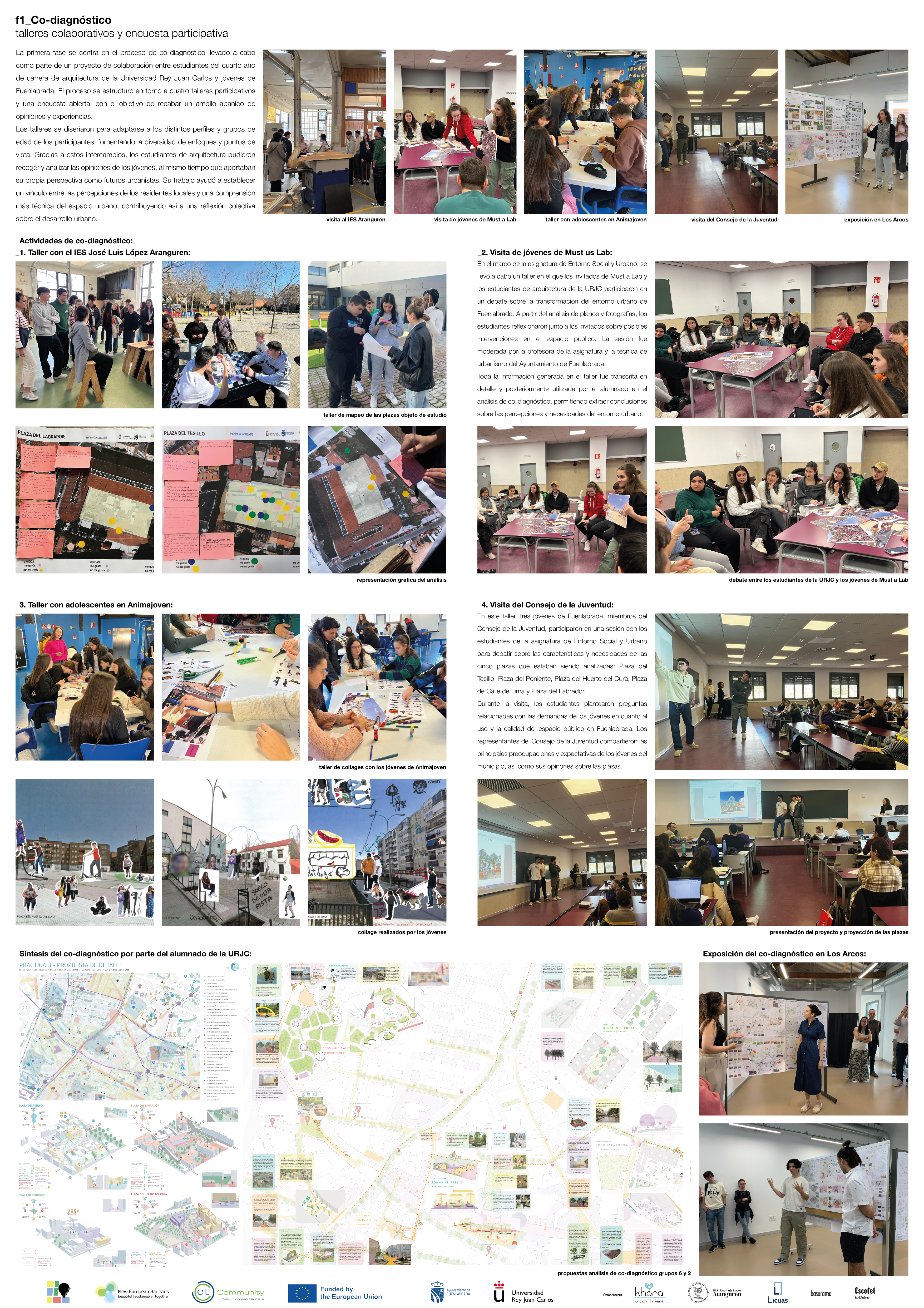 The project was led by the City Council of Fuenlabrada (Departments of Urban Planning, Circular Economy, Children and Youth, and Education) in collaboration with Rey Juan Carlos University (Urban Planning degree). The active involvement of young citizens was essential in revitalizing plazas that were no longer used by this age group, following NEB criteria. The project followed a structured work plan with four key phases (Co-Diagnosis, Co-Design, Prototyping, and M&E), supported by a transversal coordination activity.