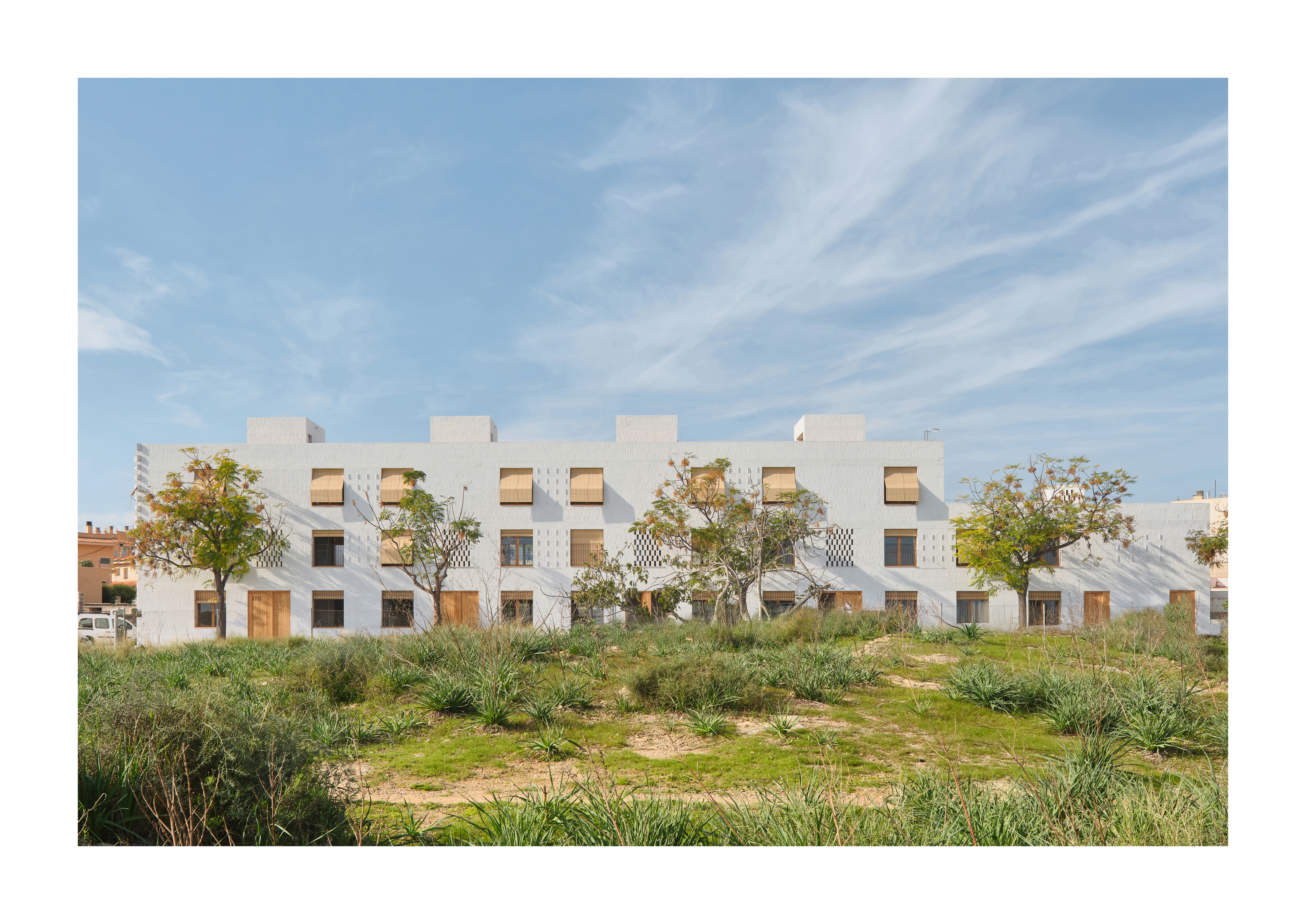 Eleven climate-responsive homes in Palma blend vernacular architecture with sustainability, using passive design to ensure cross-ventilation, natural light, and thermal comfort. Their flexible layouts maximize usability, while locally sourced materials and prefabrication minimize environmental impact. With drainable gardens and native vegetation enhancing resilience, this social housing project becomes a model of circular economy and adaptive, climate-conscious design.