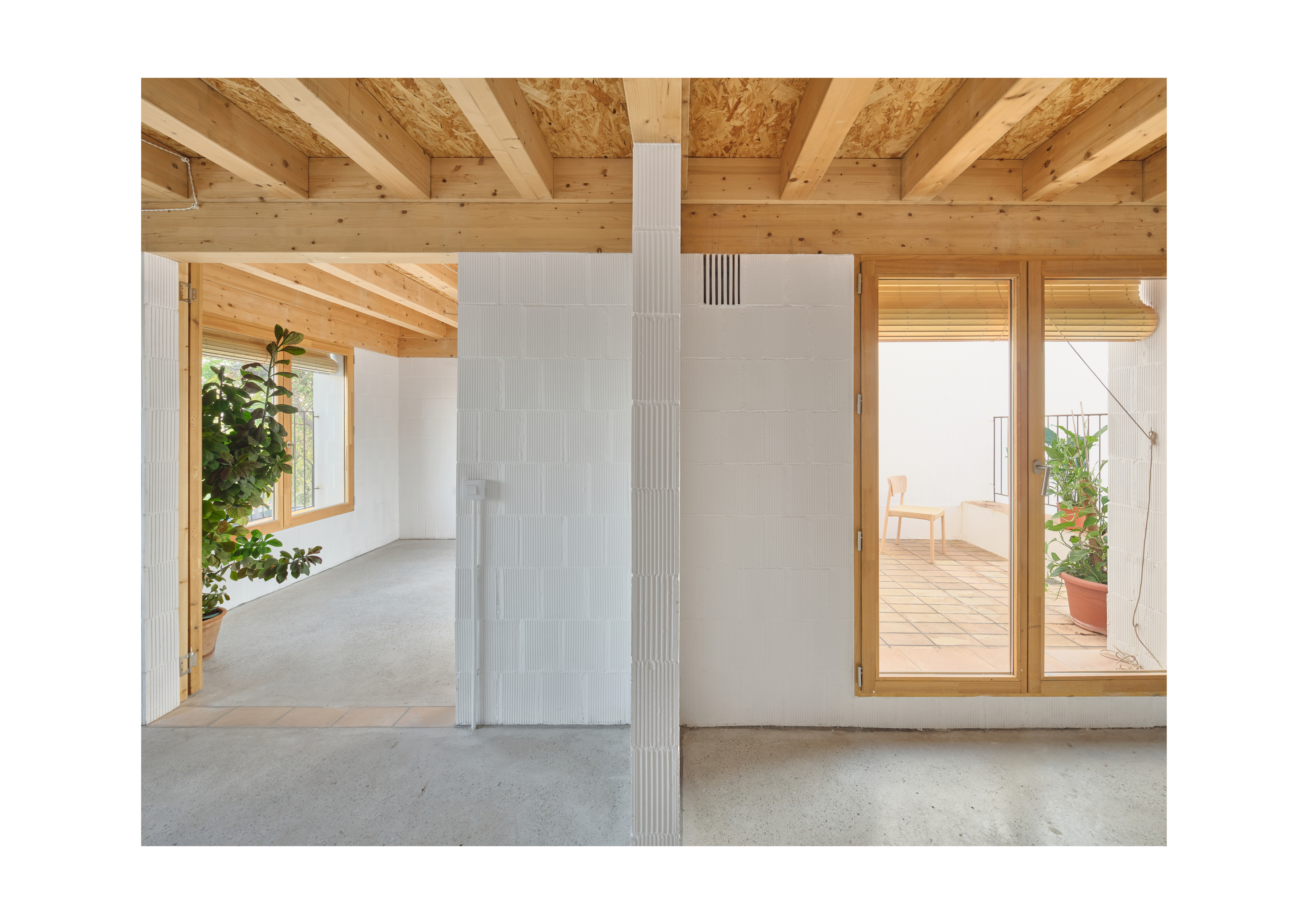 Sustainability is prioritized through various passive design strategies, reducing the ecological footprint of the project. Cross-ventilation is ensured through carefully positioned openings and skylights, reducing the need for artificial cooling. The west-facing façade incorporates setbacks that provide natural shading, while the use of permeable gardens minimizes urban heat island effects. Water-efficient landscaping with native plants reduces irrigation demand. Materials were selected based on proximity, durability, and recyclability, including locally sourced ceramic blocks and laminated timber structures, ensuring high thermal inertia and reducing embodied carbon.