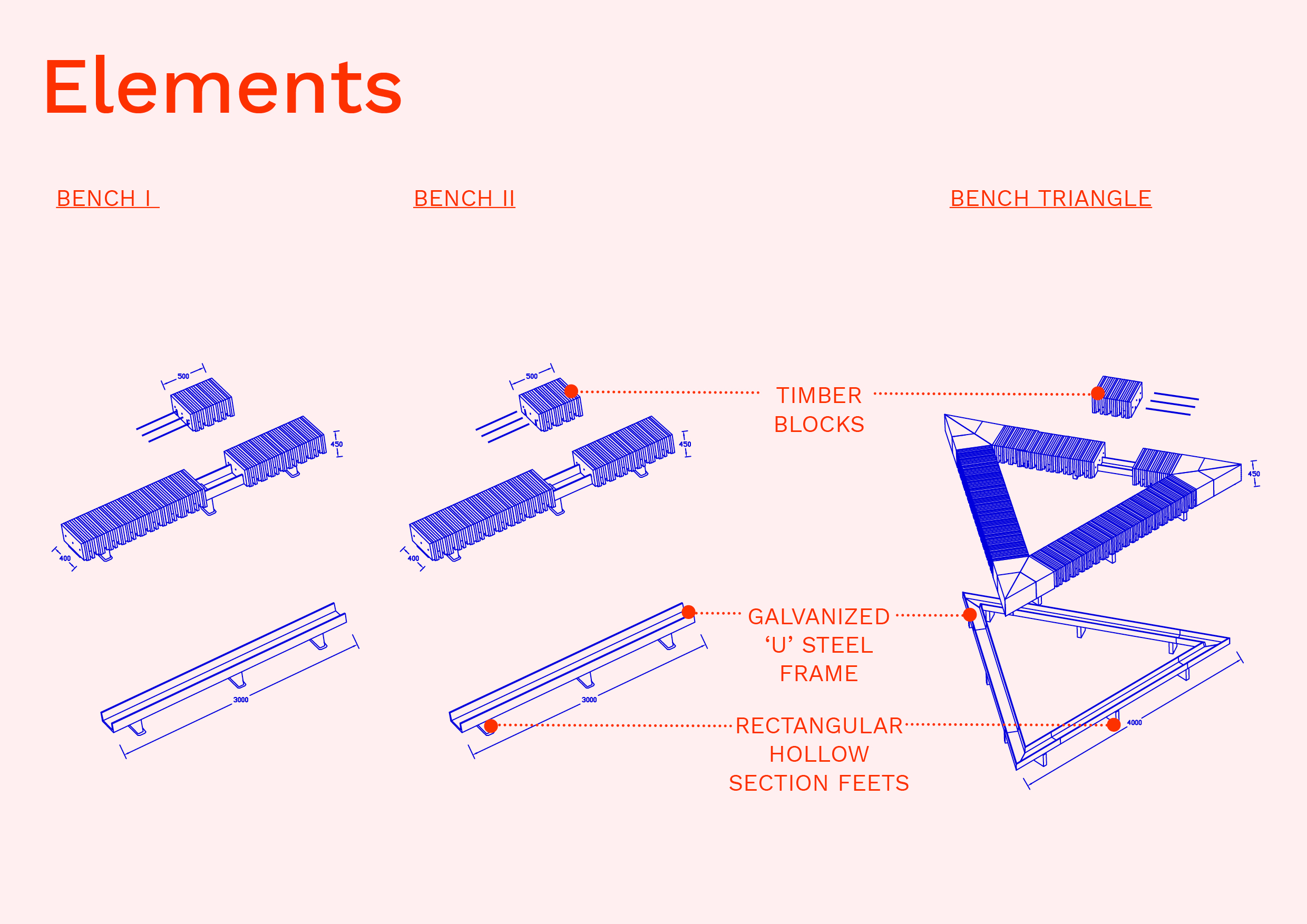 As outdoor timber structures have limited durability, the design puts high emphasis on modularity. The wood waste is going to be assembled into specifically designed individual blocks that can easily be replaced in case of erosion or malfunction.