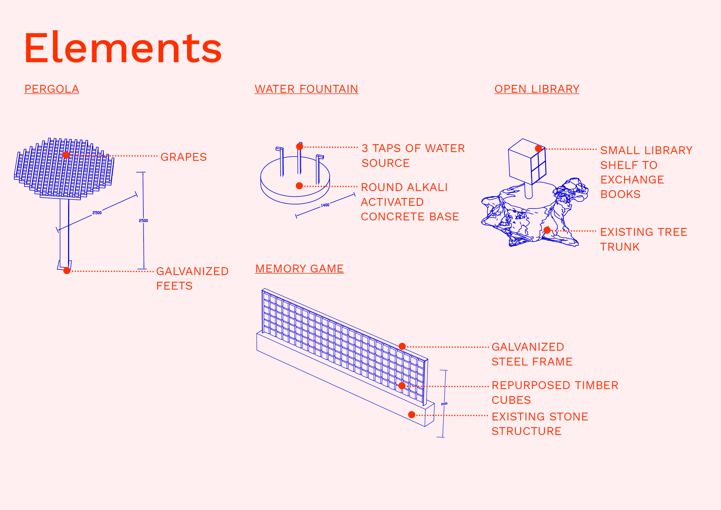 The design plans also include a “little free library” box, a drinking-fountain, an information board and a board game, in order to add a more personal touch to the site, and to strengthen the community.