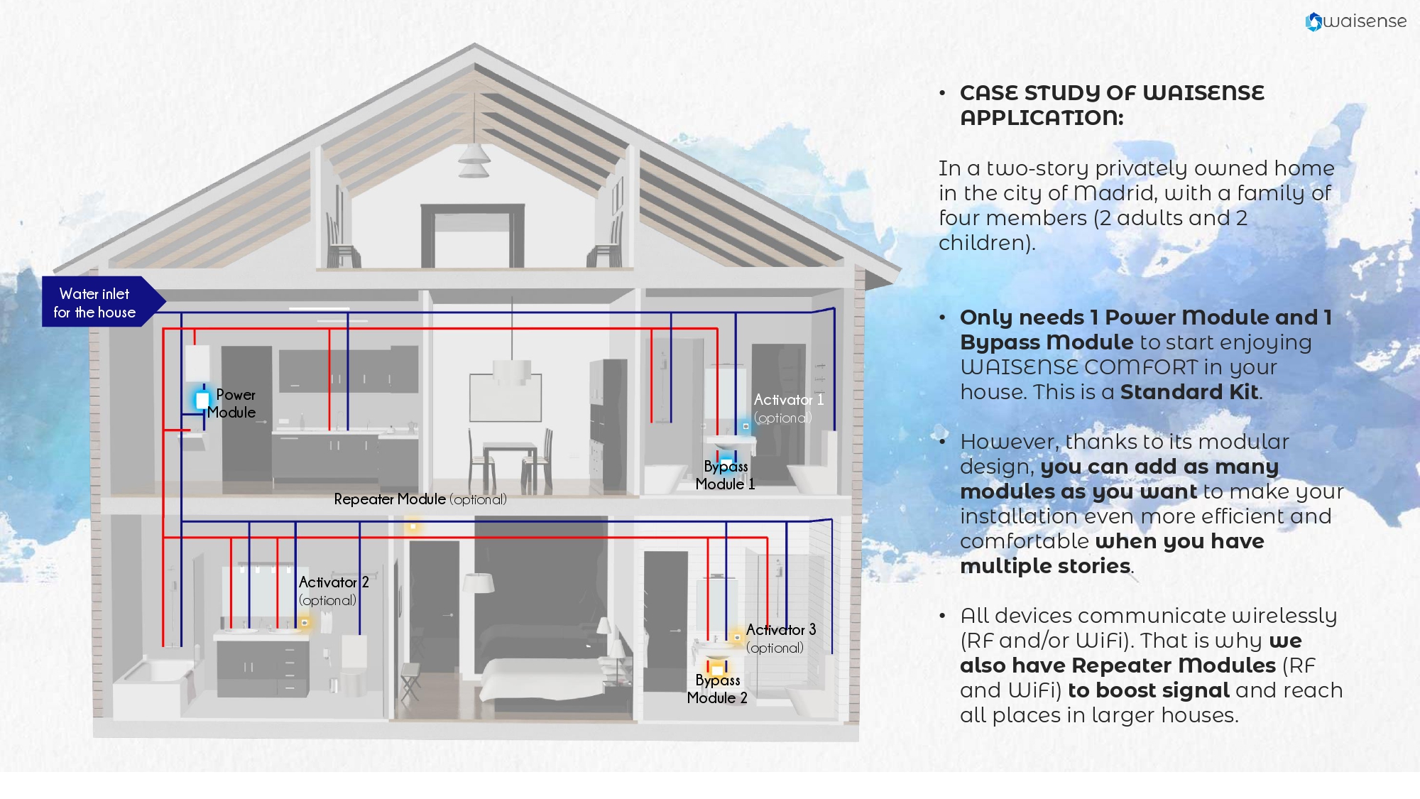 WAISENSE can be integrated into new developments via BIM modeling for pre-installed solutions, or retrofitted into existing buildings with an easy plug&play setup. It serves multiple sectors, including smart homes, touristic accomodations, hospitality, industrial buildings, and urban infrastructure, optimizing water usage and reducing waste.