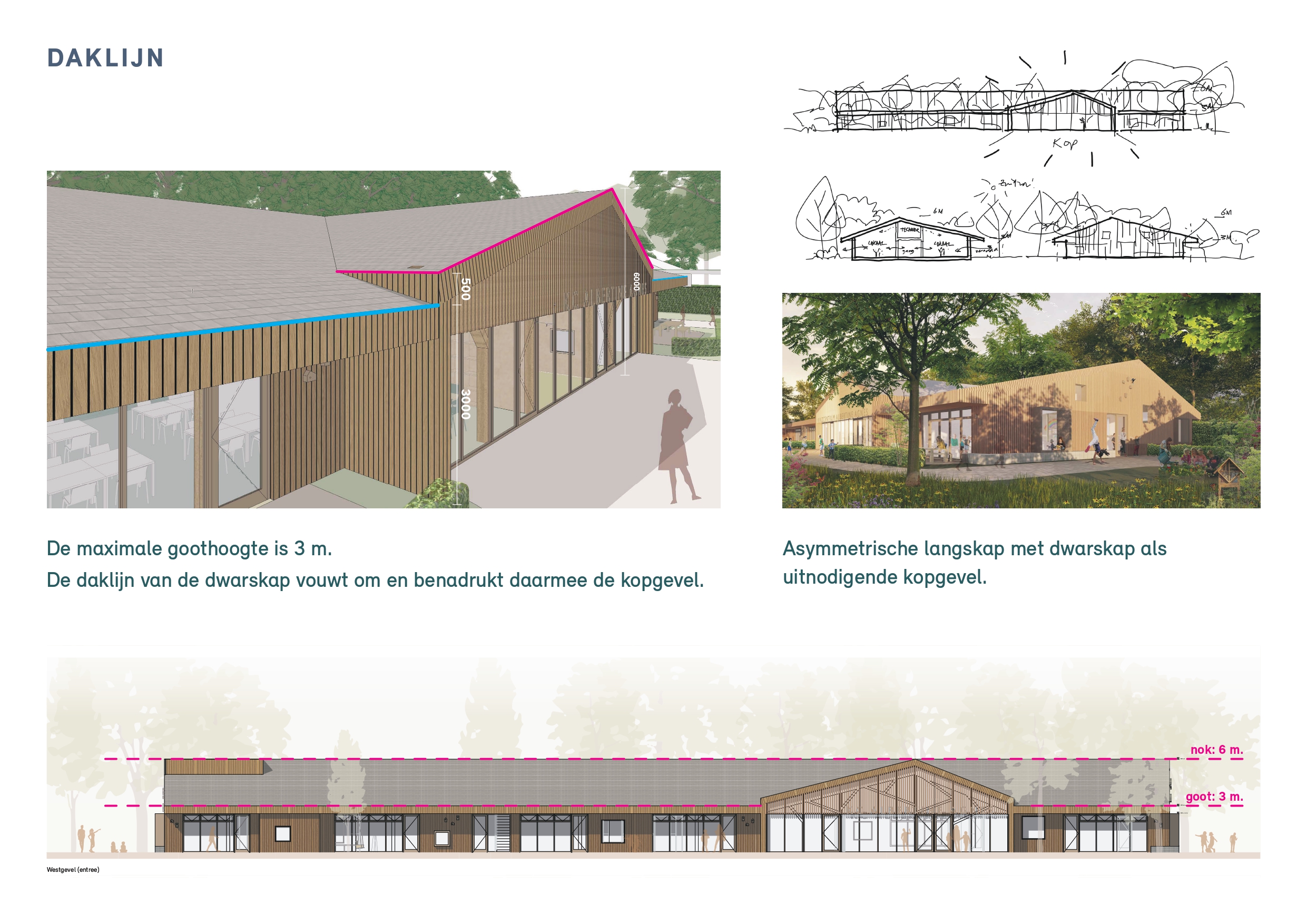 The school fits in its surroudings. Not only do the materials and their finishings match with the natural environment, the design is inspired by typical Frisian barn roofs (stolpkappen) with gable ends. Farms of this type can be found in many places around Oranjewoud.