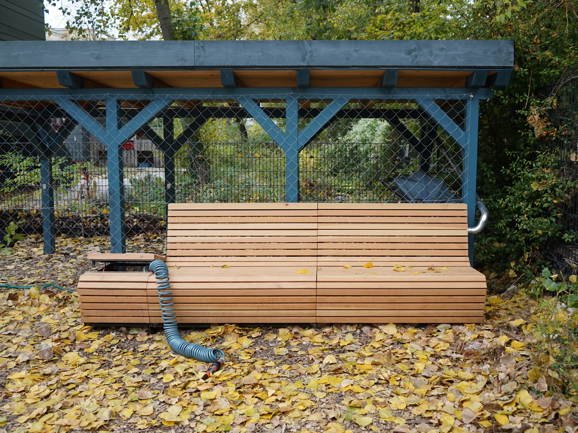 The first Rainwater Bench was installed in a public space at Menschenskinder-Kita, with a 420-liter integrated tank. The next version will store 580 liters. The bench is connected to a stroller shelter’s roof via a pipe, efficiently collecting and directing rainwater into the tank. During dry periods, the stored water is used to irrigate street trees, which need 100 liters per week to develop deep, resilient roots. This rainwater use cools the urban climate, improves air quality, and enhances livability.