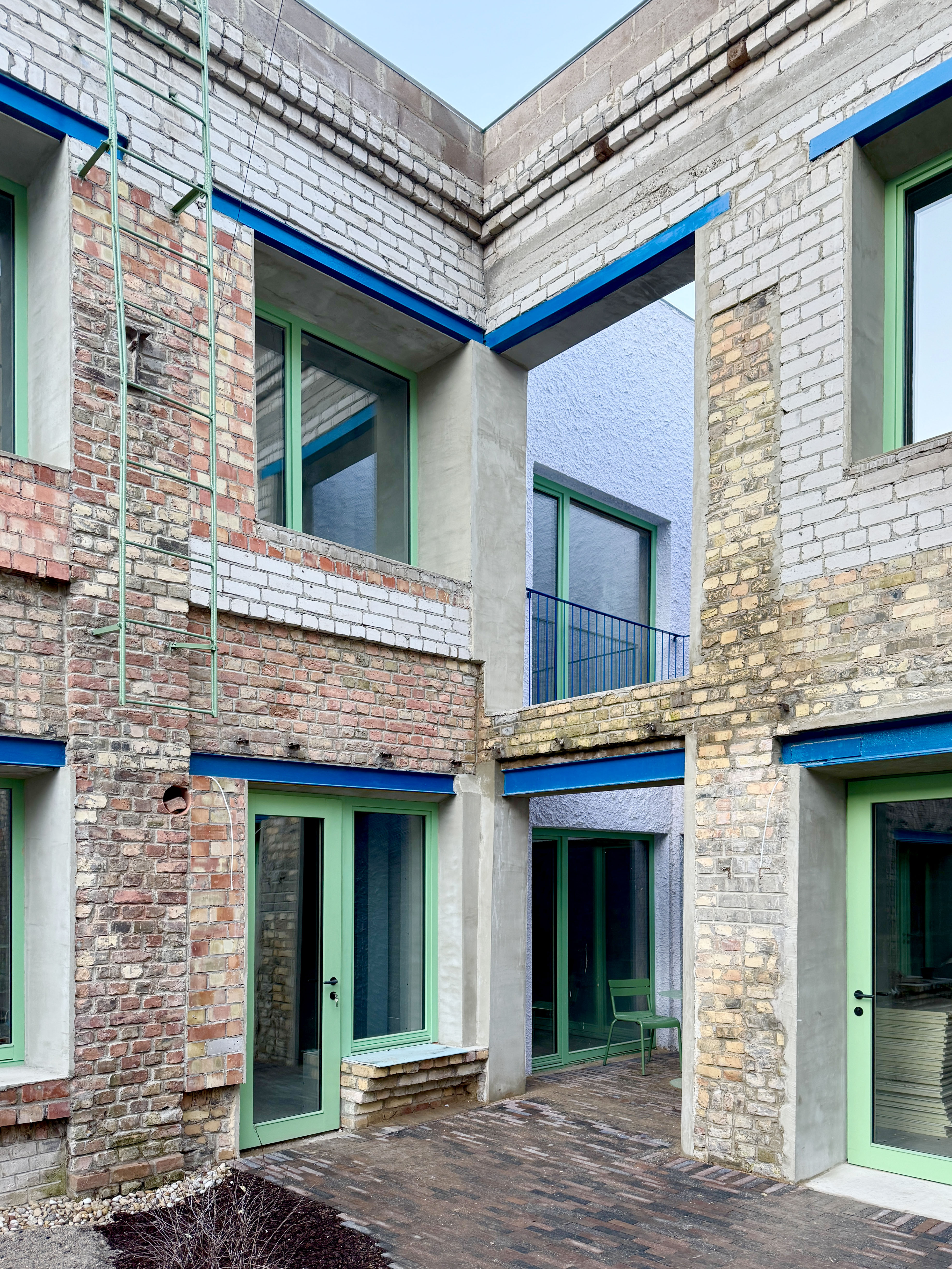 In line with the NEB key principles, the existing industrial buildings were not demolished but adapted to the residential function, with maximum efforts made to preserve all the materials on site. The new materials that were added as part of this adaptation are conceived in a similar manner: visibly introduced into the build heritage as yet another—contemporary—layer. The former industrial structures are reimagined in a contemporary architectural language, embracing the idea of adaptive reuse. At its core, this methodology aims to promote climate-neutral construction. In designing the redevelopment, we sought to preserve the authentic sense of place and openly reveal the building's history. Almost a century's worth of layers – reflecting different eras and residents – have been retained as an aesthetic asset, showcasing the story of how the development evolved into its current state. The bold yet meticulously thought-out and nuanced new additions lend the buildings a stylishly contemporary character. This ensures future residents will be encouraged to live sustainably and appreciate the adaptive approach.