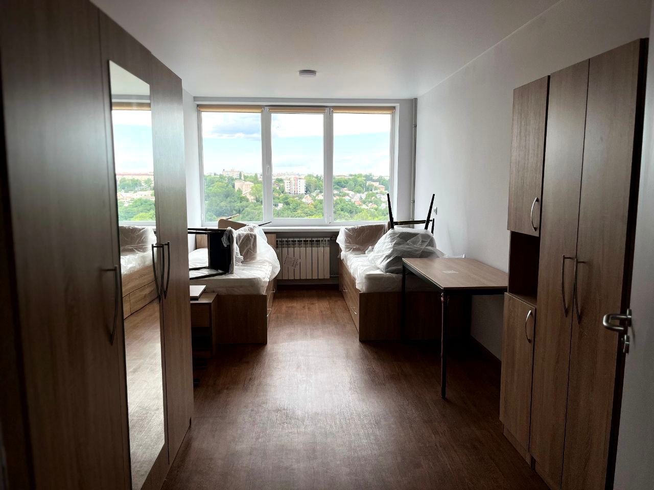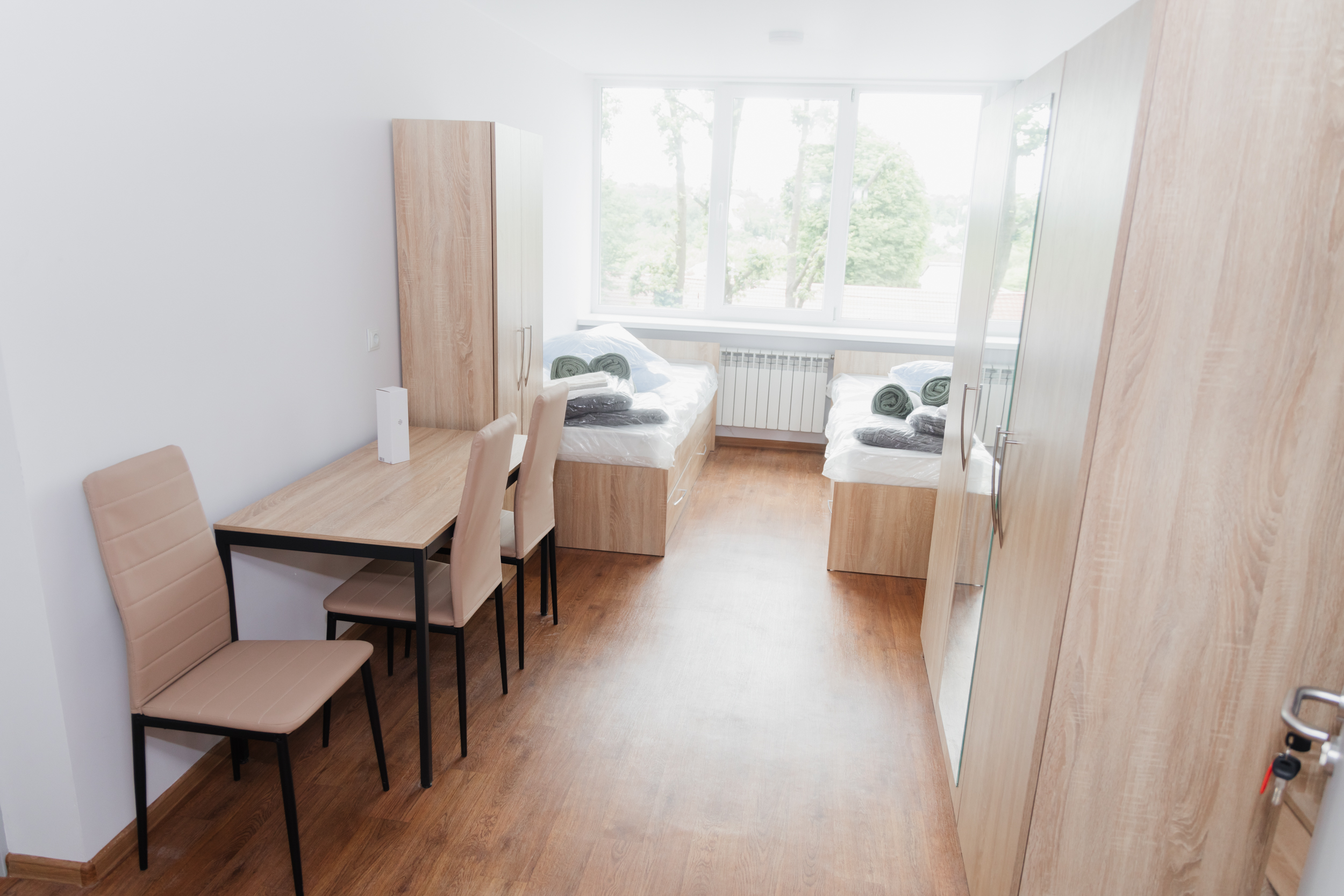 Each floor has a communal kitchen with the necessary appliances, two bathrooms (each with 4 toilets, showers and 6 sinks) and washing and drying machines. Fire safety standards are met: fire extinguishers, evacuation plans and first aid kits are installed.