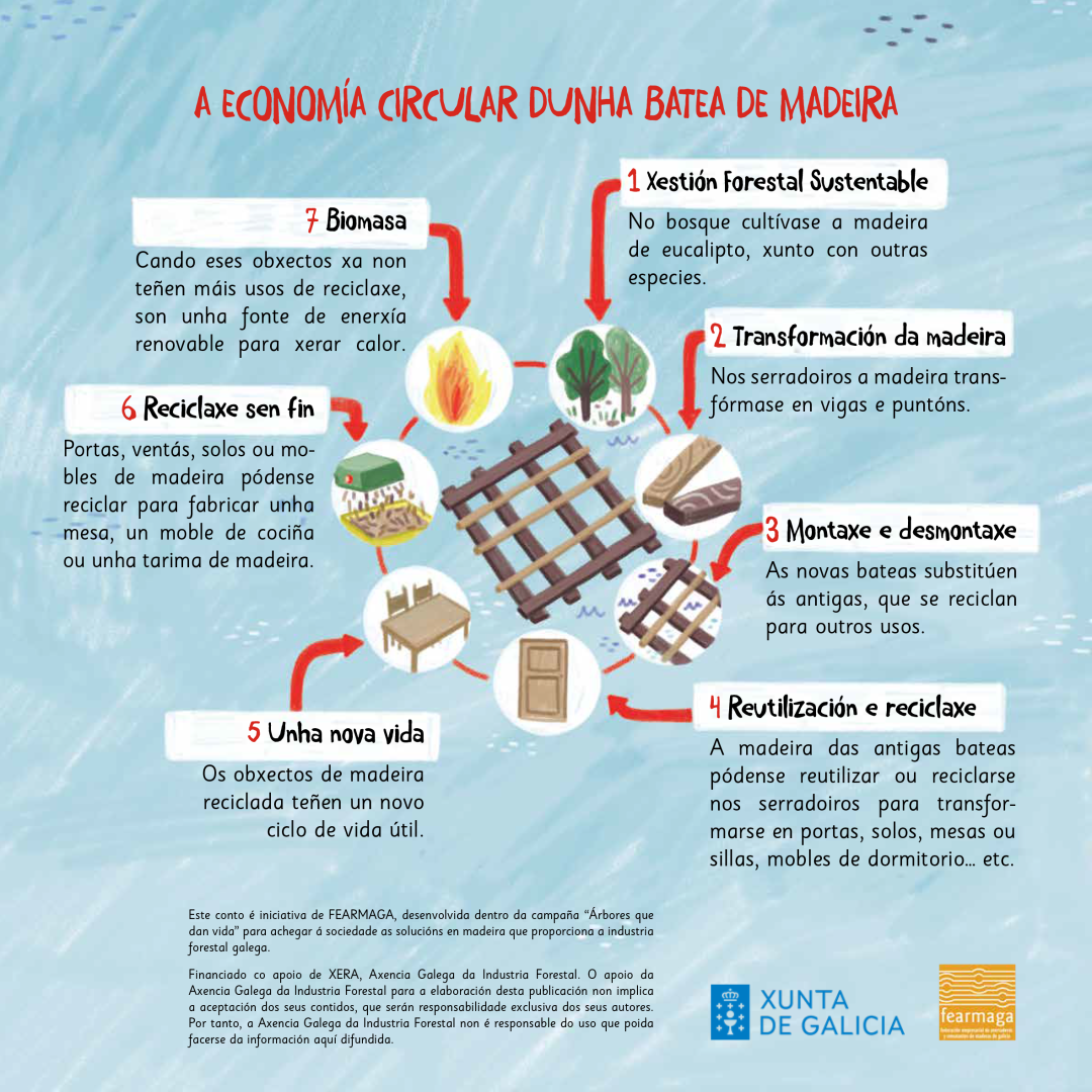 In Galicia, the wood industry has a long tradition and the wooden tray created to grow mussels is the common thread to explain the endless reuse of wooden objects. The mussel farms are used to cultivate mussels in the sea for 25 years, they are an example of forest industry design for the Galician fishing industry. At the end of their useful life, mussel farms are reused, becoming furniture or structural elements in the rehabilitation of buildings. Its last use will be to be used as biomass to generate energy.