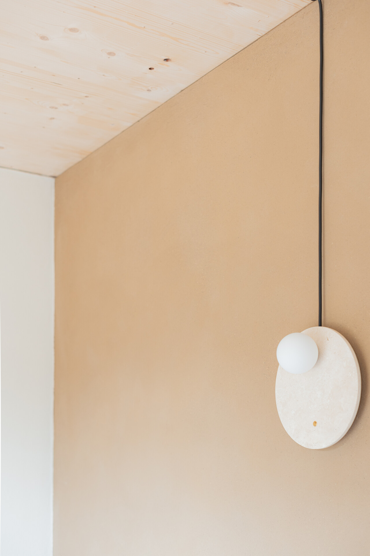 NOW Lindow aims to create an aesthetic of simplicity and honesty that fosters a natural sense of comfort. This is reflected in elements such as the exposed ceiling, the wood of the load-bearing interior walls, a window revealing the straw components, and the visible clay wall surfaces. The tactile quality of the materials invites touch and exploration, from the textured clay with embedded straw to the knots in the wood and soft wooden reveals finished only with linseed oil.