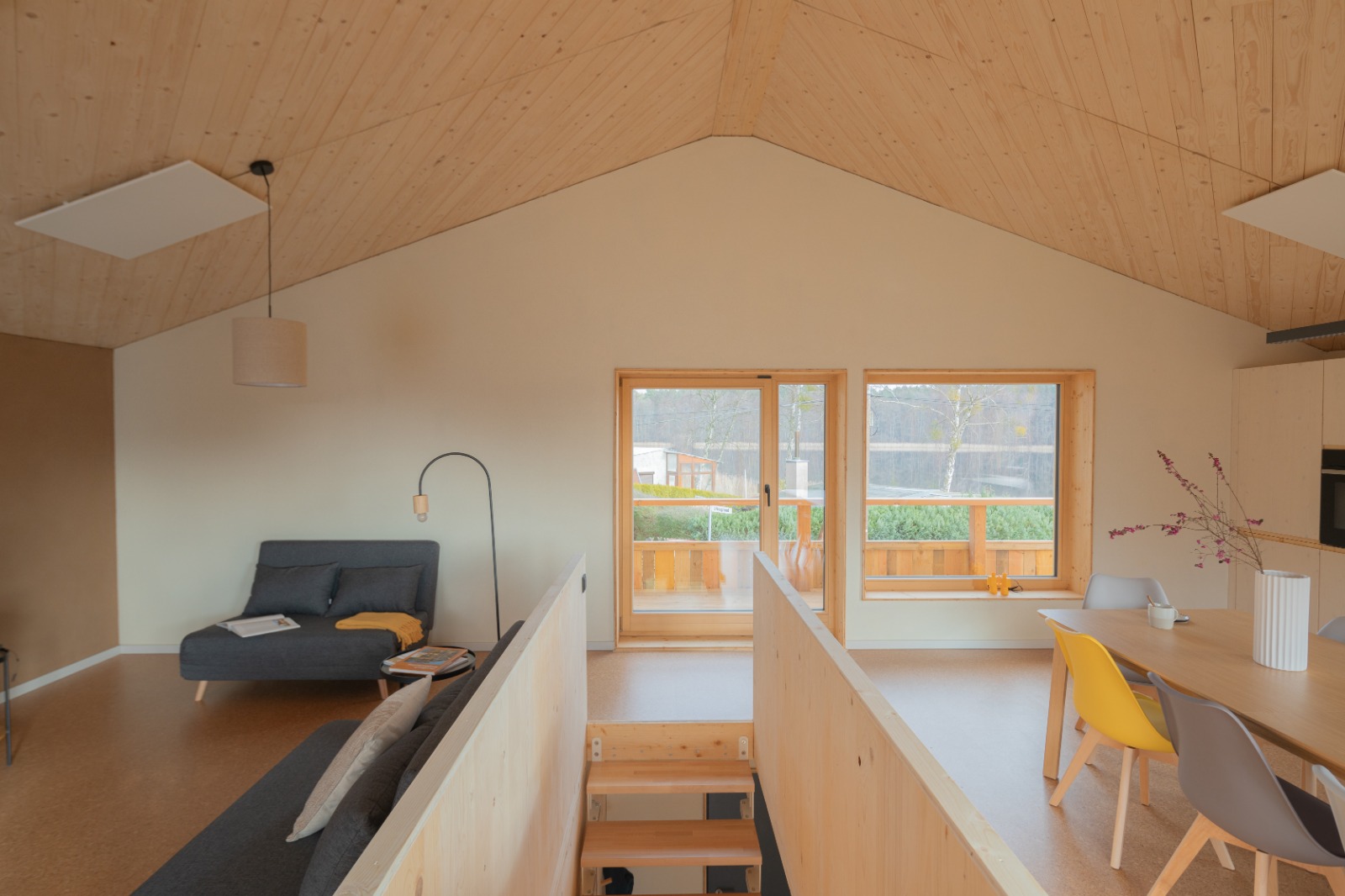 At NOW Lindow, attention to the building’s orientation and openings created a comfortable climate achieved solely with infrared heating panels and proper manual ventilation. This keeps operating costs low and avoids maintenance costs for technical systems.