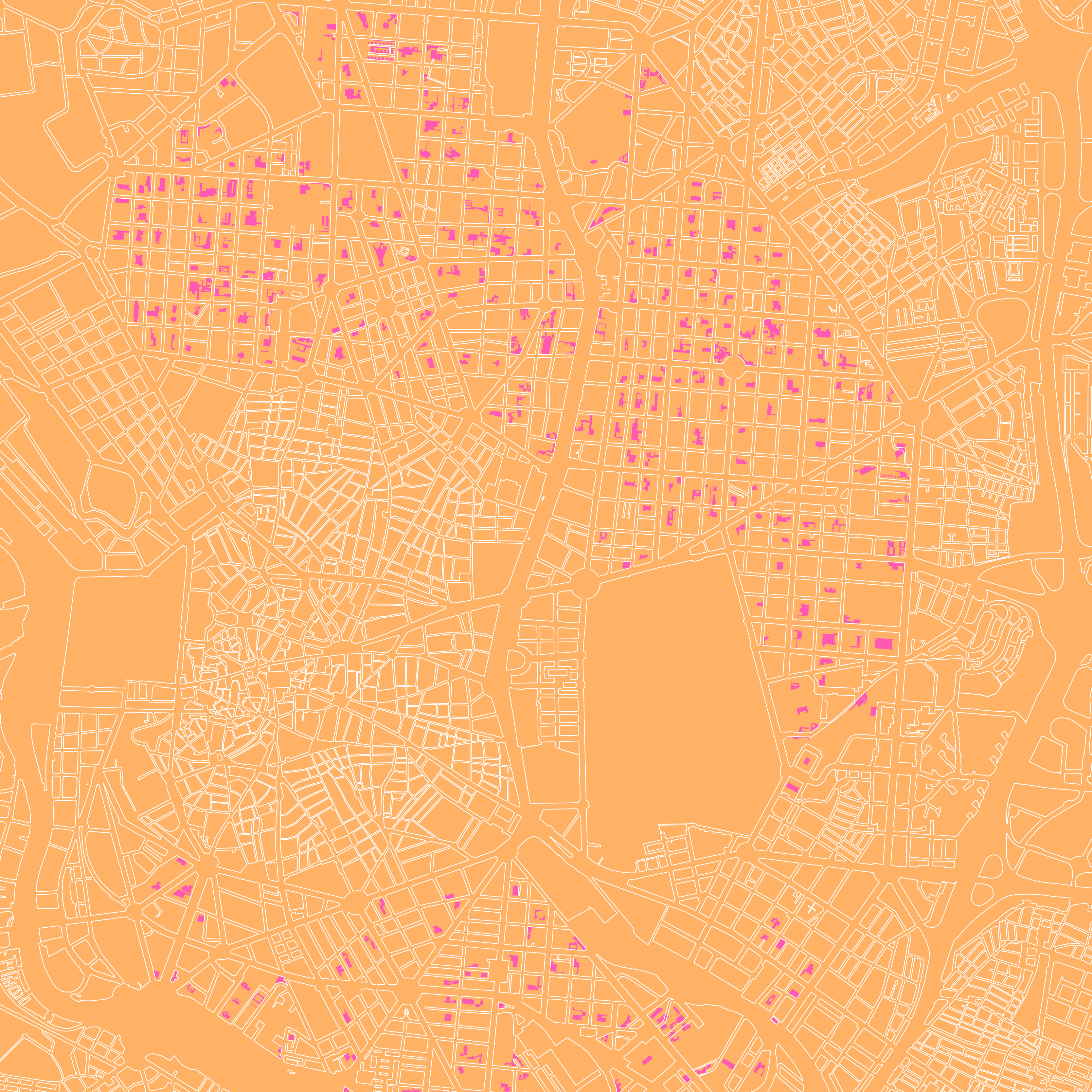 All inner block courtyards in Madrid have been mapped and analyzed. Based on their dimensions and density, a series of areas of interest for the project have been identified. The Ensanche district, with its abundant and favorable courtyards, was selected as the main study area.