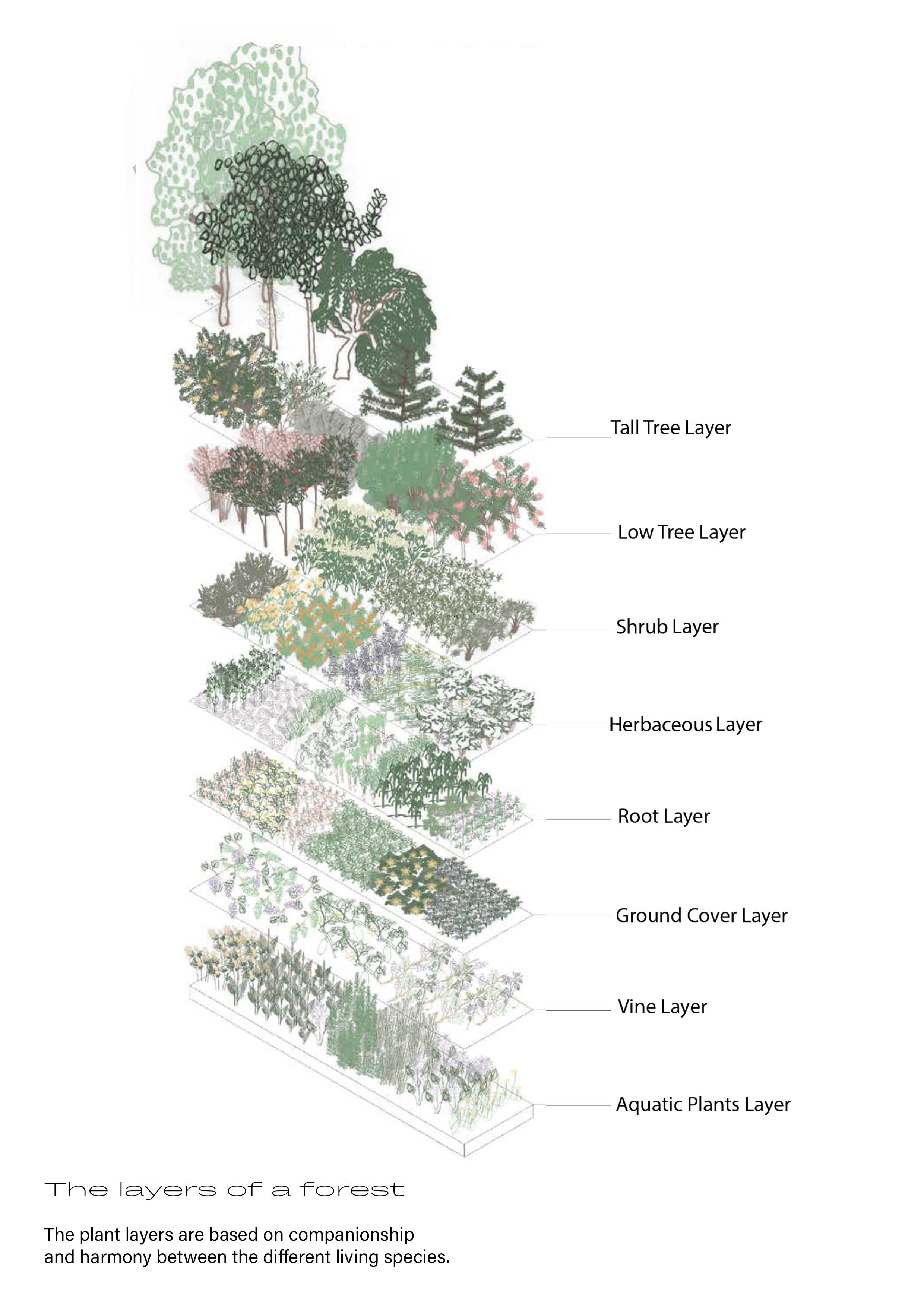 We adapted the concept studied in Taiwan to our European context, reaching out to German gardeners to select plants adapted to the climate of Cologne for all layers of the forest. This research was translated into a hand drawn plant database.