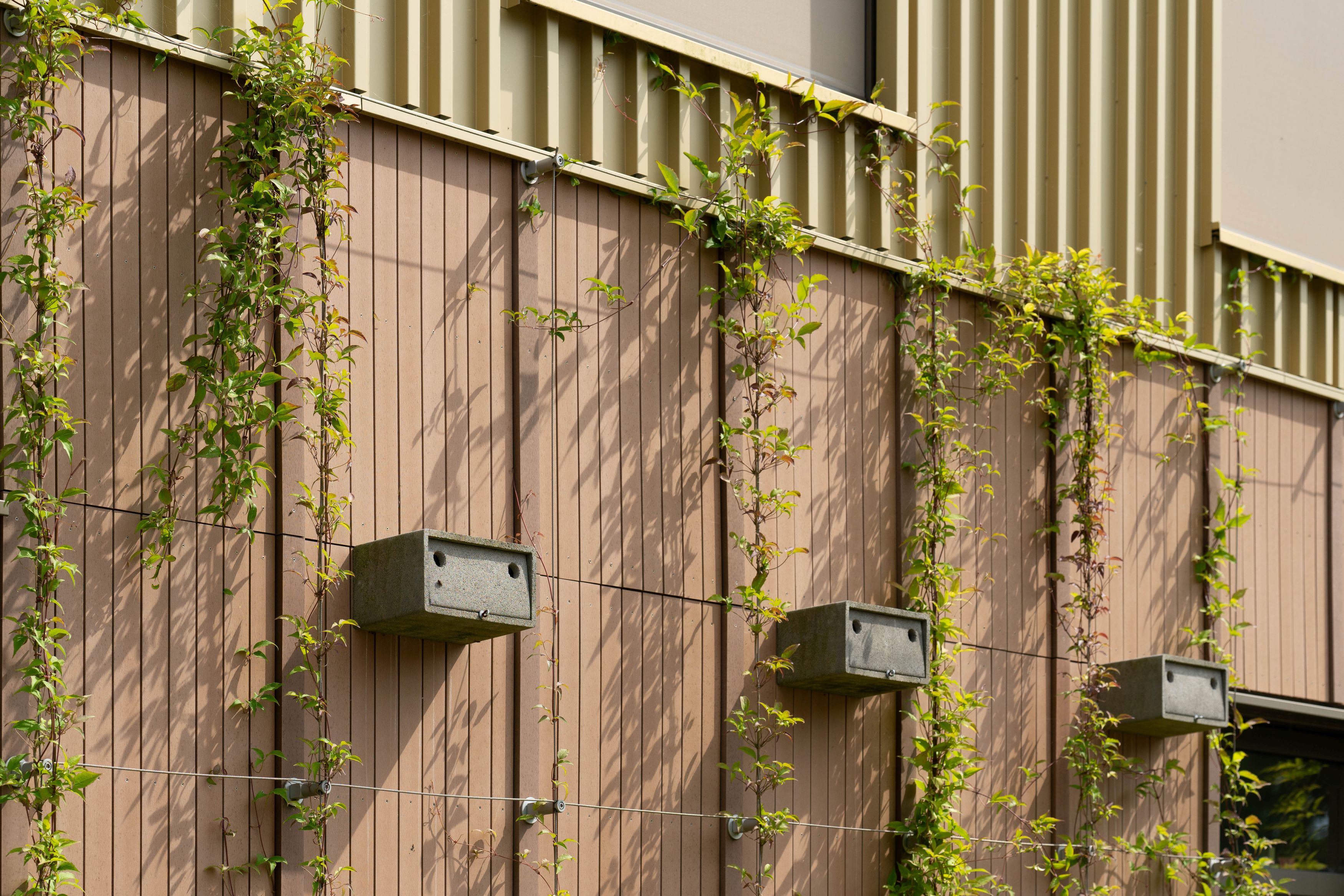 The development provides valuable ecosystem services. Nature-Based Solutions were implemented and integrated in the entire area. A water pond collects and buffers all rainwater from the building, helping to prevent flooding while also offering natural cooling during high summer temperatures. Additionally, the diverse landscape creates a rich environment that strengthens local biodiversity, making the campus a sustainable and vibrant place for both education and nature.
