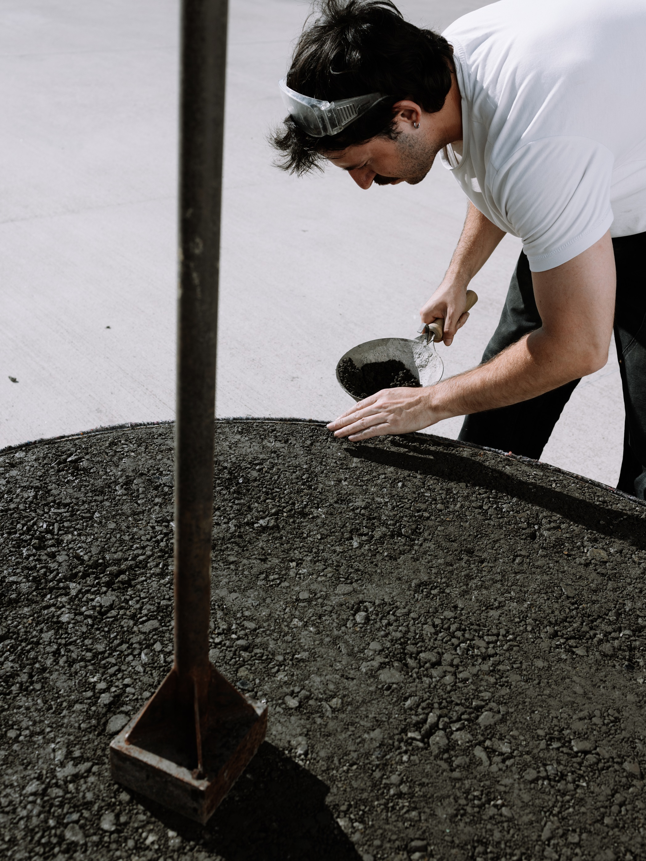 Showcase the potential of excavated earth waste through a tangible, functional object - around table - crafted from rammed earth and upcycled stone offcuts. The table represents large-format samples of polished rammed earth flooring and a rammed earth wall, demonstrating their direct applicability in contemporary architecture and interior design.