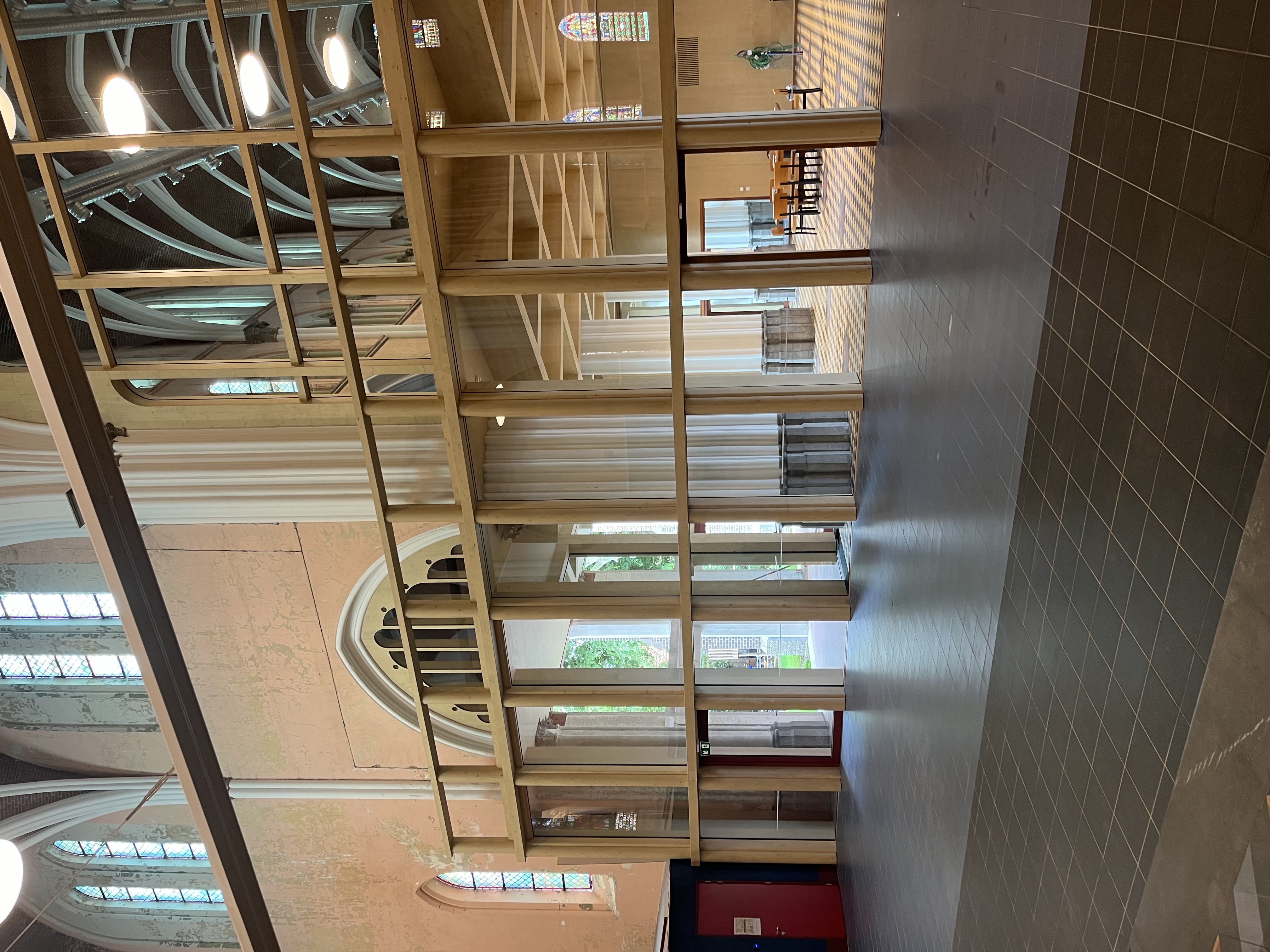 Blending new functions with the church’s architecture was adressed by using box-in-box volumes that meet modern energy and sustainability standards. The volume in the church nave is built from CLT (cross-laminated timber), a sustainable material that significantly reduces CO₂ emissions compared to concrete and steel. CLT allows for fast assembly with prefabricated elements, flexible design and adapting to complex shapes. The wood creates a warm, indoor atmosphere that enhances residents’ well-being. These new wooden volumes comply with contemporary energy regulations, respecting the authentic neo-Gothic architecture, blending modern architectural solutions with a deep respect for cultural heritage.