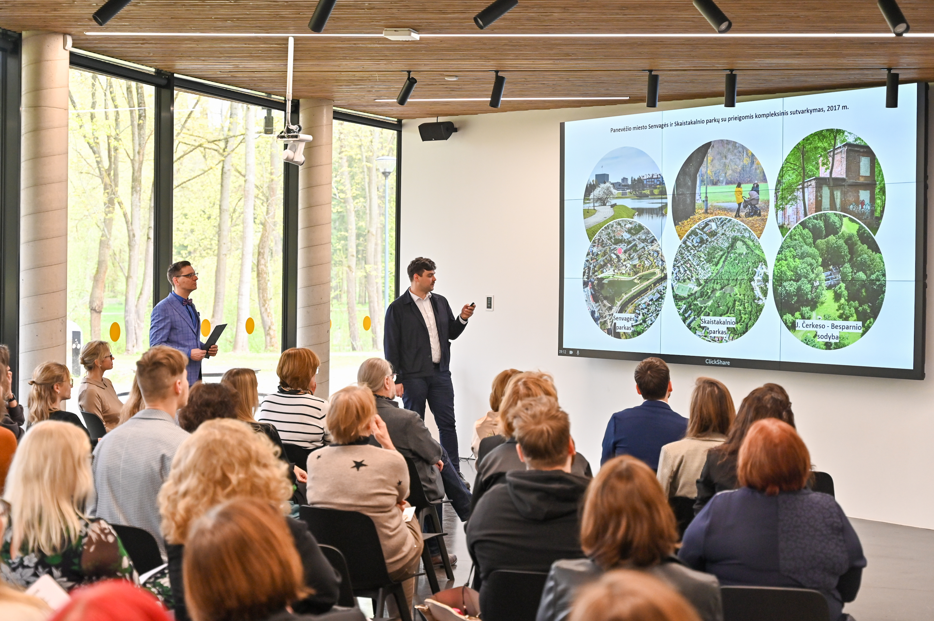 The restoration of the Juozas Čerkesas-Besparnis homestead was guided by heritage specialists, ensuring historical integrity while integrating contemporary design solutions. Architects from MB "PUPA - strateginė urbanistika" designed a modern glass extension, blending tradition with innovation while maintaining harmony with Skaistakalnis Park. The project also improved green spaces, pedestrian pathways, and visibility of the Žagienis stream, led by landscape architects and environmental specialists.