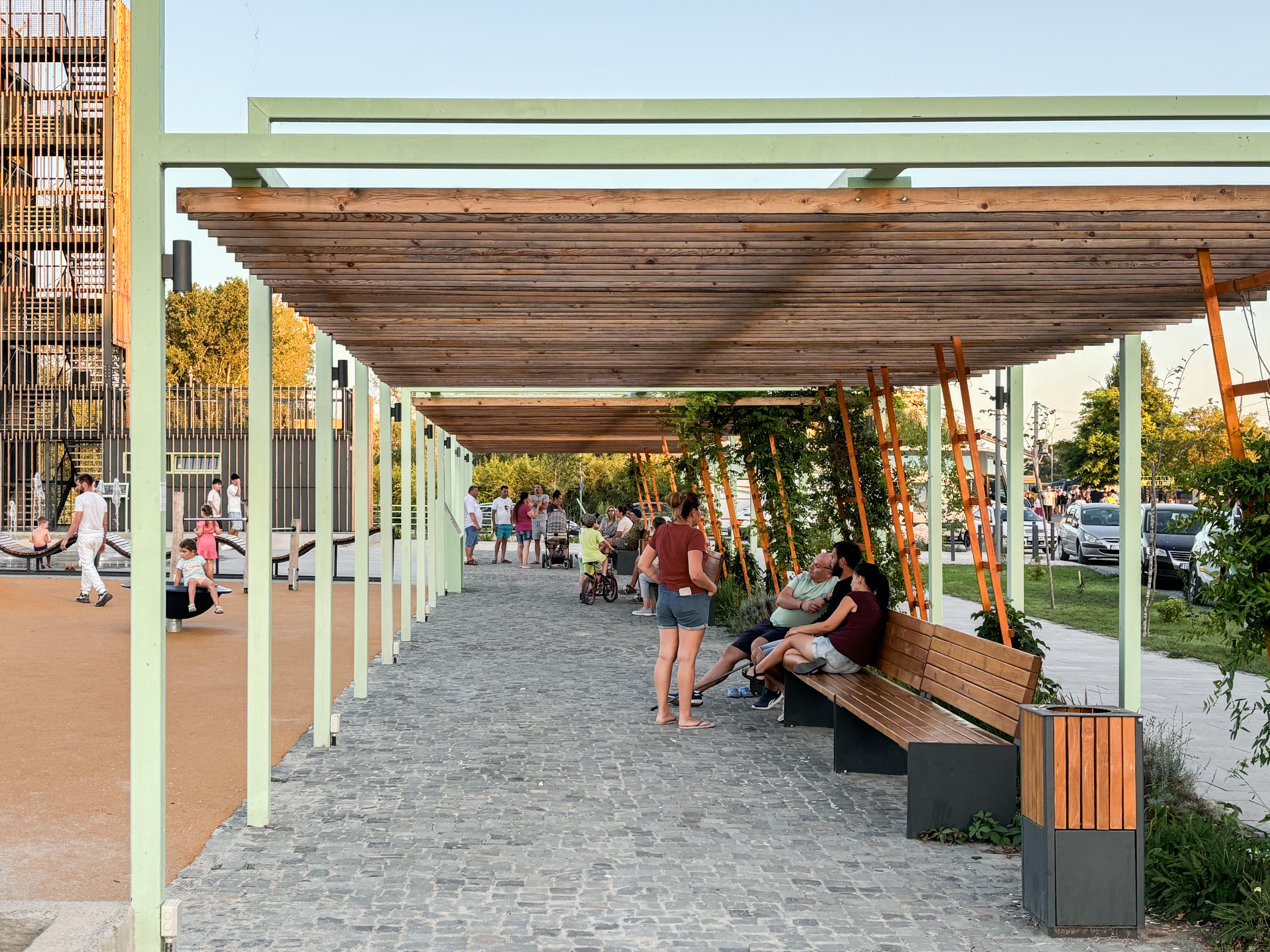 Key objectives include creating a flexible, inclusive public space, preserving natural features, and integrating accessibility through participatory methods. Outcomes include Romania’s first inclusive playscape, co-designed with children and parents (with and without disabilities), diverse seating and gathering areas, an inclusive wayfinding system, and custom designed accessibility solutions. A multi-functional community pavilion and a watchtower further encourage intergenerational and cross-cultural engagement.