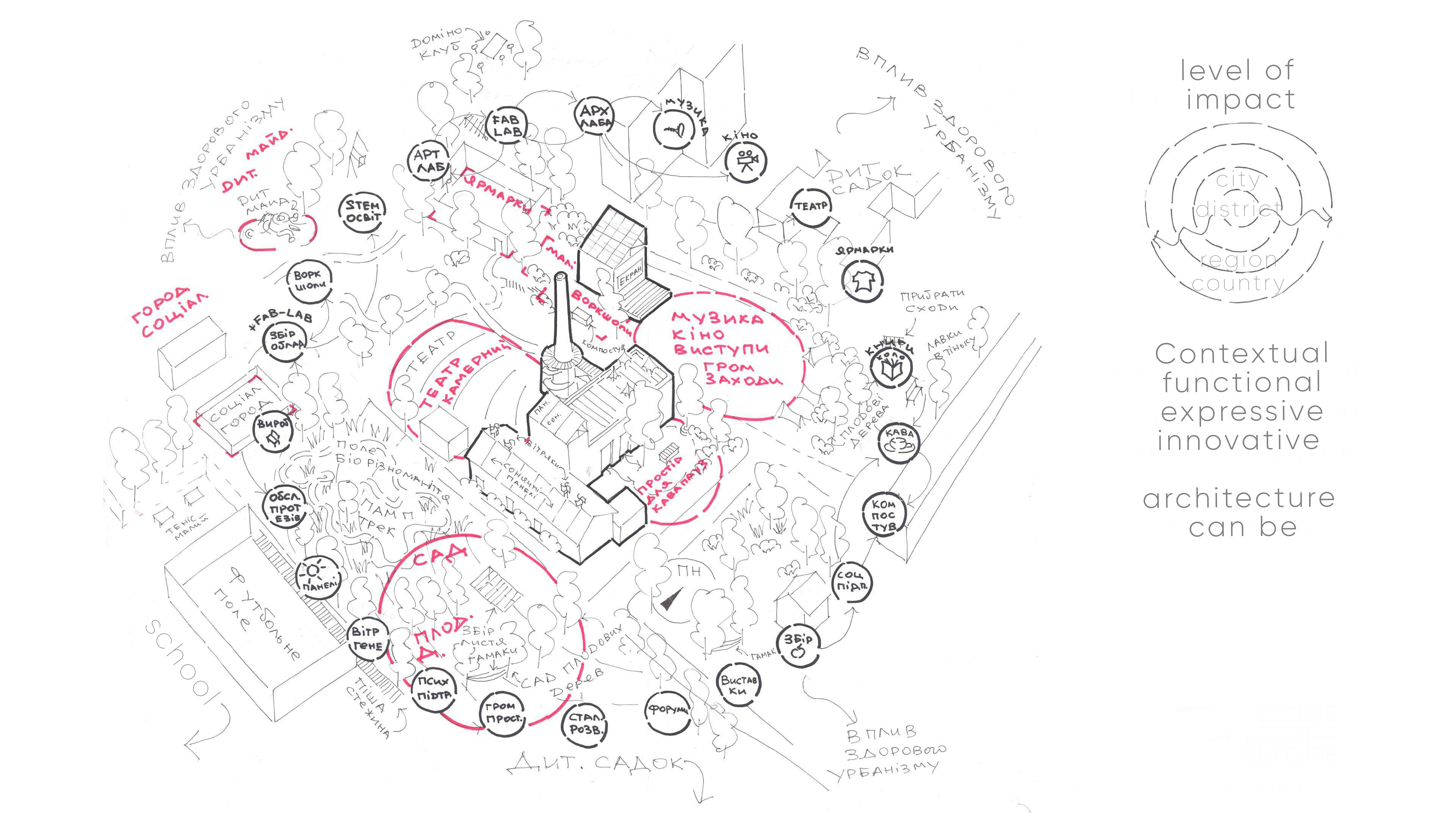 This building could become a symbol that not only changes the city's face but also inspires the entire community for transformation and recovery after the war, becoming a scientific-artistic observatory.
