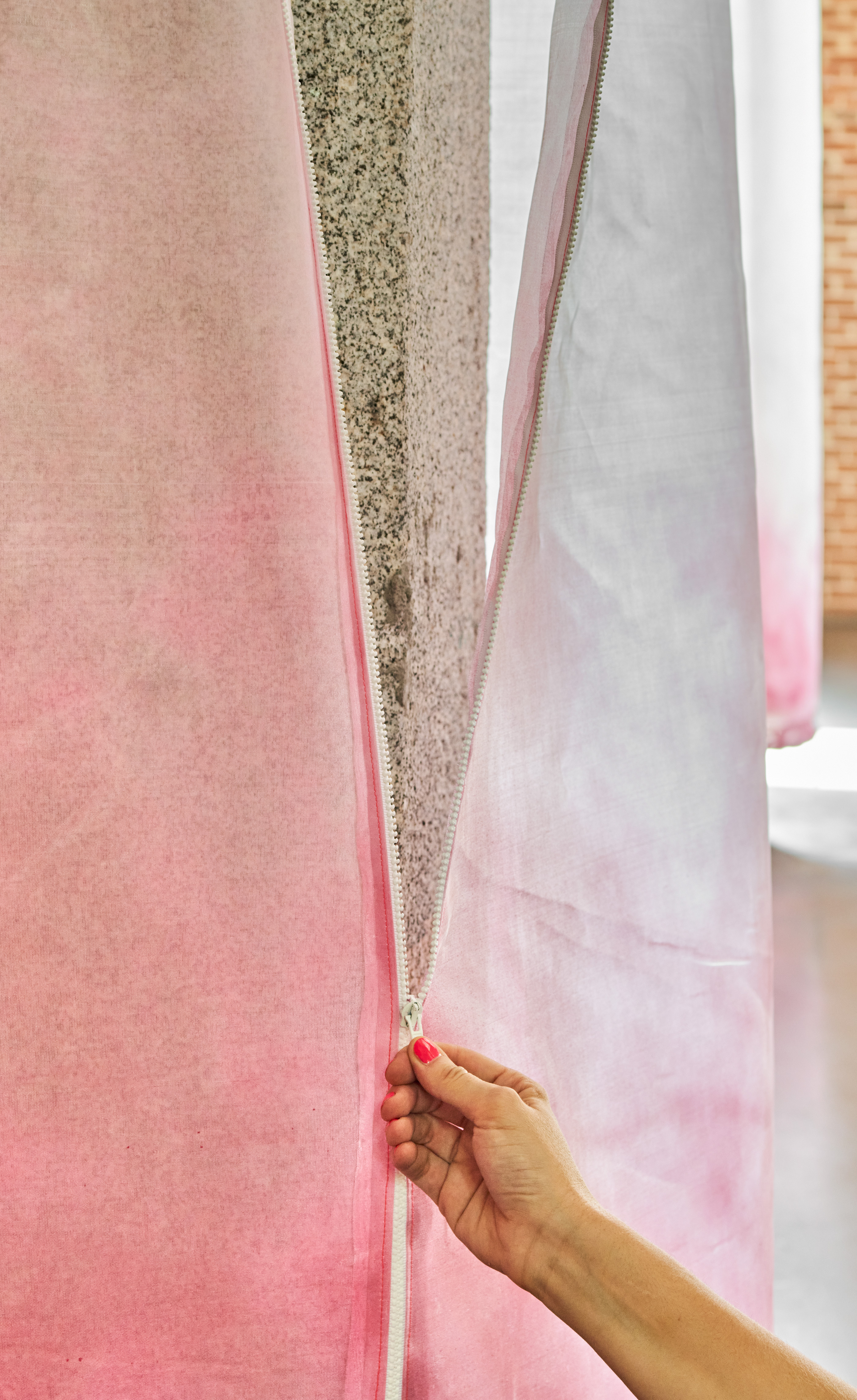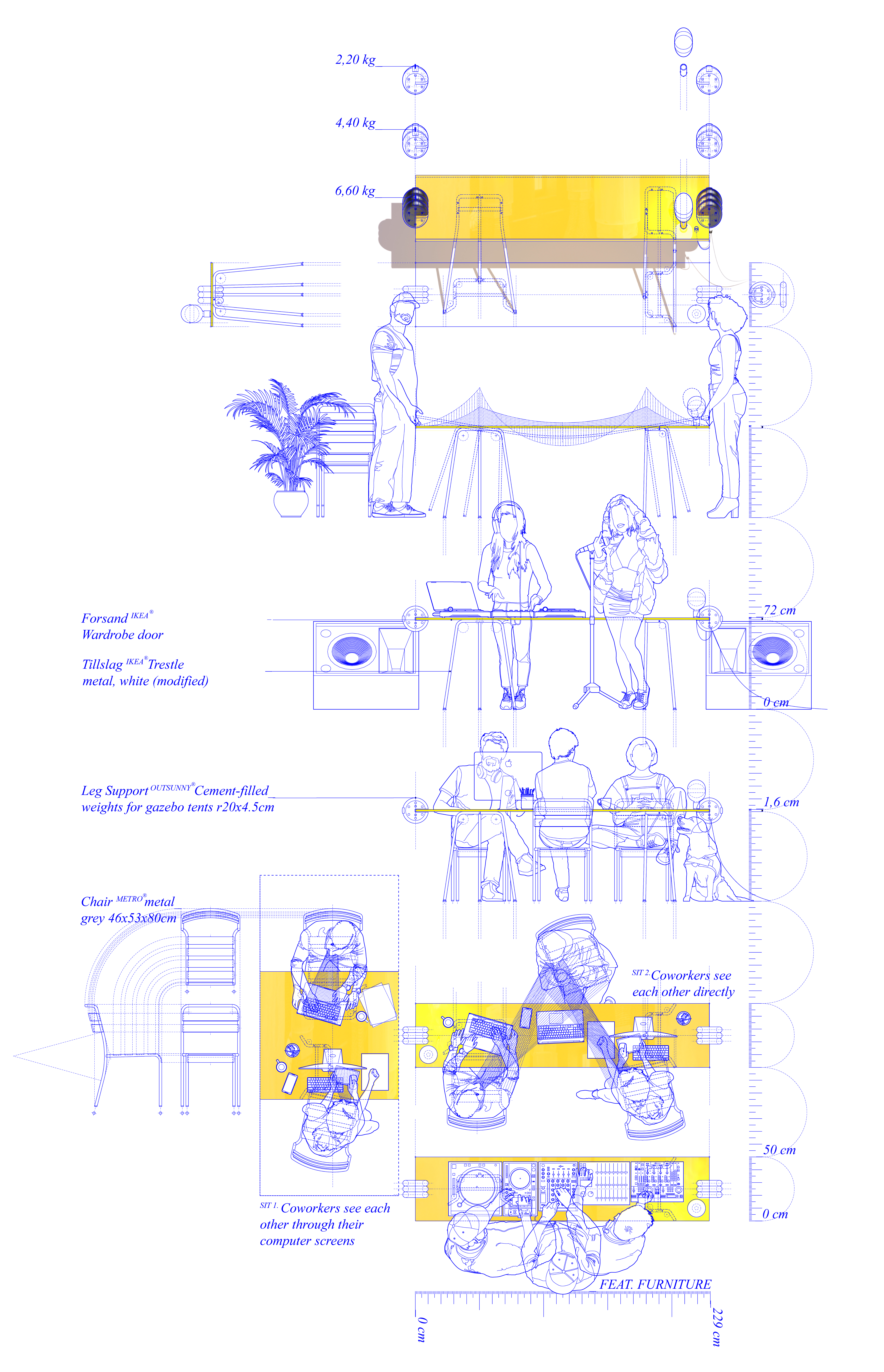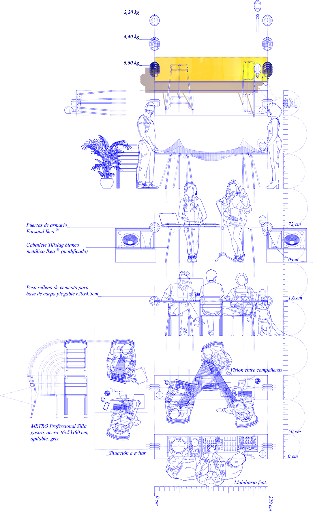 How to convert the solemn materiality of this room into a space for poetic and artistic creation, how to transform its rigid configuration into a place under permanent construction that functions as a laboratory for experimentation and a community of communities, and how to do so without altering the building? To respond to these considerations, the project develops two complementary strategies: "Touchless design," and "Feat. Furniture.”