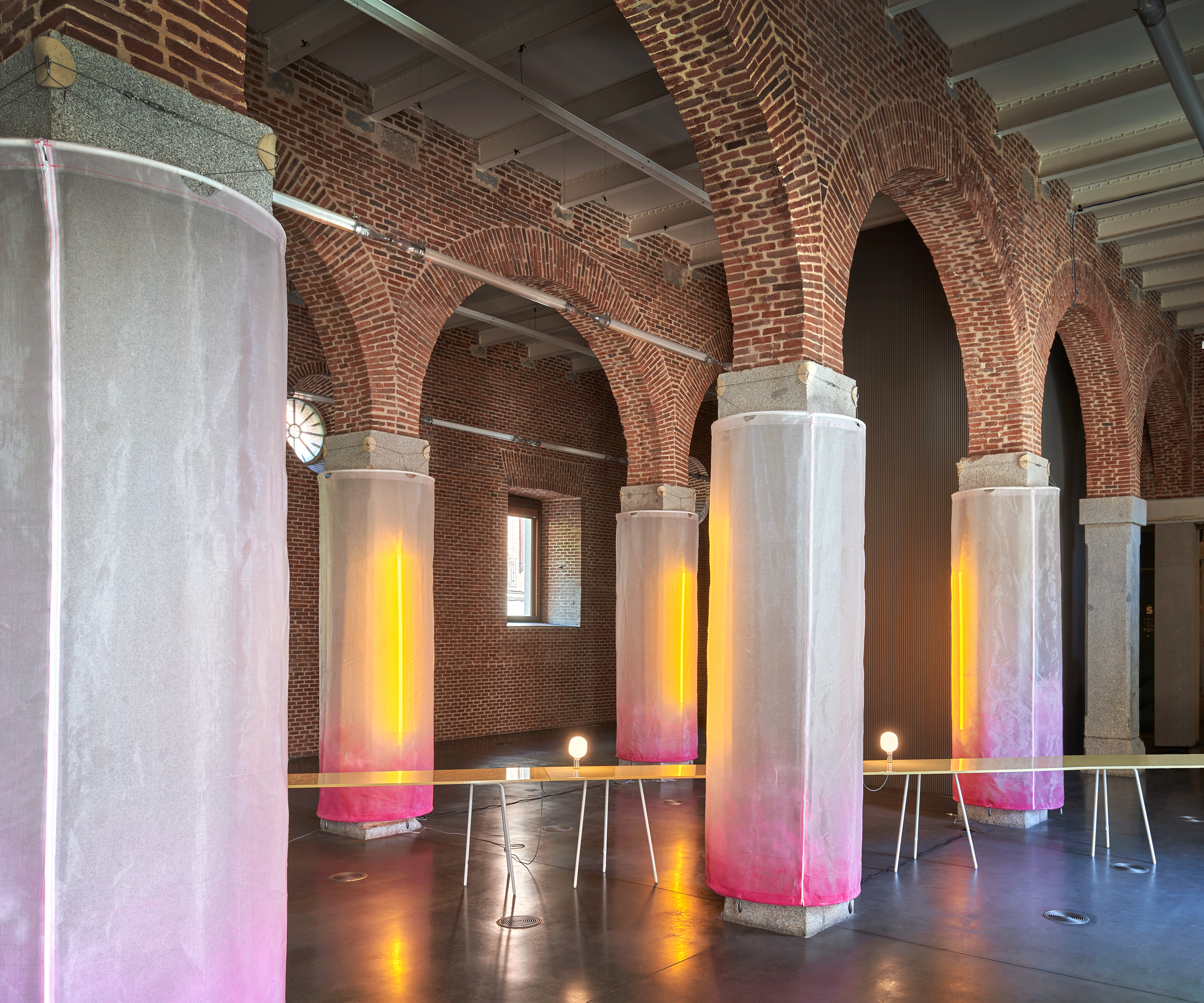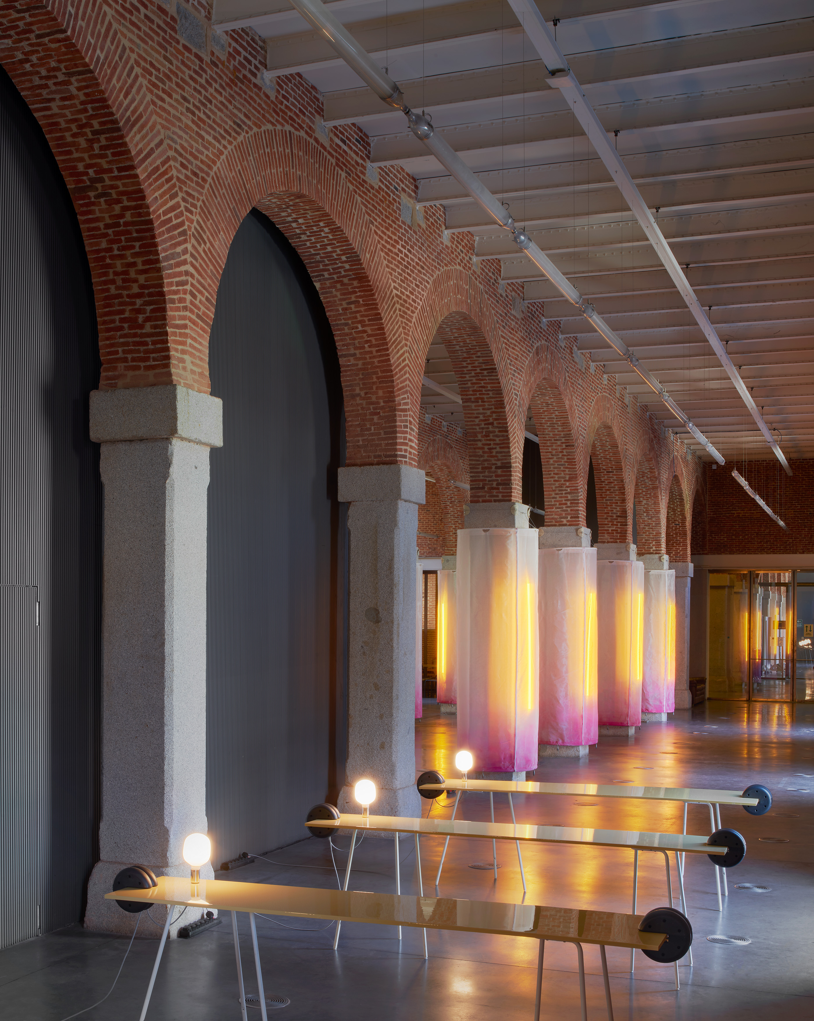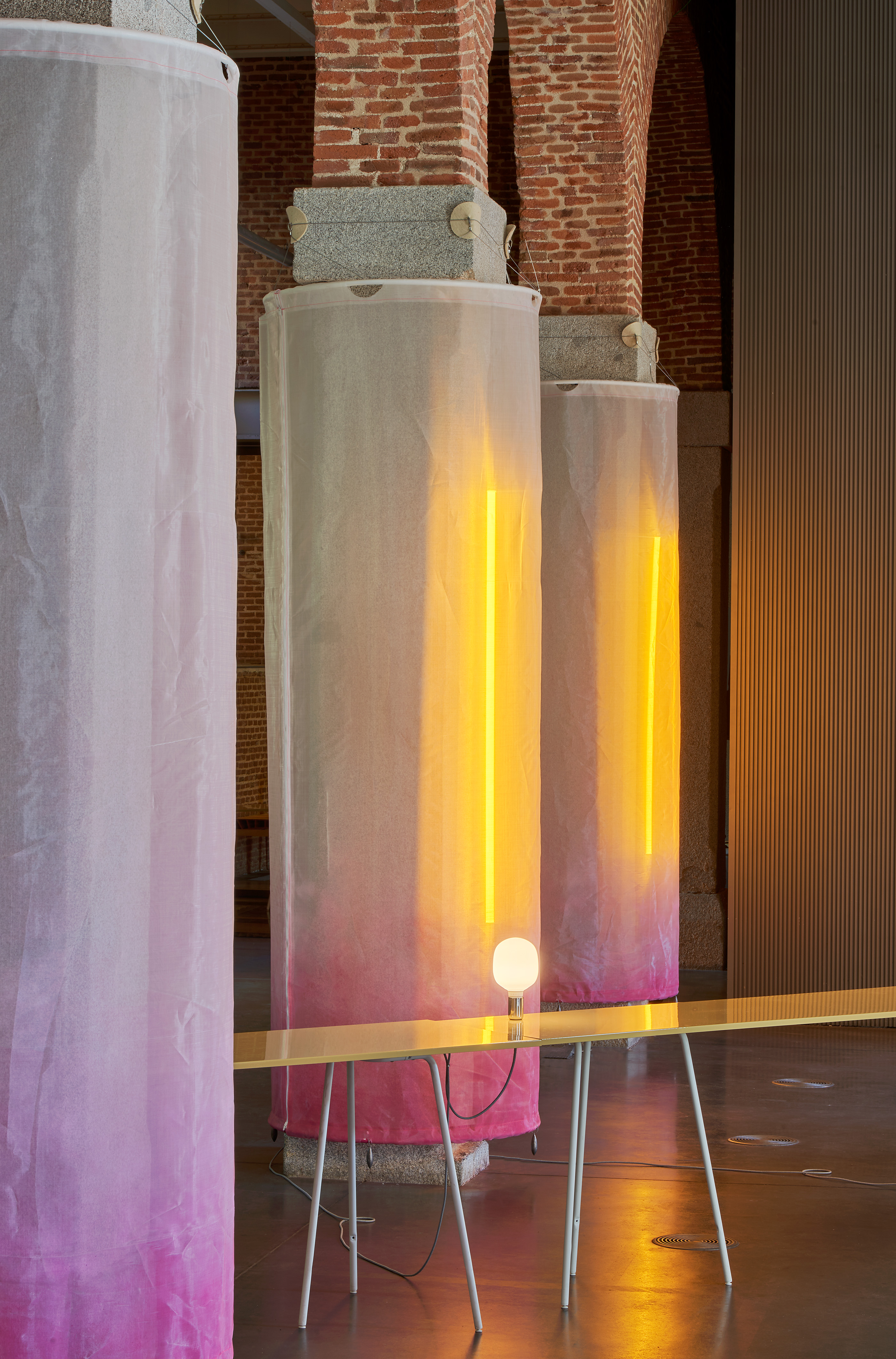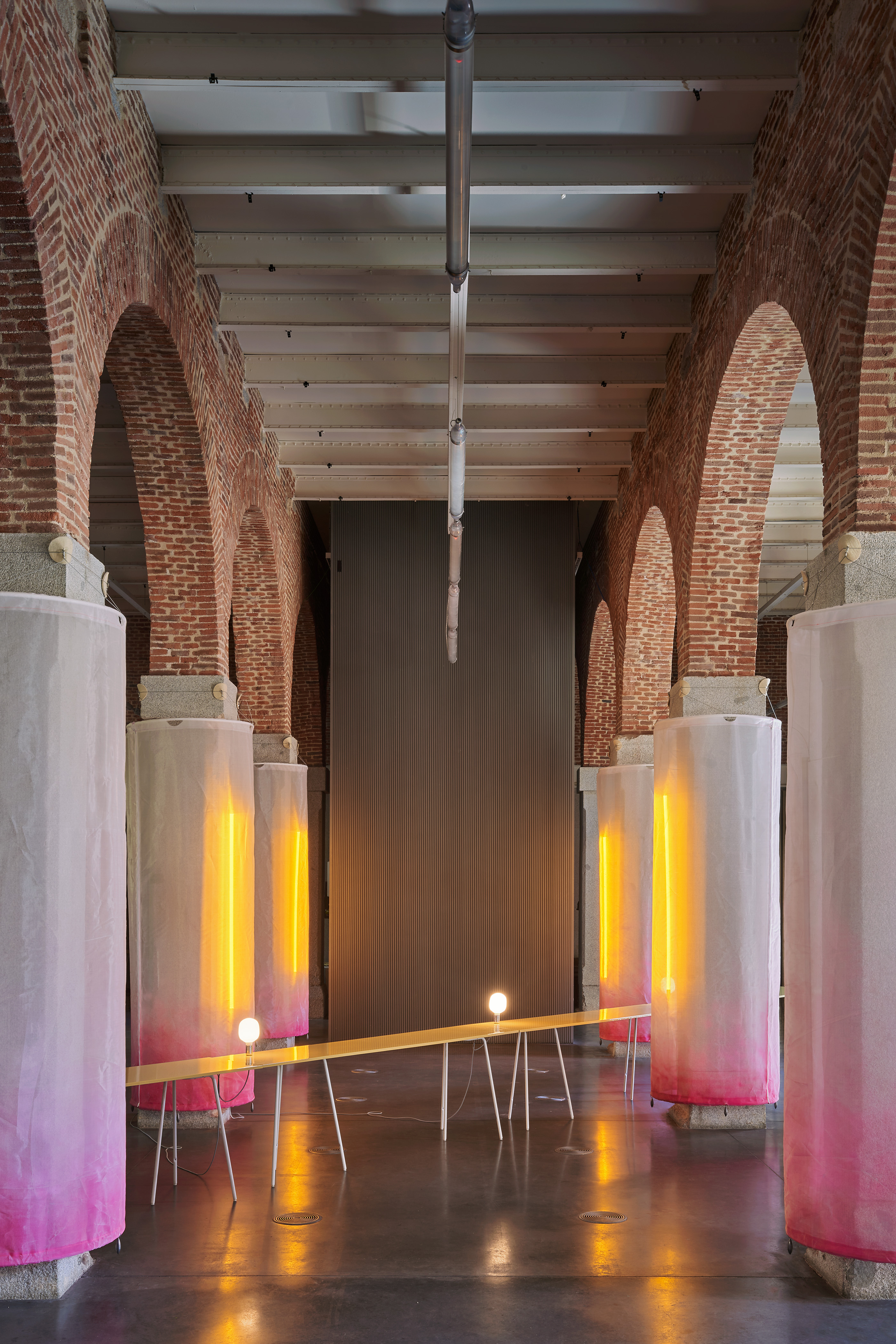 Un Cuarto en Llamas was developed at the Sala Polivalente (Multipurpose Room) of the Conde Duque military barracks. The Sala Polivalente at Conde Duque is an open space with a basilica-like floor plan defined by three bays of granite columns, delimited by brick walls. As it is a listed building, all interventions on the pre-existing architecture are limited, prohibiting any alteration of the original elements or the mounting of pieces employing holes or chemical adhesives.