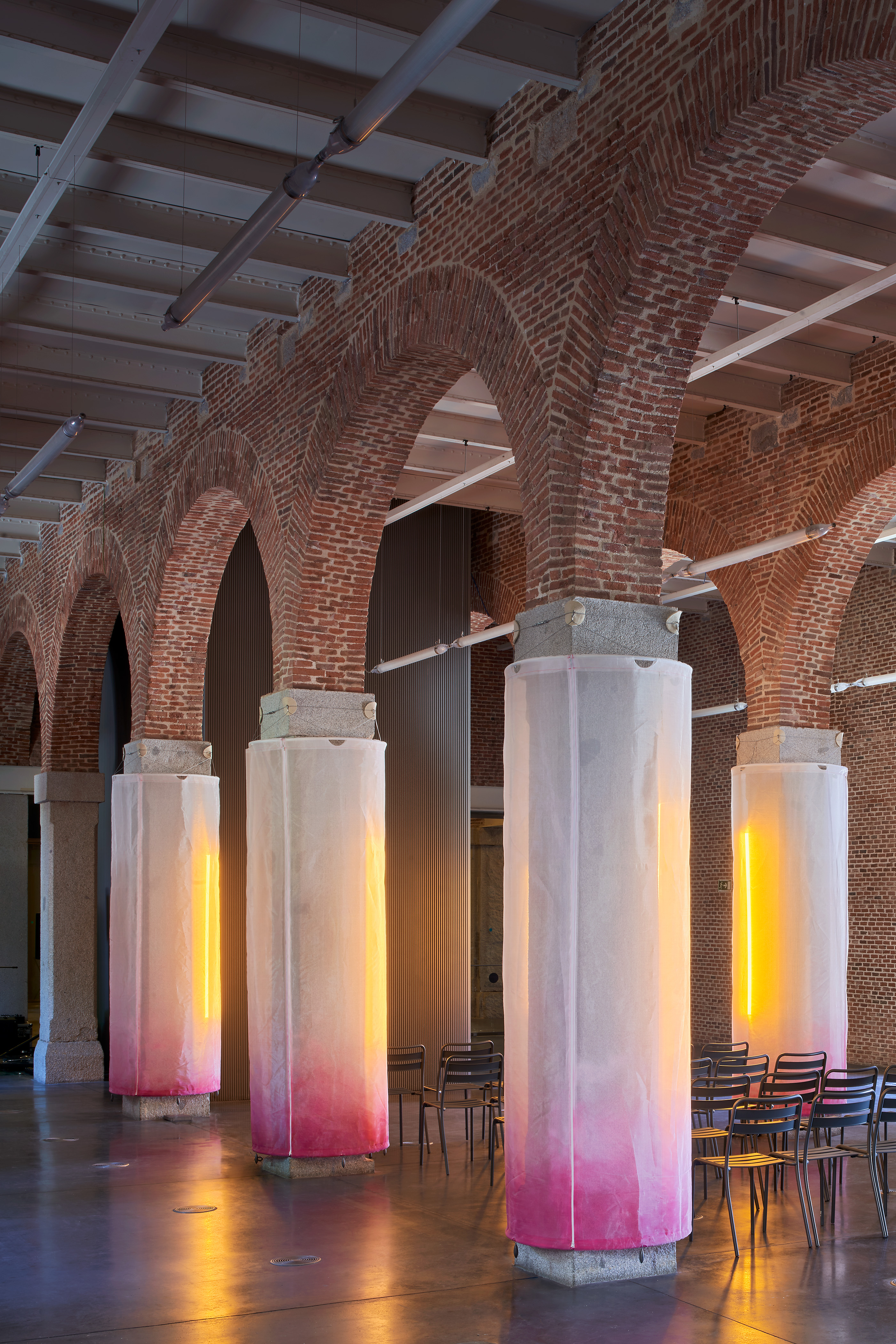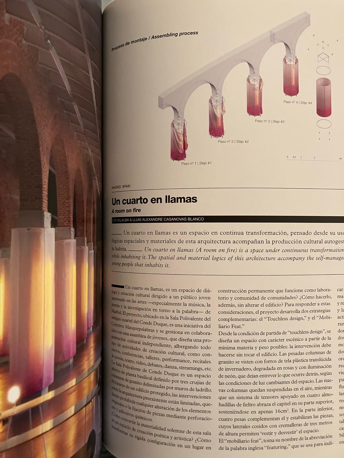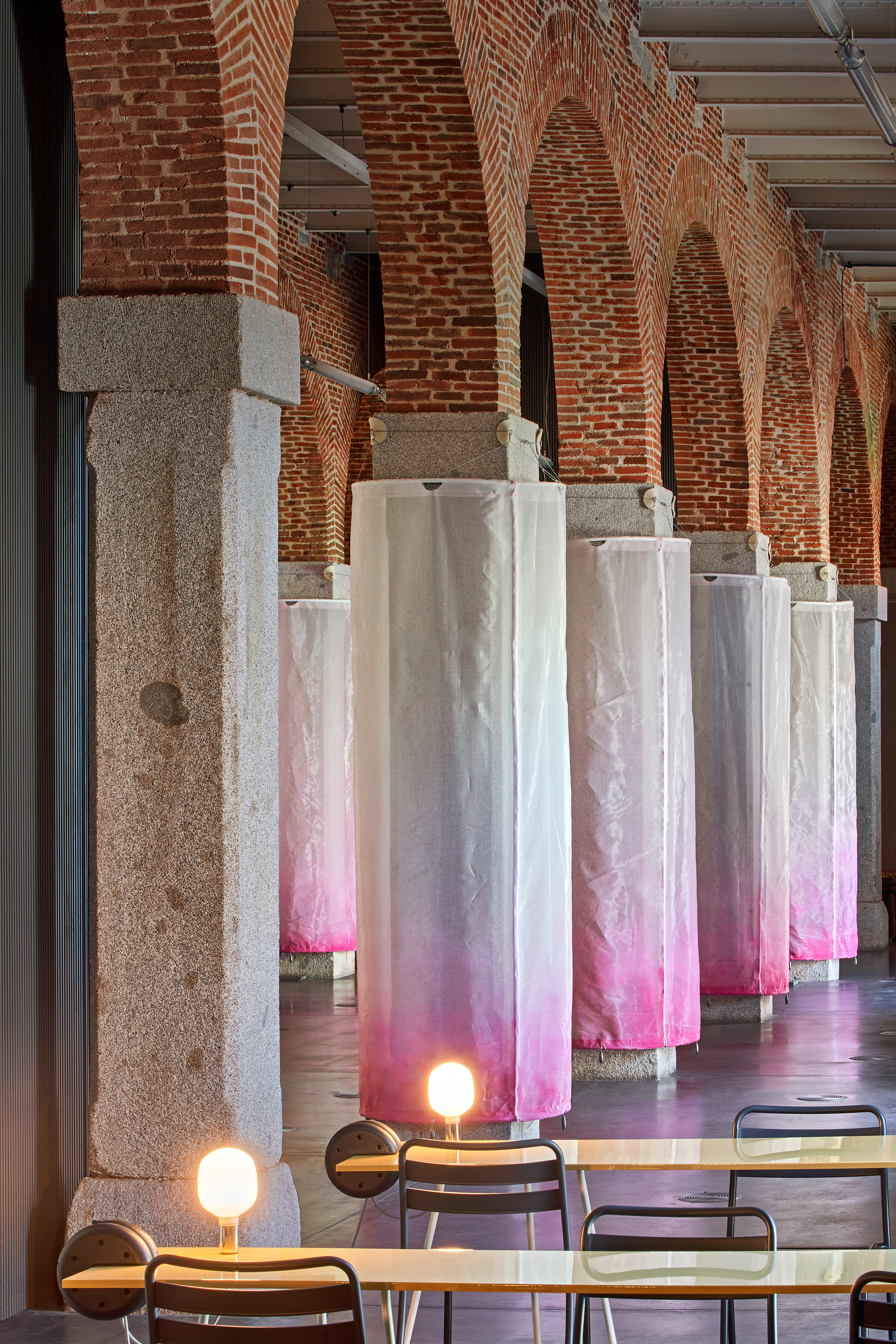 Un Cuarto en Llamas was developed at the Sala Polivalente (Multipurpose Room) of the Conde Duque military barracks. The Sala Polivalente at Conde Duque is an open space with a basilica-like floor plan defined by three bays of granite columns, delimited by brick walls. As it is a listed building, all interventions on the pre-existing architecture are limited, prohibiting any alteration of the original elements or the mounting of pieces employing holes or chemical adhesives.