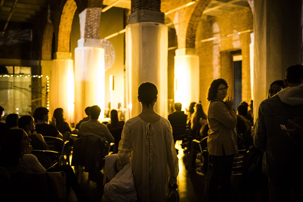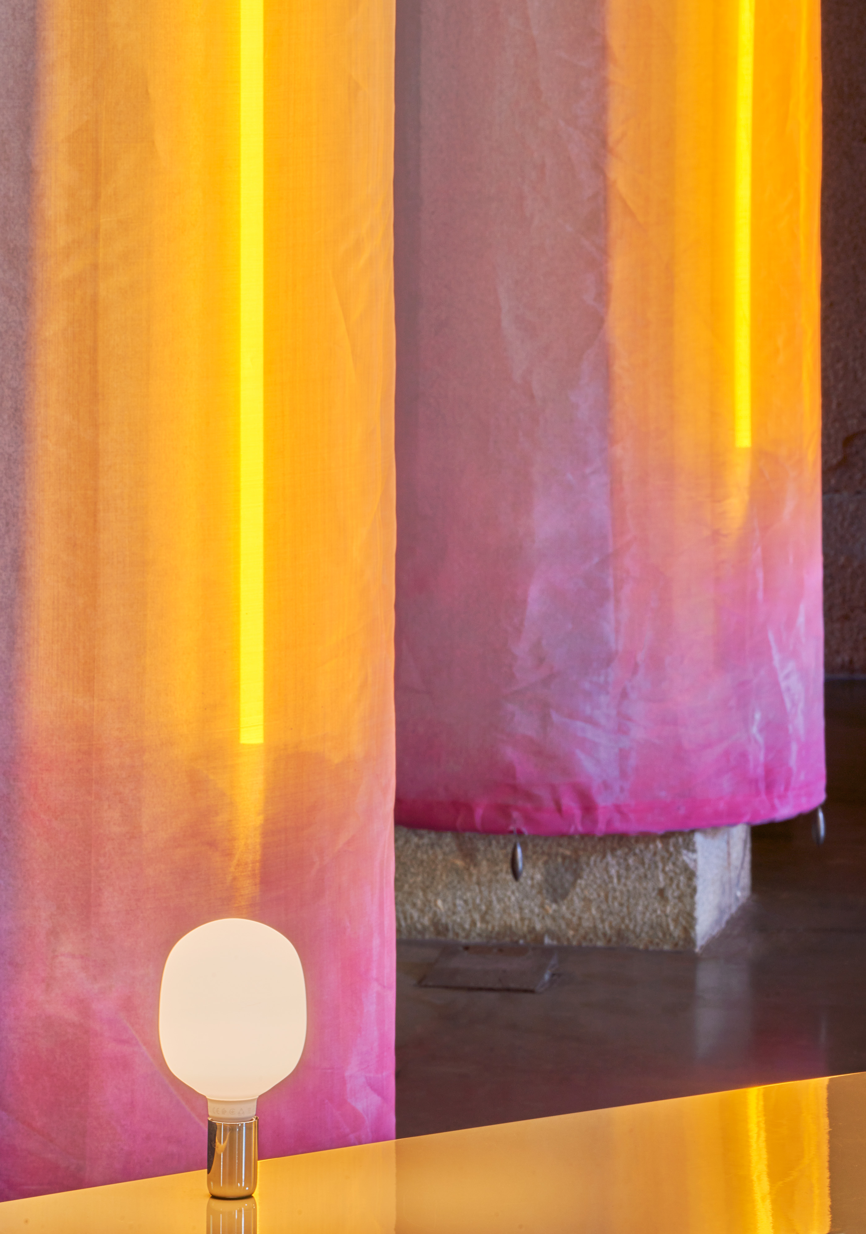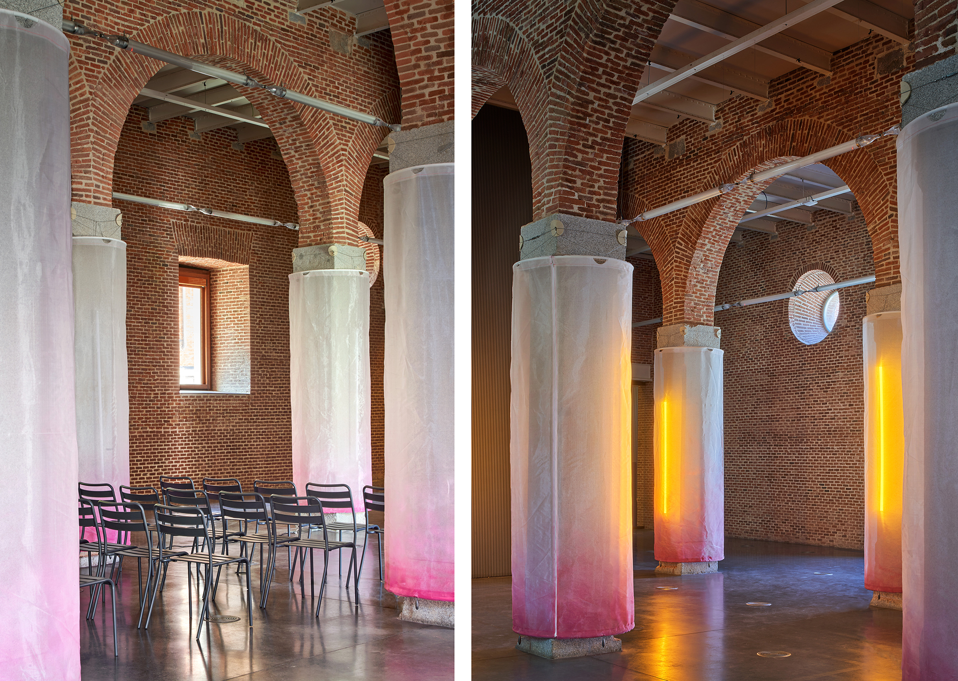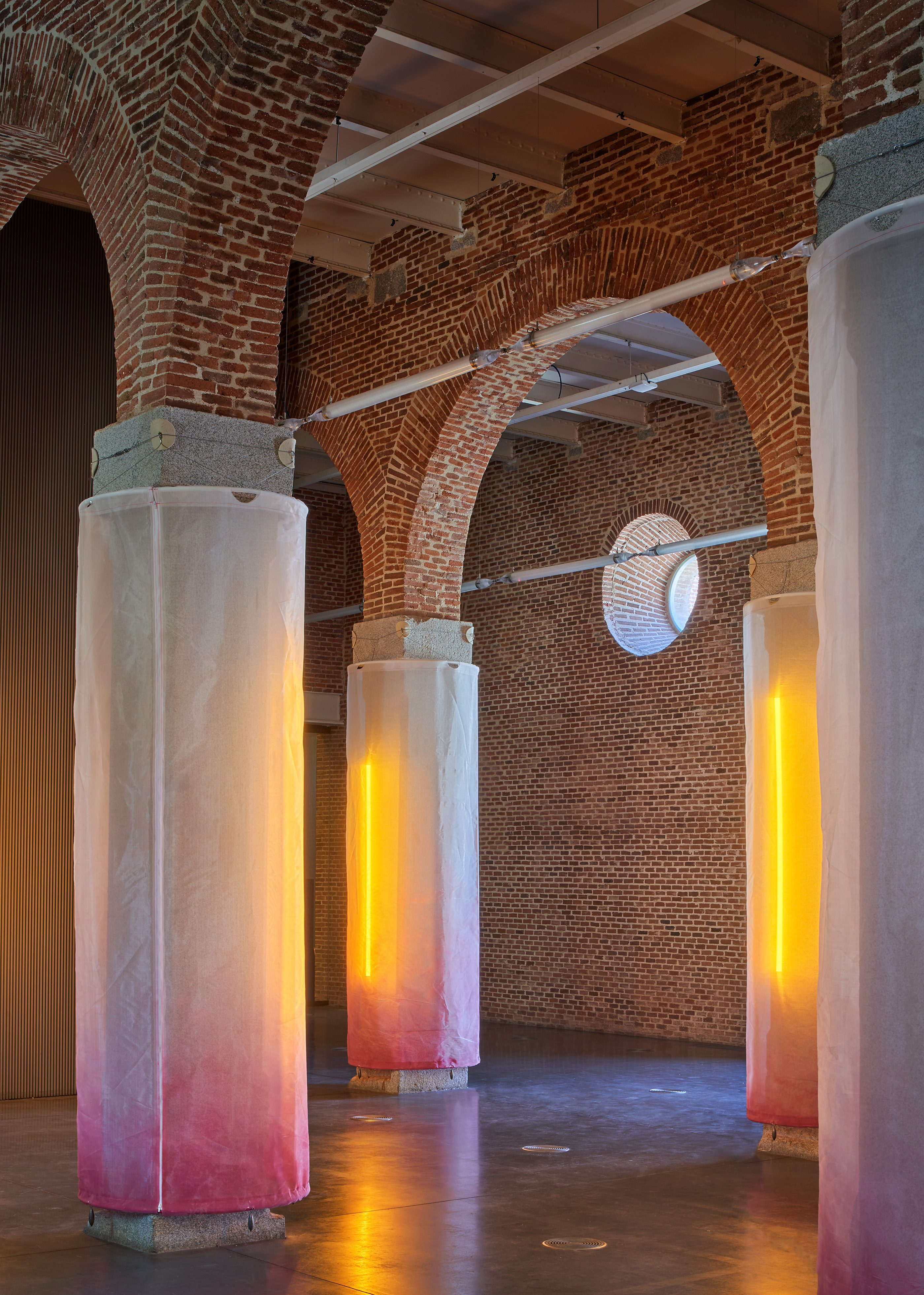 Un Cuarto en Llamas was developed at the Sala Polivalente (Multipurpose Room) of the Conde Duque military barracks. The Sala Polivalente at Conde Duque is an open space with a basilica-like floor plan defined by three bays of granite columns, delimited by brick walls. As it is a listed building, all interventions on the pre-existing architecture are limited, prohibiting any alteration of the original elements or the mounting of pieces employing holes or chemical adhesives.