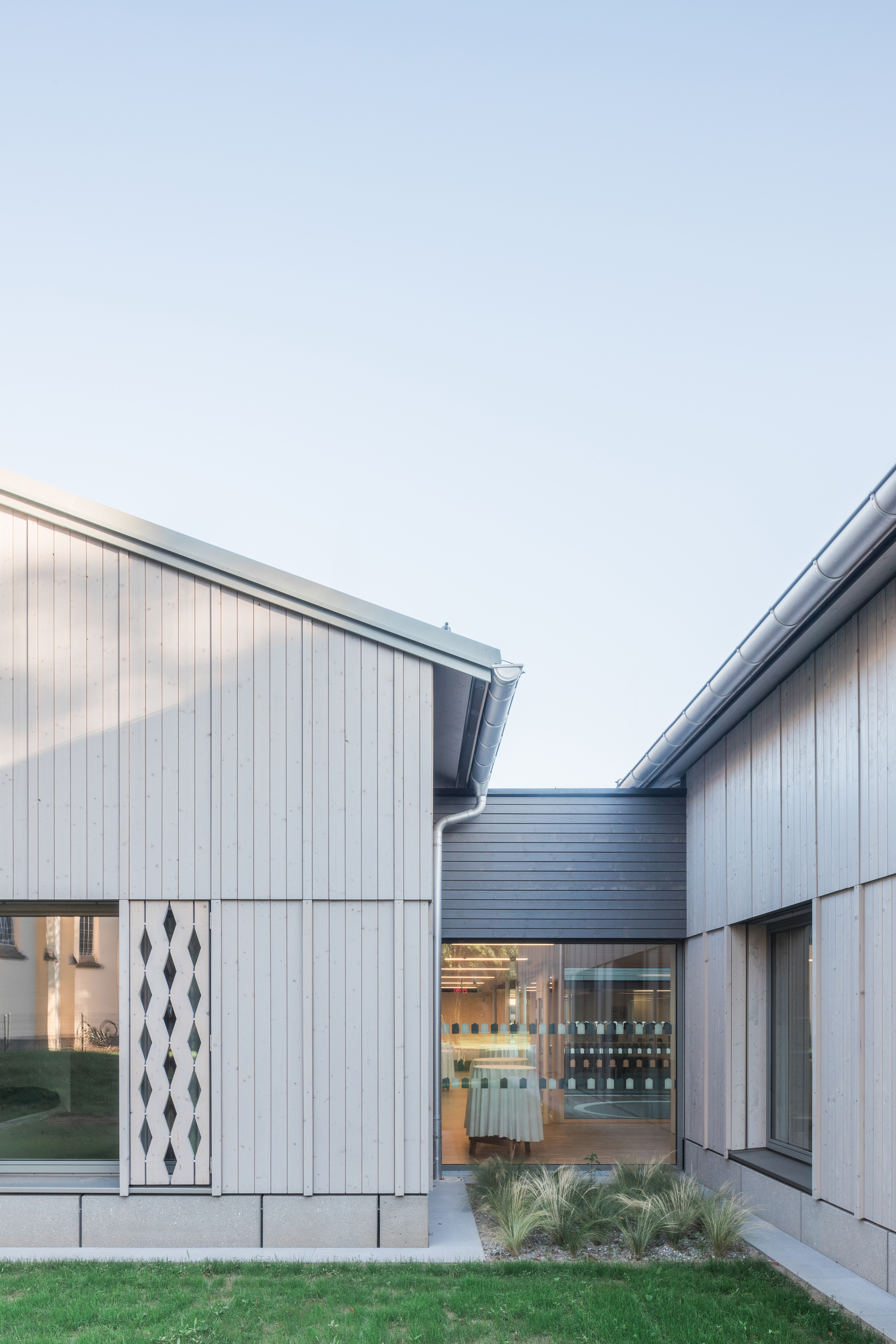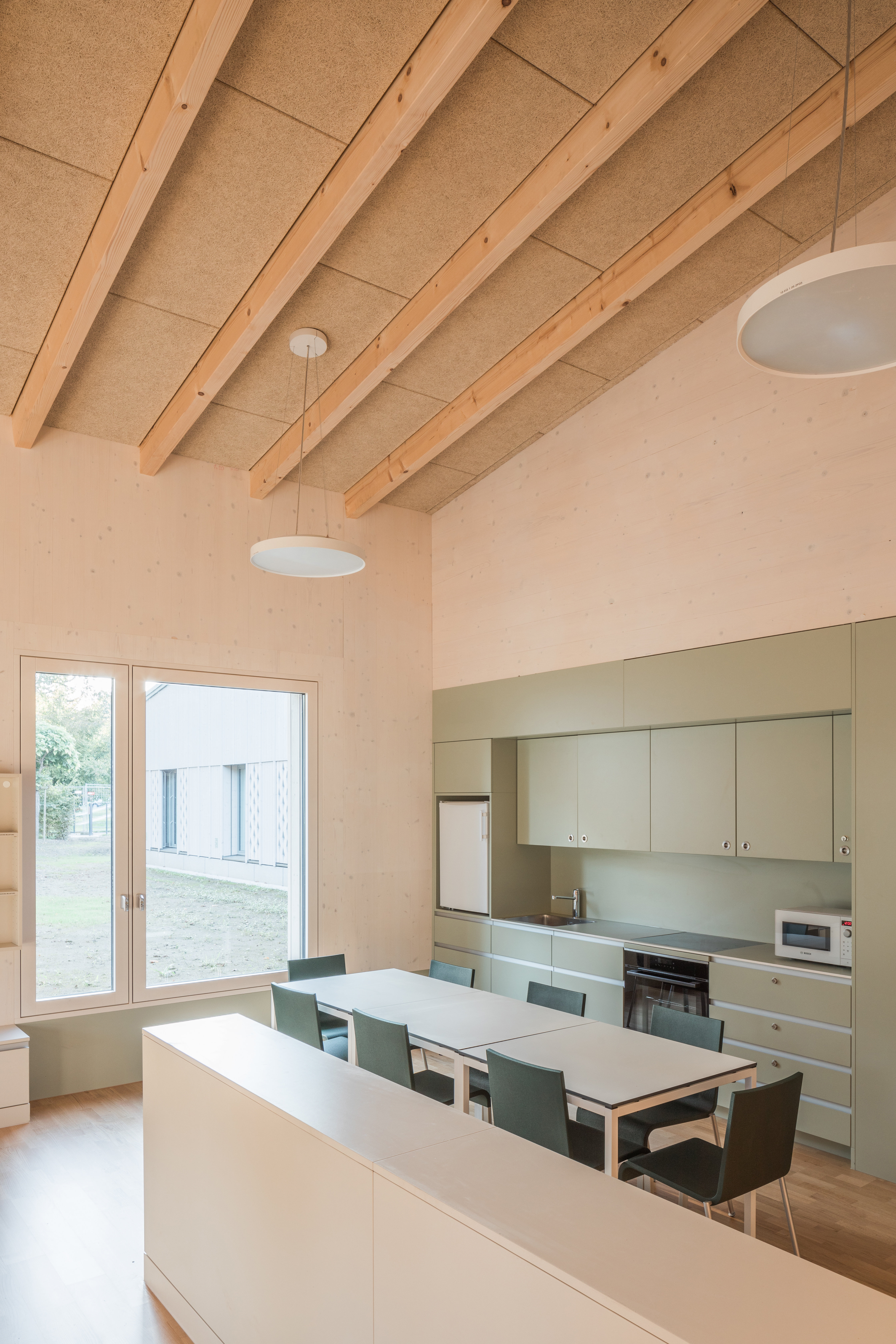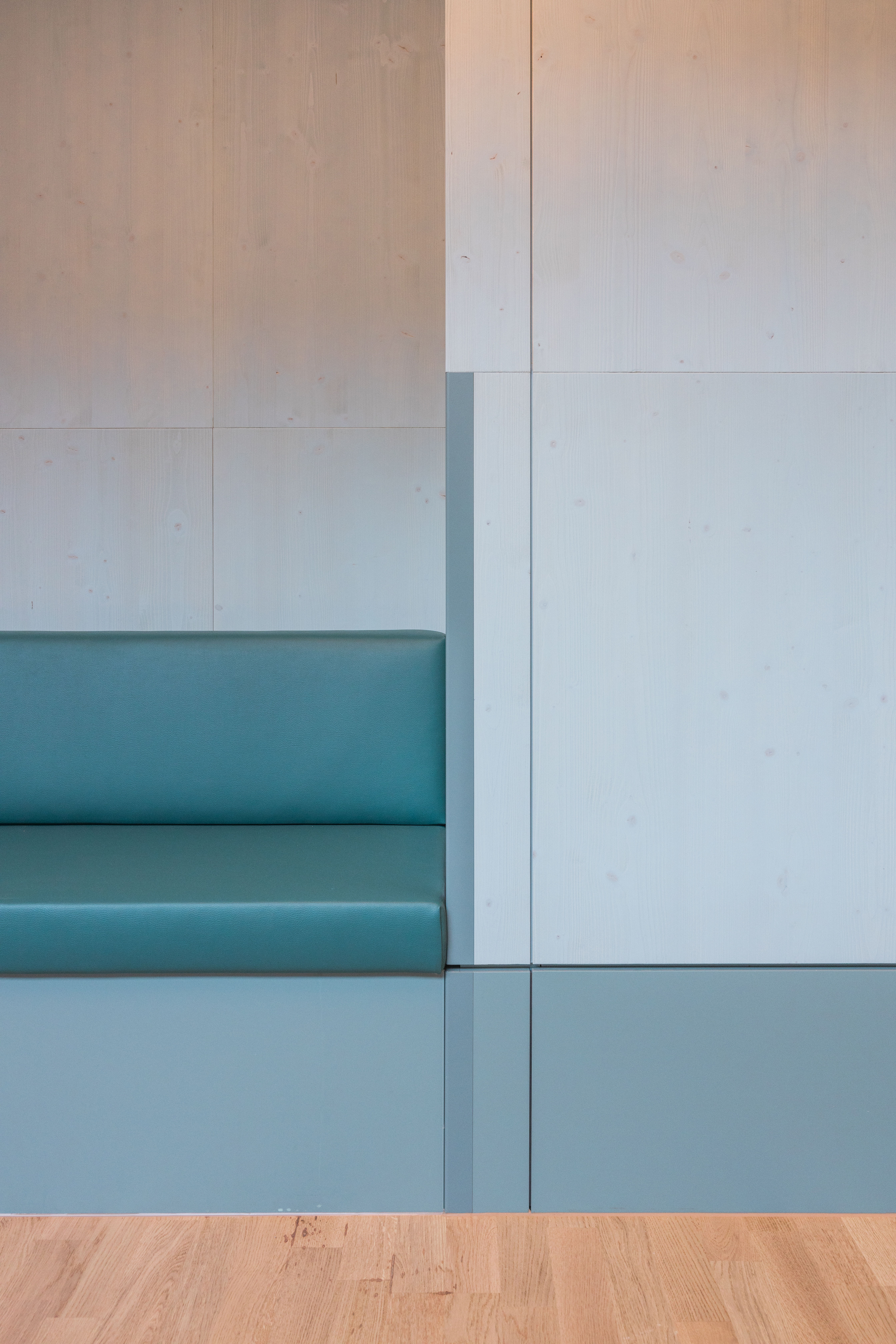 The solid timber construction of the extension suits psychiatry due to its short construction time, warm atmosphere from wooden surfaces and high precision detailing. This breaks the cold, sterile stereotype of hospitals.