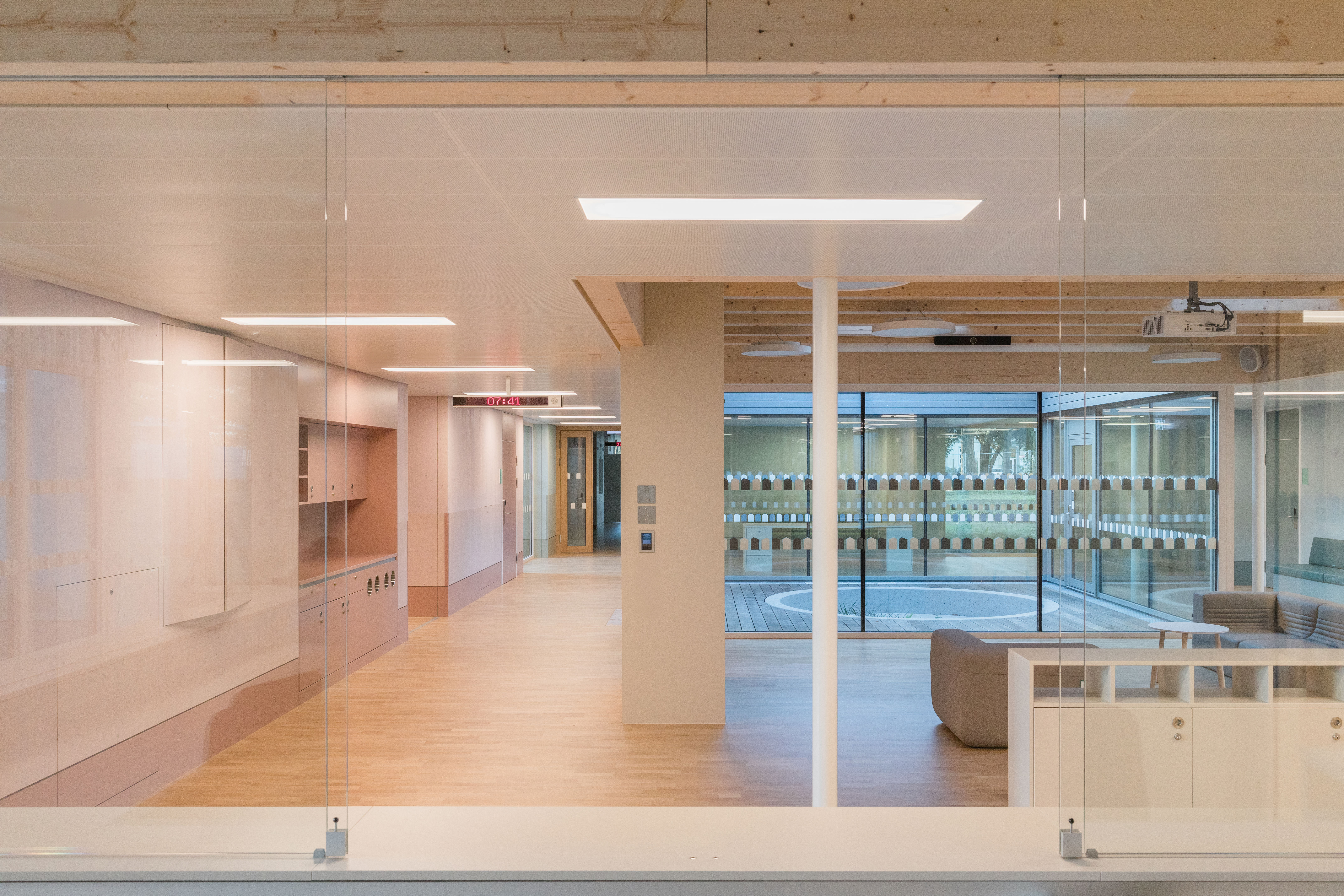 The new Child Psychiatry emphasizes integration with the surrounding environment and a human-scaled design. The building features a low-threshold access forecourt that transitions into an open, gallery like entrance. The design prioritizes a sense of community, with patient-, common-, and staff rooms grouped together. Five “houses" are centered around the "village square" fostering a warm and inviting atmosphere. The main use of timber has positive effects on the environment and CO2 reduction.