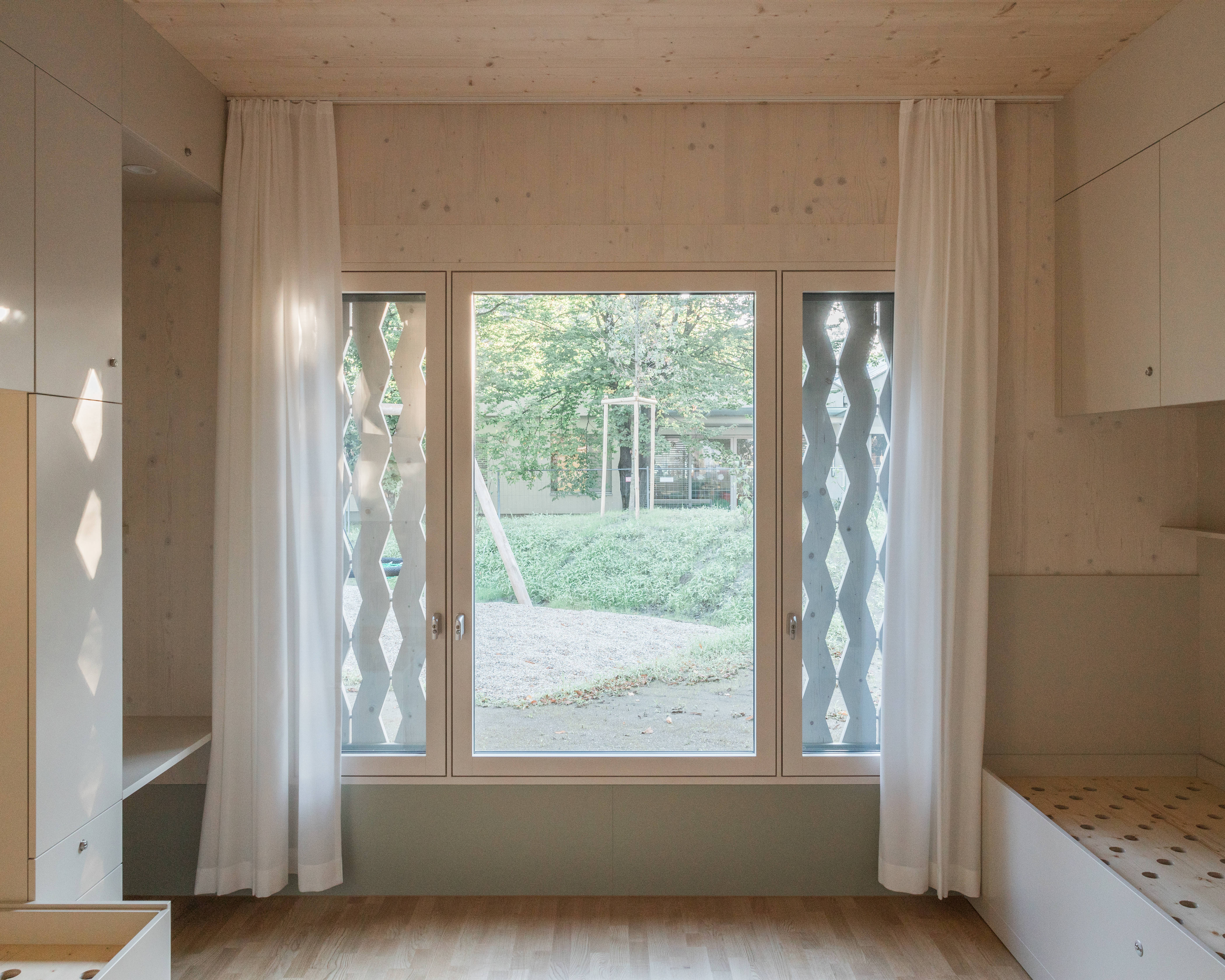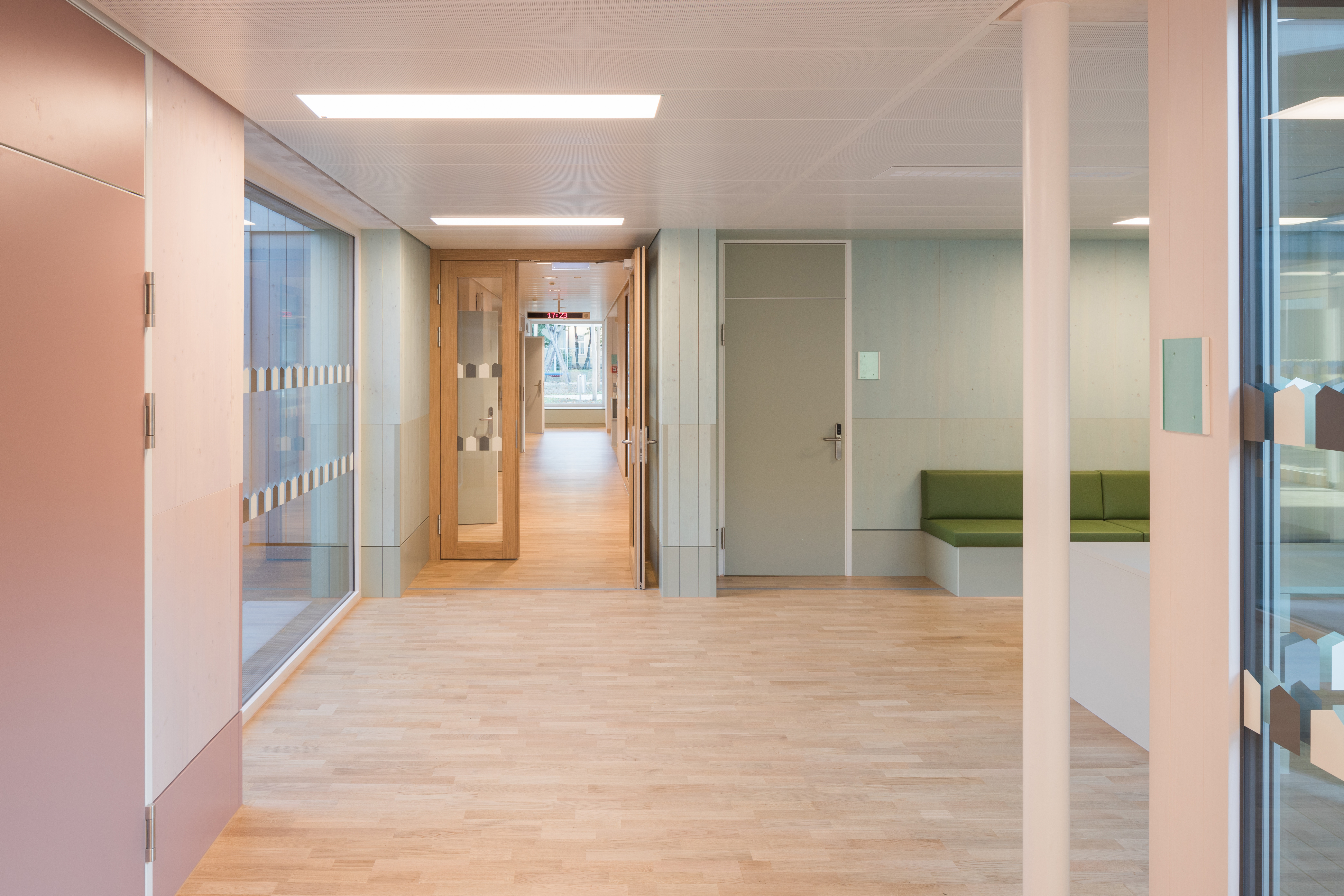 The design of adolescent psychiatry must balance retreat and protection with surveillance and control. The extension creates clear thresholds from the public forecourt to the intimate retreat of the patient’s bed. Views through and out, as well as the position of the nursing station enable subtle surveillance, good orientation, retreat and community. The design emphasizes an atmosphere appealing to all senses, counteracting the stigmatization of psychiatry with inviting ease, sense of security, openness and transparency.
