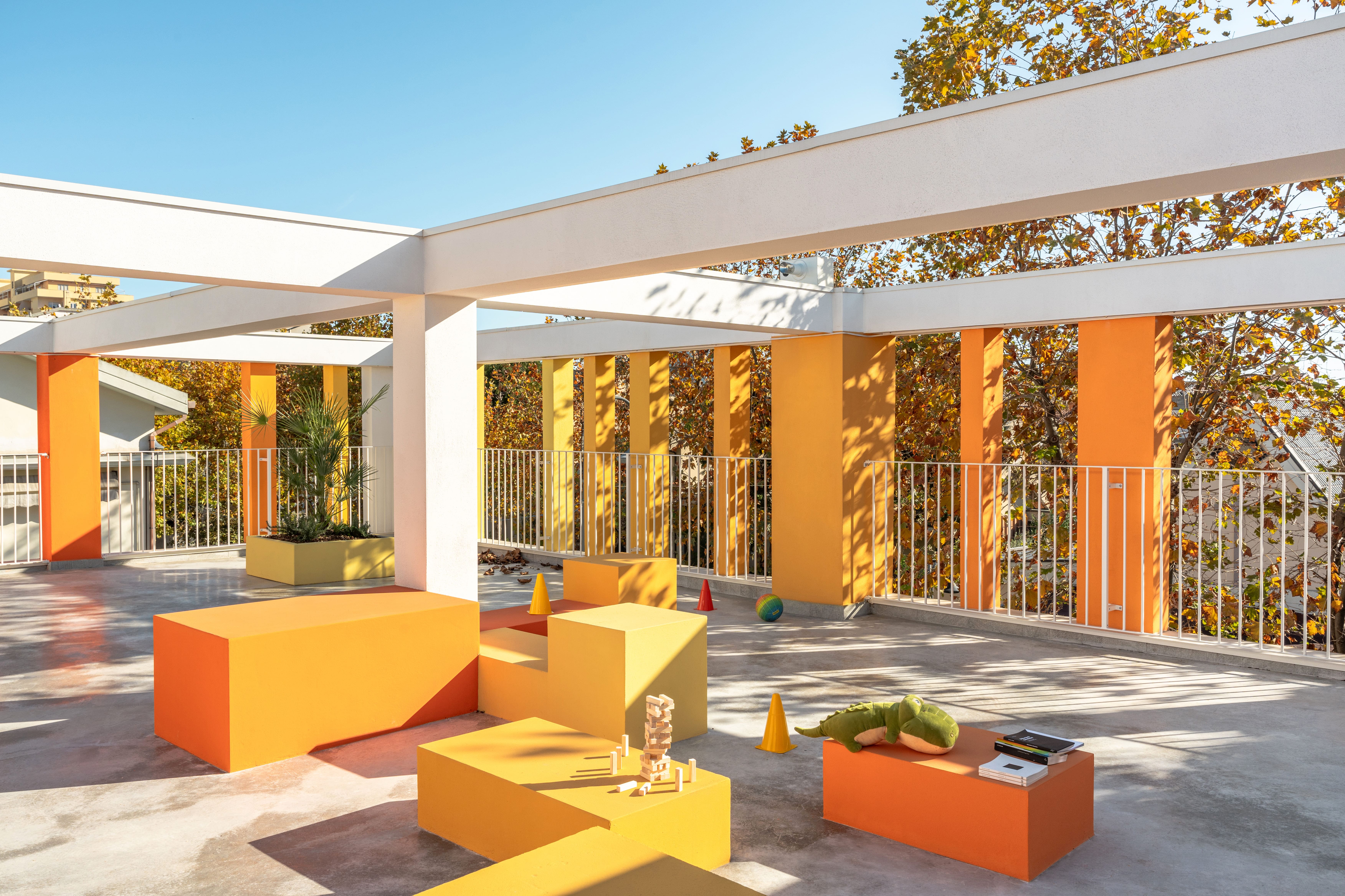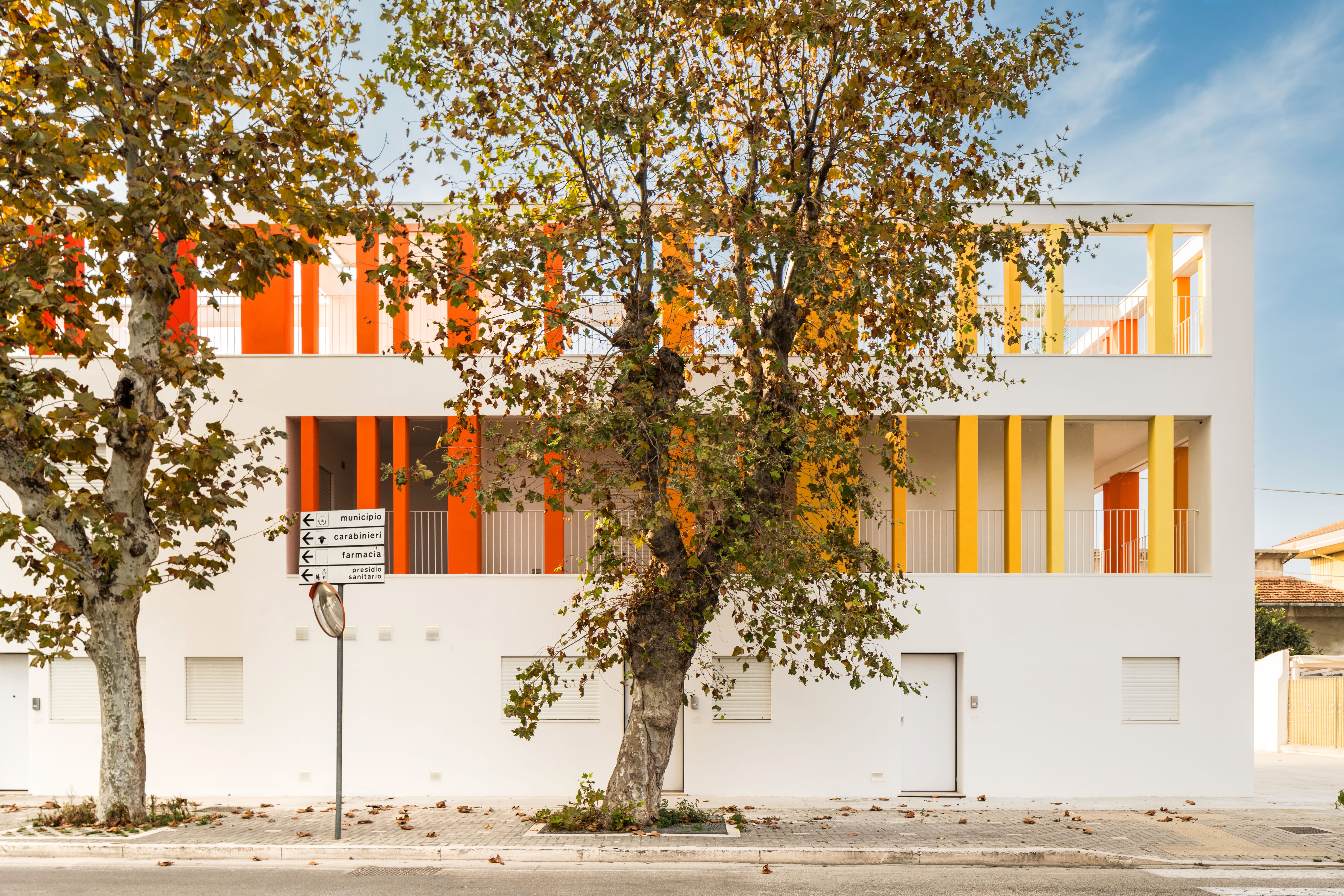 The morphology of the architecture aims to give an urban and social dimension to the living spaces. It is a neighborhood space that is permeated by the neighborhood dynamics. The main volume is compact and emptied at the roof to accommodate the suspended square. This urban and intimate space welcomes spontaneous uses and more structured moments of conviviality. The roof is equipped with elements for play and relaxation, for music and entertainment and it is a hybrid space for residents and for the neighborhood. The roof hosts various music, play and sports initiatives. It is a new centrality where relationships, meetings and conversations can be built. The layout is open and multifunctional. The space is changeable. The use of these common spaces shapes the architecture adapting it to the evolution of the community. With a bright shade that goes from yellow to red, the new volume reinterprets the theme of social housing and redefines the concept of living together. It is a hybrid and porous architecture that changes according to the community's requirements. The building generates a linear color code in continuity with the existing buildings. This color code adds a distinctive visual touch and also creates a play of light and shadow that animates and designs the external spaces, both on the facade and on the roof. The interaction between colors and architecture is designed to promote a welcoming and stimulating environment for the community, giving a new identity to the neighborhood and the urban landscape.