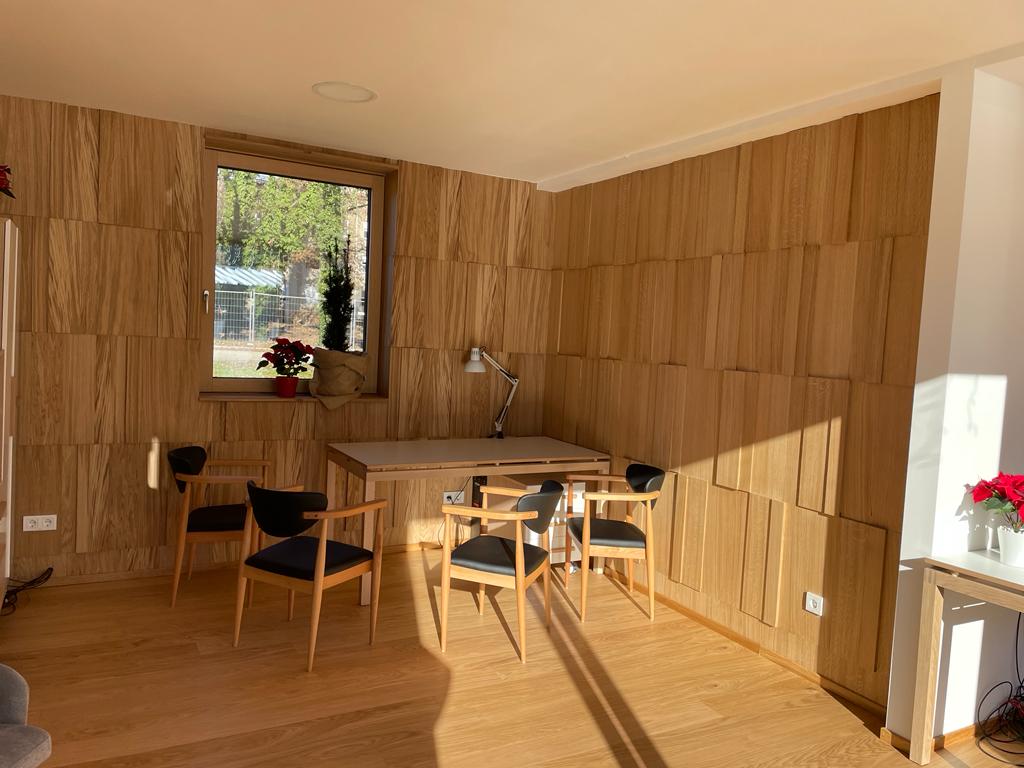 The growing impact of climate change and environmental issues indicates that the planet is approaching the limits of its sustainability. As a result of developing an innovative product from reused or recycled material, the emission of harmful greenhouse gases (GHG), which are the main cause of the greenhouse effect, will be reduced. On the other hand, wooden products offer a natural beauty that enhances the visual appeal of any space thanks to the unique grain patterns and texture which add character and warmth to interiors, allowing it to be used in both traditional and modern design styles. For the development and optimization of the wooden wall, we conducted industrial research in veneer production, tested the properties of wood materials and their impact on sandwich construction, investigated the thermal and acoustic properties of the developed sandwich panels, and the durability of the developed products in exterior and interior environments. The project resulted in the development of new practices that enable the production of innovative wood products, which is a prerequisite for the production of more complex products, currently unavailable in many wood industry factories. The project developed a modular wall cladding with a high content of waste oak veneer and modular partitions and load-bearing walls with a significantly higher content of wood residue, as this creates a better carbon footprint and greater well-being with natural beauty that enhances the visual appeal of any space. The final result of the project is a modular wooden wall cladding and sandwich construction, i.e. wall (partition and load-bearing), presented and integrated into the experimental bungalow, creating a design object that becomes attractive due to its elegant appearance. Finally, project results – the experimental bungalow has been already presented via open days, international conferences and media like TV.