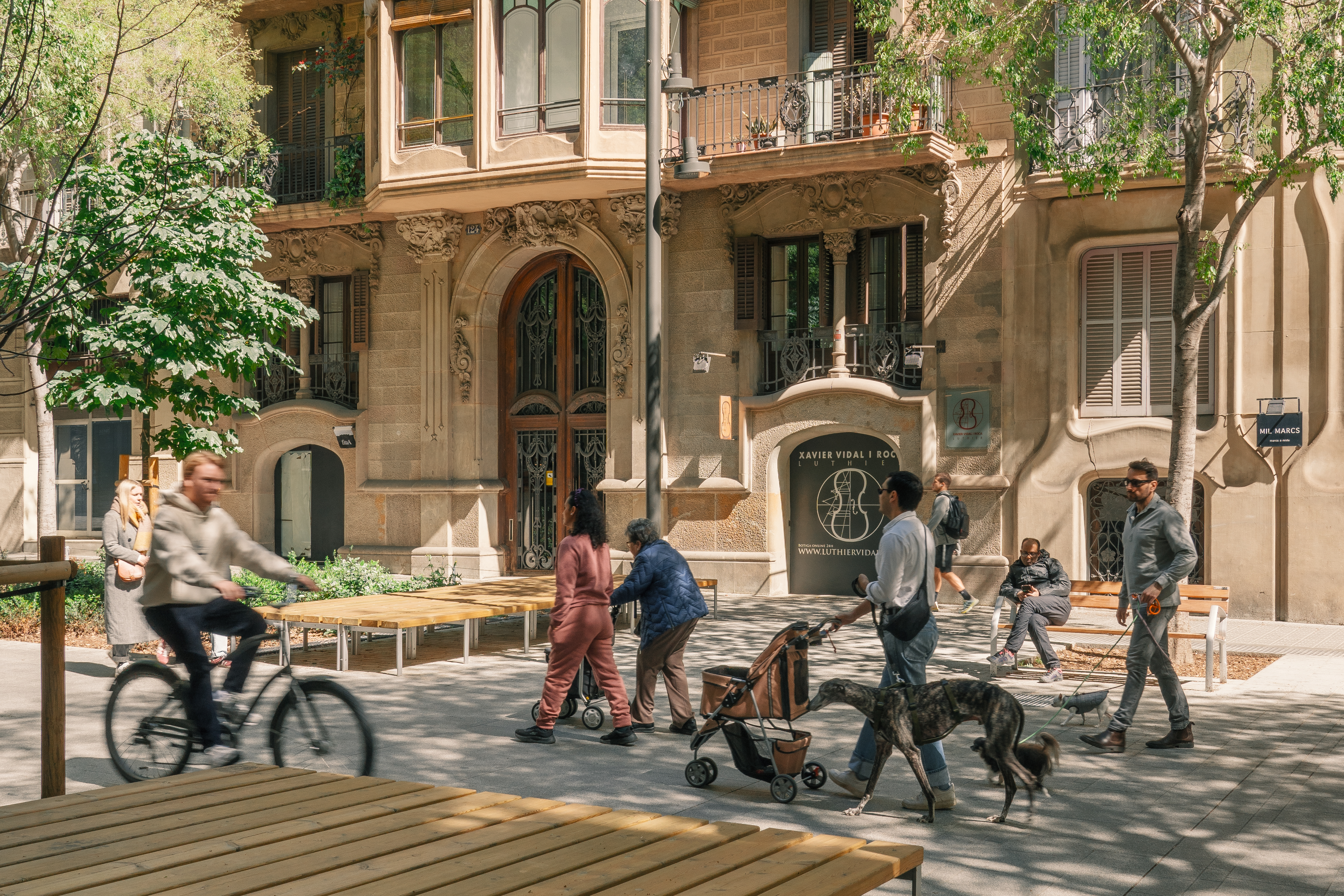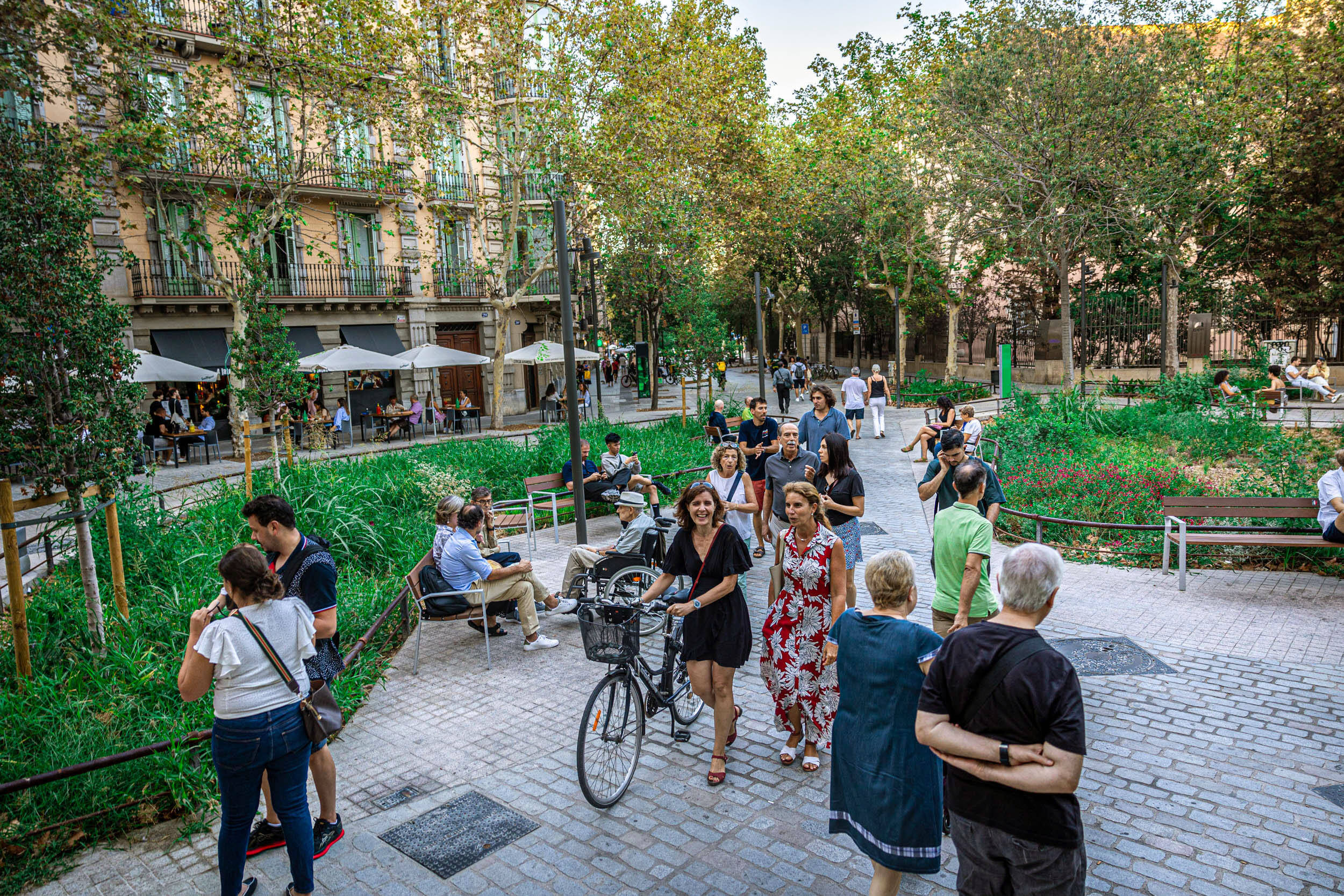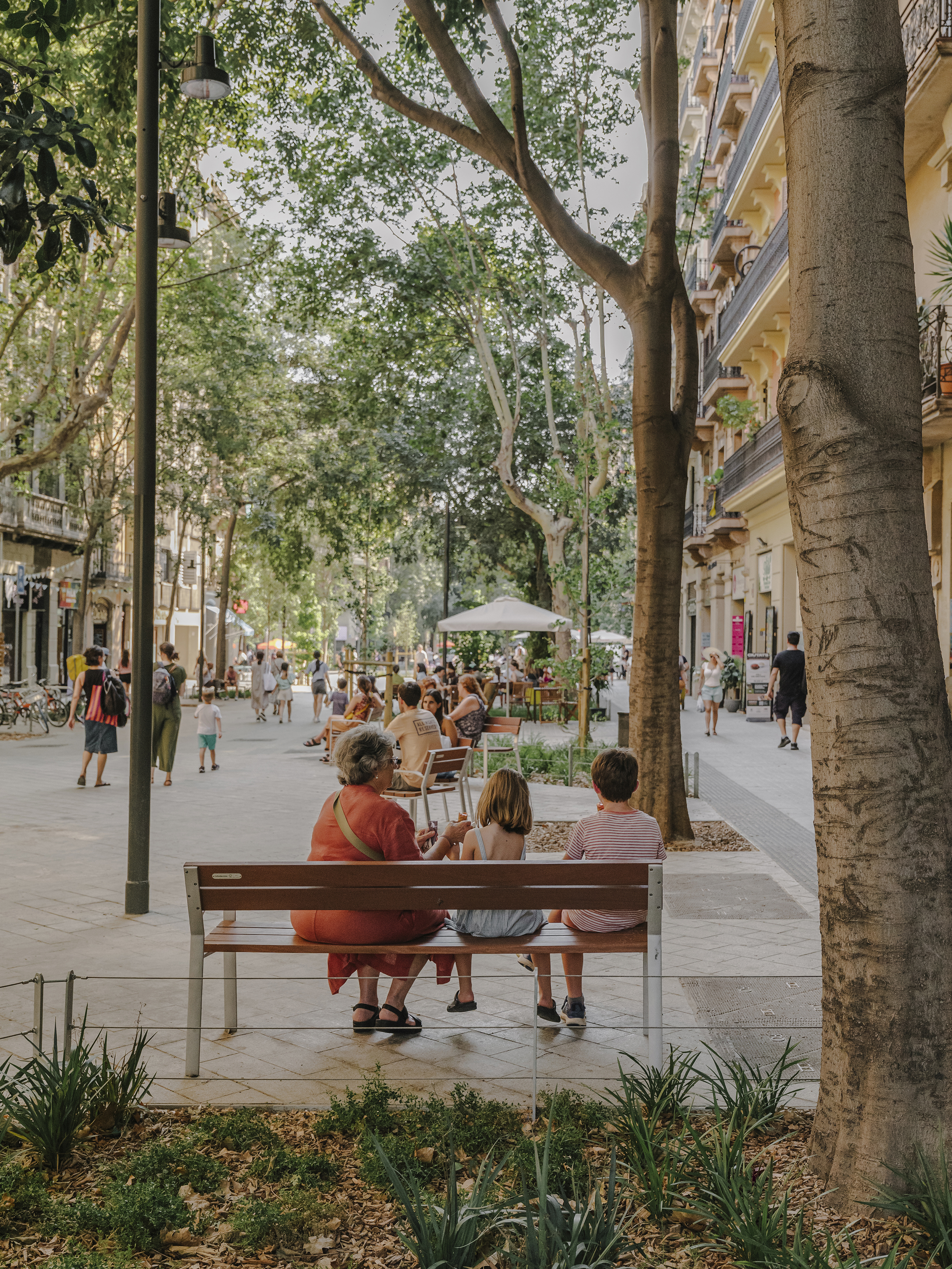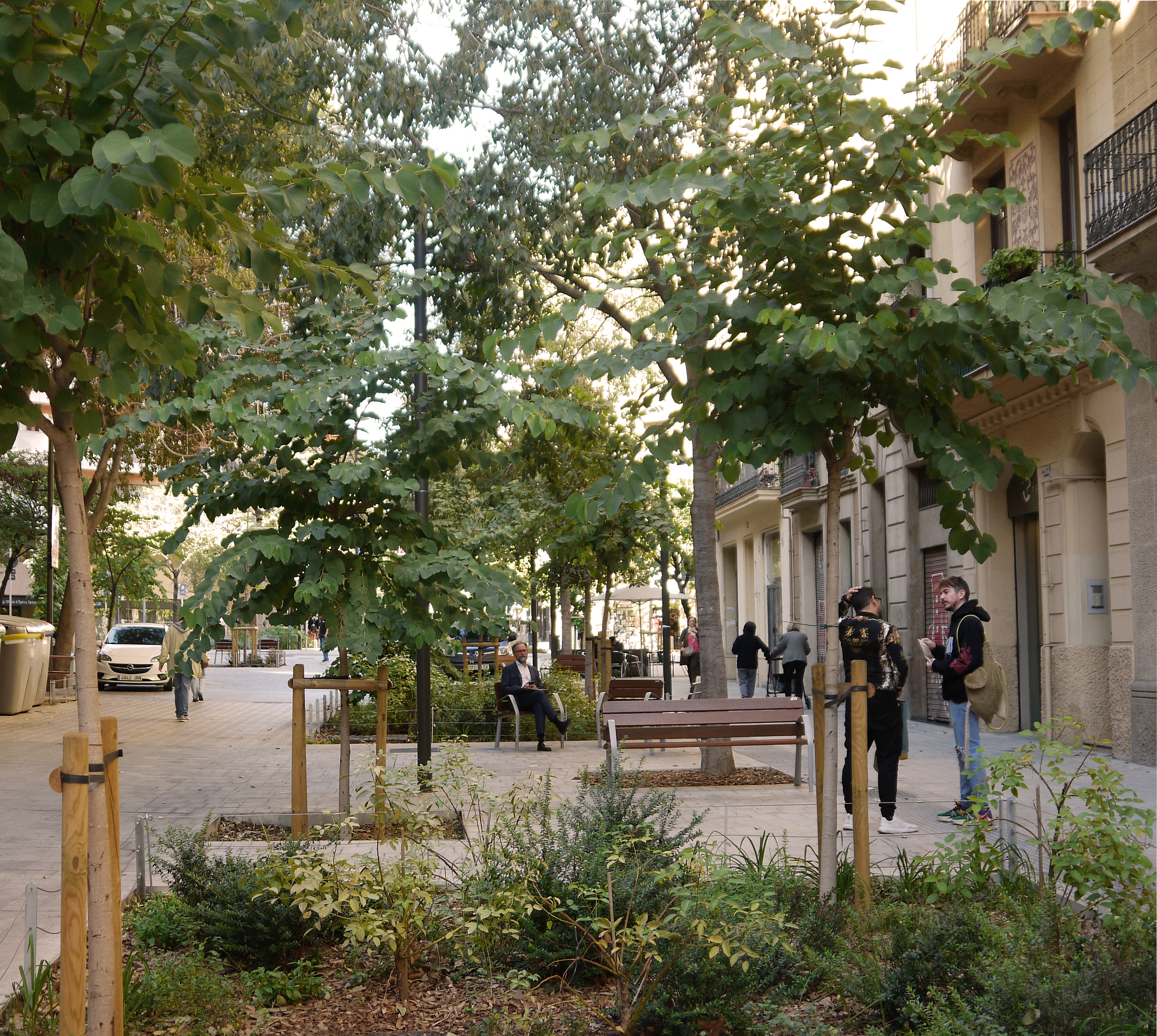 Today's streets need to be redefined as public spaces; as habitable places; as community spaces; as an extension of housing territory; as a space for games, greenery, history and local life of neighbourhoods. Streets have to go back to being guarantors of vitality throughout the entire urban fabric, to creating opportunities for the establishment of greenery and to promoting positive community life among local residents of all ages and origins. We need to fill the city's streets with life again. The Green Spaces and Squares project in Barcelona's Eixample is the strategy used to achieve this objective. This strategy, as well as the eight completed pilot projects, has been defined with a methodology that can be replicated in other cities. In this sense, not only the projects, but the whole process is exemplary and is aligned with the cultural, social and aesthetic values that the New European Bauhaus promotes.This experience has already become a new urban order, constituted by an integrated network of relationships that highlights neighborhoods, streets, buildings and current activities, promotes the recovery of public space and a sustainable mobility system. The lives of citizens are also changing, thanks to better access and the promotion of local social relations. The completed pilot projects have become very busy and highly valued spaces from day one. For many people, benches and tables are spaces for resting and meeting. The squares have brought an unprecedented and necessary public space to Eixample, and the green axes allow something which was unthinkable, such as walking in the middle of the street.The transformation has provided a new way of perceiving the urban landscape and experiencing the public space of Eixample, which has gone from being a space for mobility only to a space for living also. In addition, the renaturation of these eight new public spaces with vegetation and soft (permeable) surfaces has improved environmental quality and biophilia.