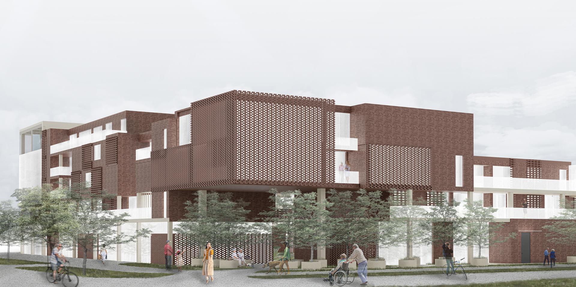 The function and functionality dictate aesthetic aspects of the design. The choice of contrasting facade materials supports wayfinding and orientation from the outdoors. The residential part of the building is covered with wooden cladding, while all services remain marked with brick. For that purpose, corners with the shared zone, the geriatric clinic and the kindergarten are also distinguished visually. Services on the ground floor are fully glazed. However, an openwork brick pattern shades places that require more privacy.