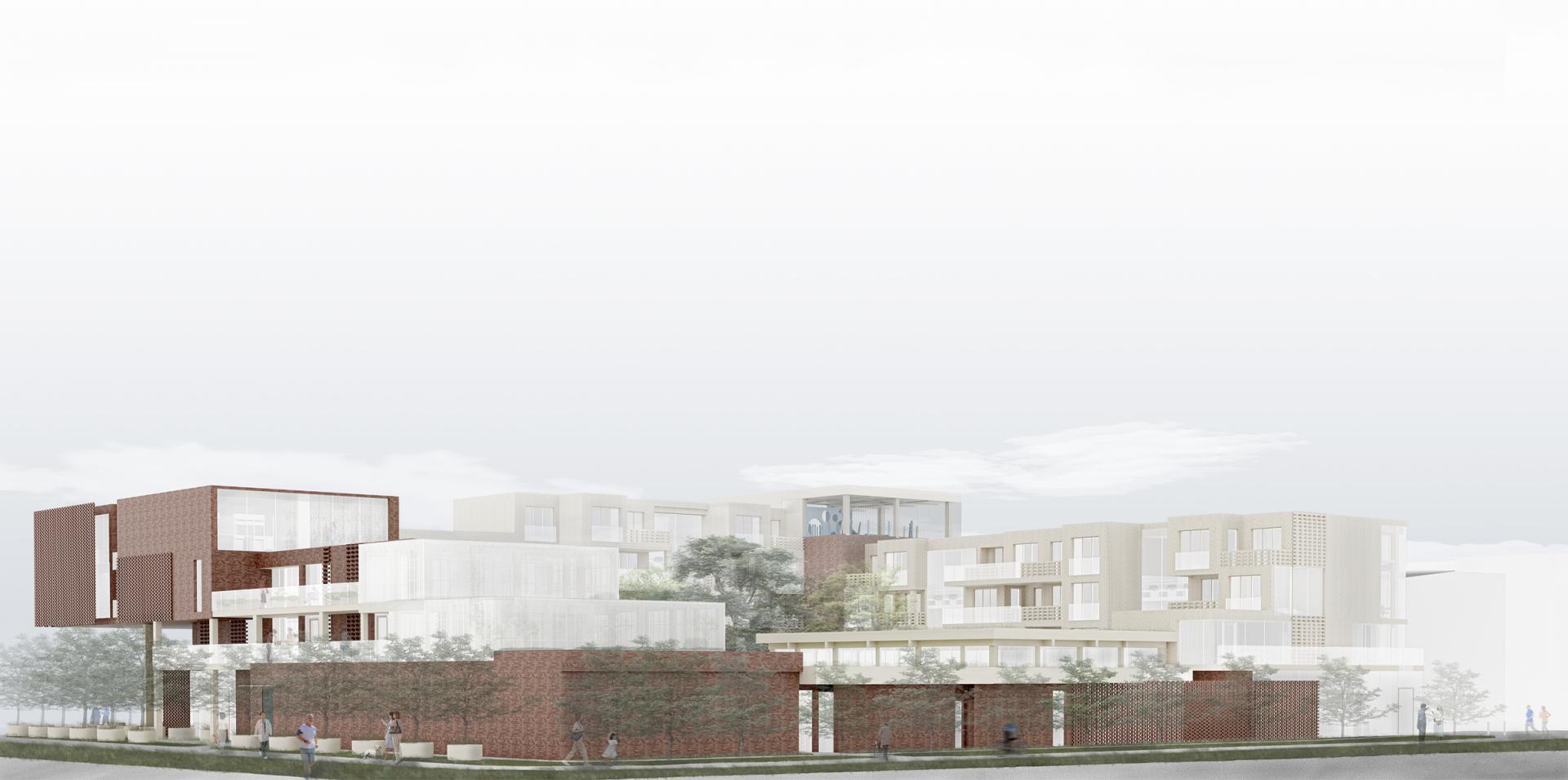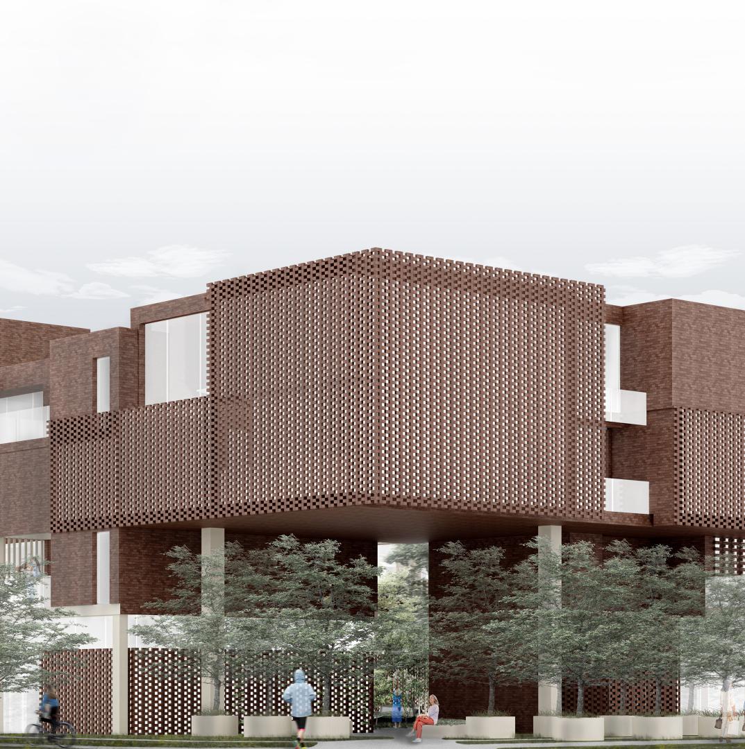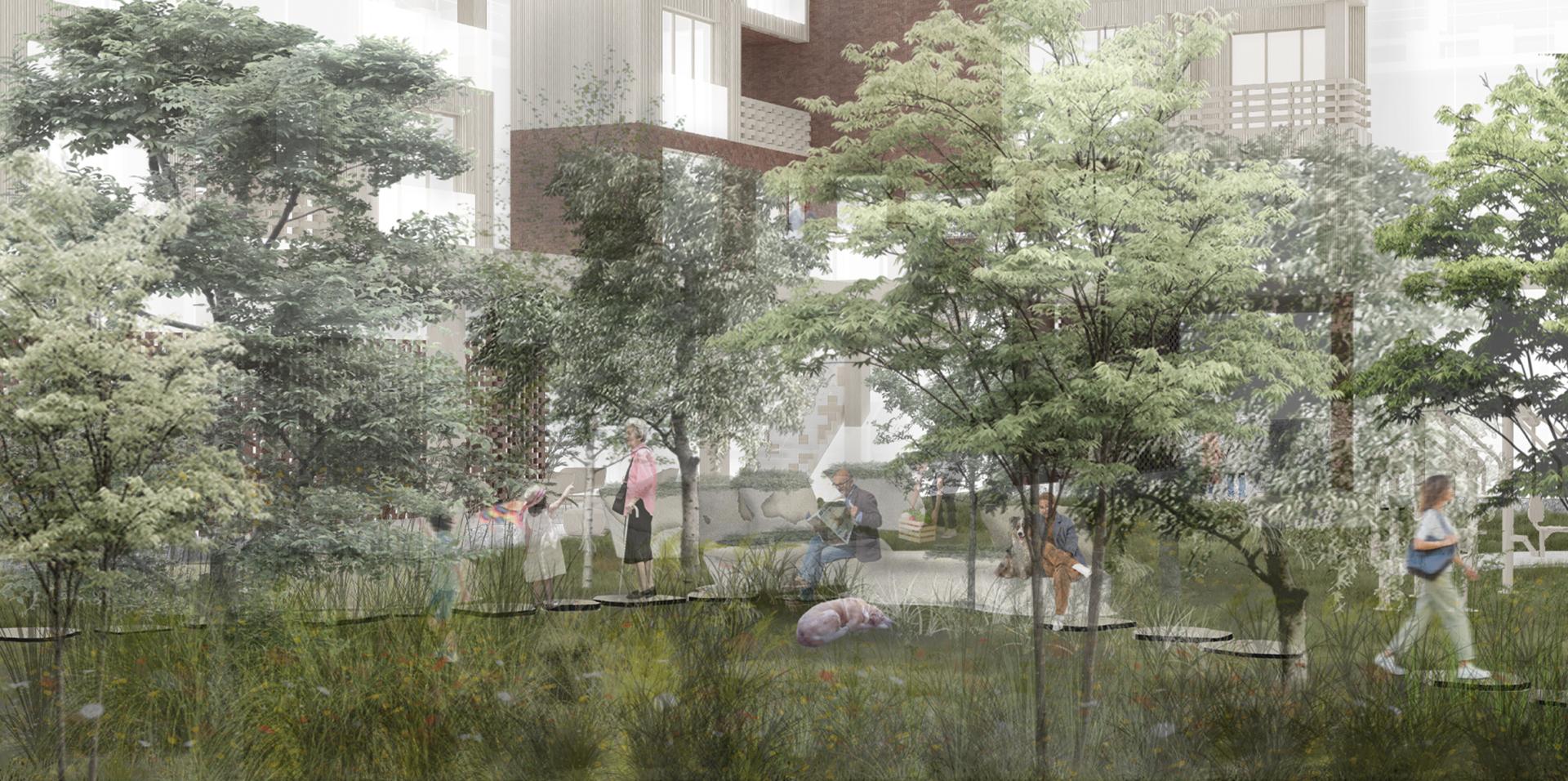 The project's sustainability lies in material usage, biodiverse landscaping and urban farming elements.