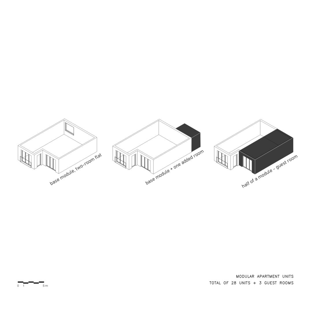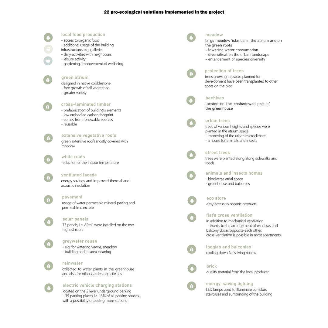 The design concept incorporates locally selected building materials, such as brick, clinker and wood. The base was to reduce the usage of concrete only for the construction of underground parking, the ground floor of the residential part and staircases cores. For all other parts, CLT is the primary construction material. Wood comes from renewable sources, has a low carbon footprint when produced locally and can be reused in a different form after the finished building life cycle. Above that, wooden construction provides good indoor thermal comfort for flats which reduces the cost of exploitation. Apartment unit design is based on the module from prefabricated elements. That can reduce water and energy consumption on the construction site by shortening the building process. Extensive green roofs with meadows and white roofs also improve indoor thermal conditions and prevent the formation of urban heat islands. For an additional energy supply, 82 m2 of solar panels are designed on the two highest roofs.