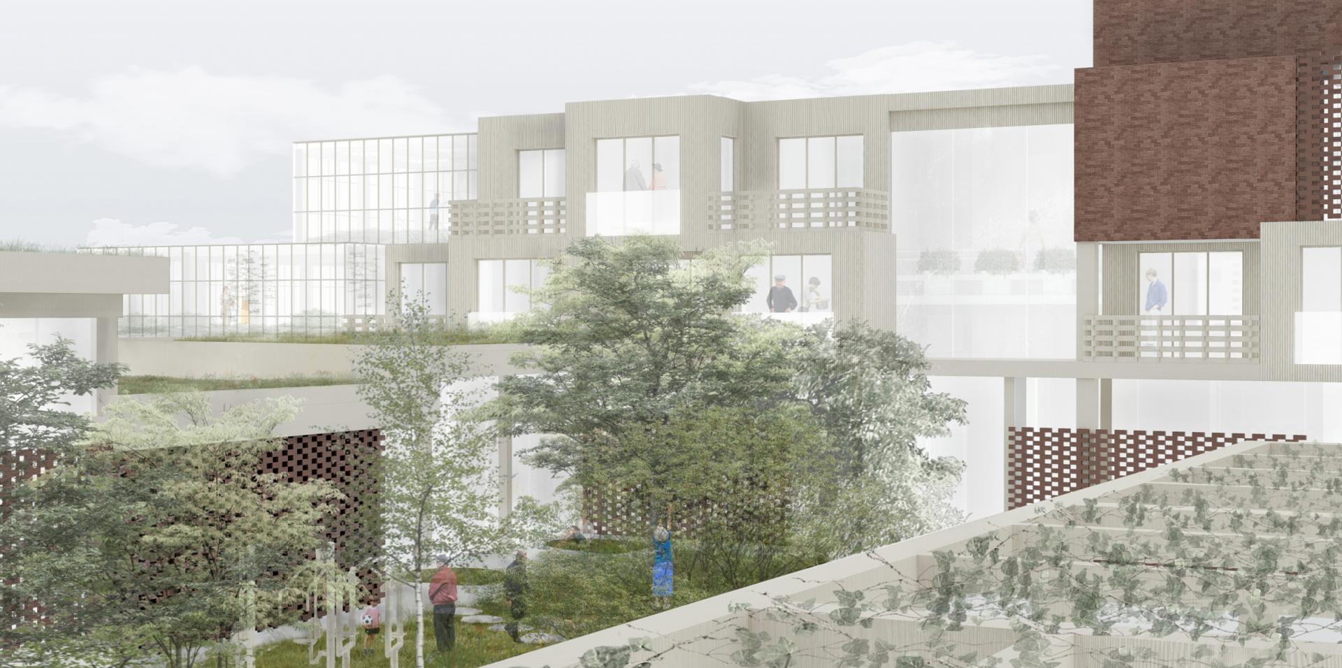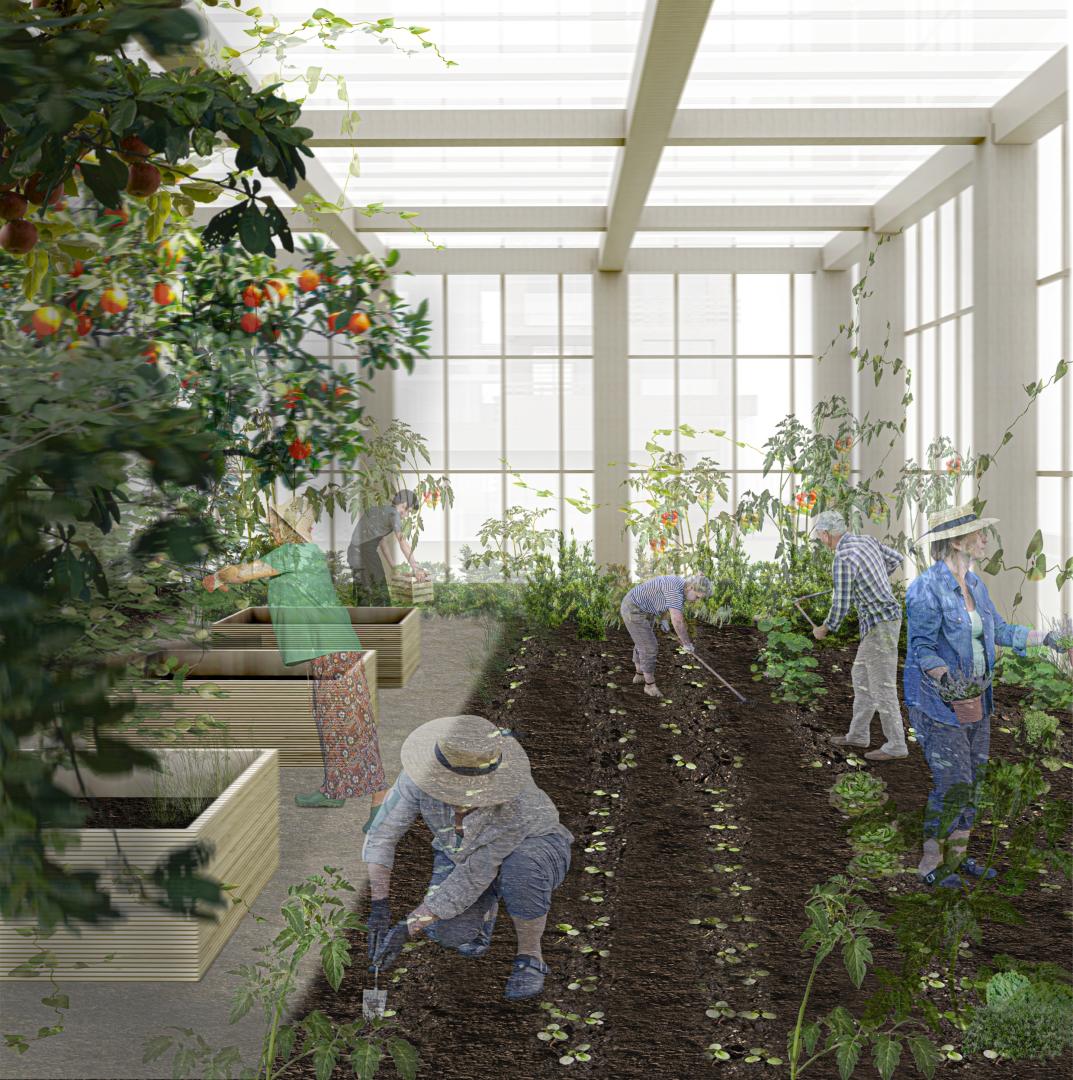 Green surroundings and urban farming elements are the base of the design's healthy living environment.