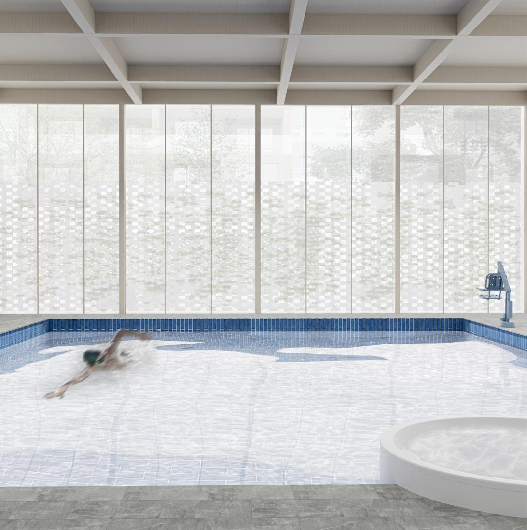 People of different ages and physical states must have equal access to each part of the building. Thus, all residents can feel included to take part in various activities. In an atrial area, there are designed gardening pots that are convenient to use and accessible for persons in wheelchairs. The swimming pool is fully accessible with a pool lift. The design of the flats is simple and spacious. The bathroom's layout allows unrestricted movement with a wheelchair.