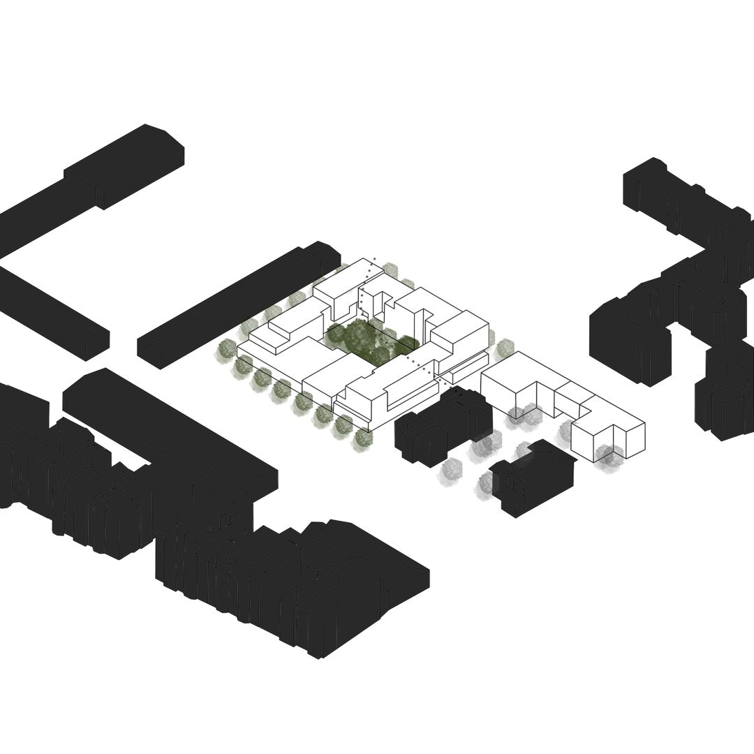 The building proposal can be portrayed as a self-sufficient urban quarter with a geriatric clinic, a kindergarten, wellness and a sports area within reach.