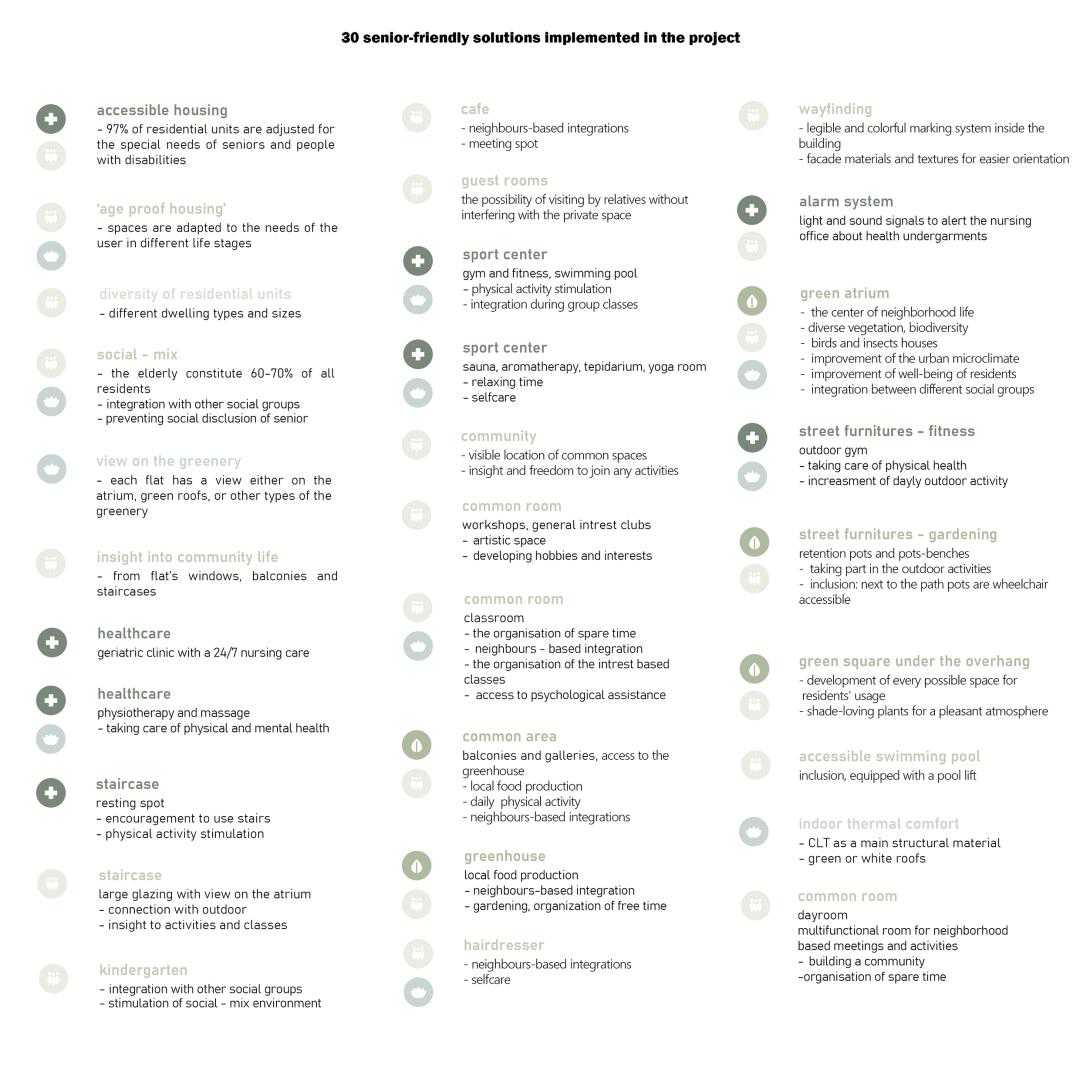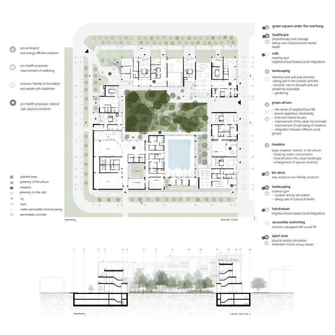 The age-friendly housing project expresses a modern approach to designing living spaces in the era of progressive ageing of societies. It aims to develop a method of planning a diverse, sustainable and age-friendly quarter in the centre of an urbanised area, where the elderly constitute 60 - 70% of all residents. The concept accommodates the needs of today's and tomorrow's seniors, who are more self-dependent, mobile and technologically advanced. The project brings solutions that promote physical and mental health, social well-being and ecological aspects. Thus, they were developed 30 age-friendly ideas and 22 pro-ecological solutions. They relate to shaping the housing space, building and maintaining relationships with neighbours, supporting healthy ageing and the independence of its residents, similarly the selection of materials used, biodiversity and the promotion of local food production.