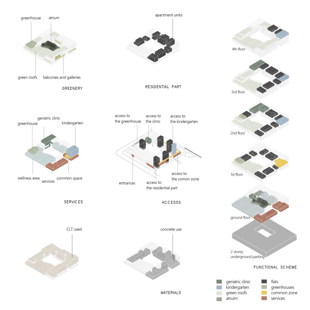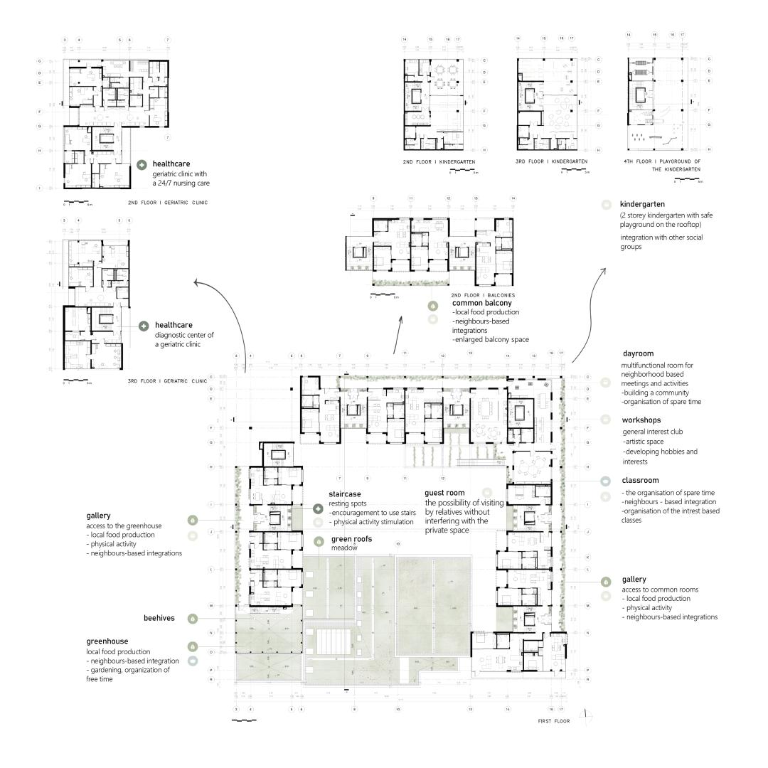 The functions of ground floor services are to answer to the needs of the neighbourhood. Three functions have major importance in this concept. A geriatric clinic with 24-hour nursing care ensures easy access to medical care. Sports and wellness centre gives the opportunity to increase the level of daily activity. A kindergarten increases the chances of interactions with representatives of different age groups.